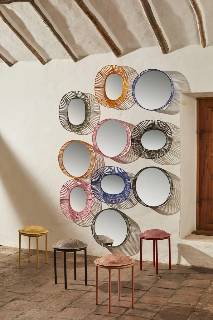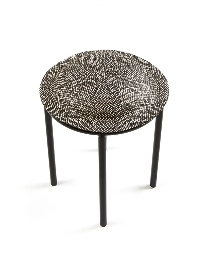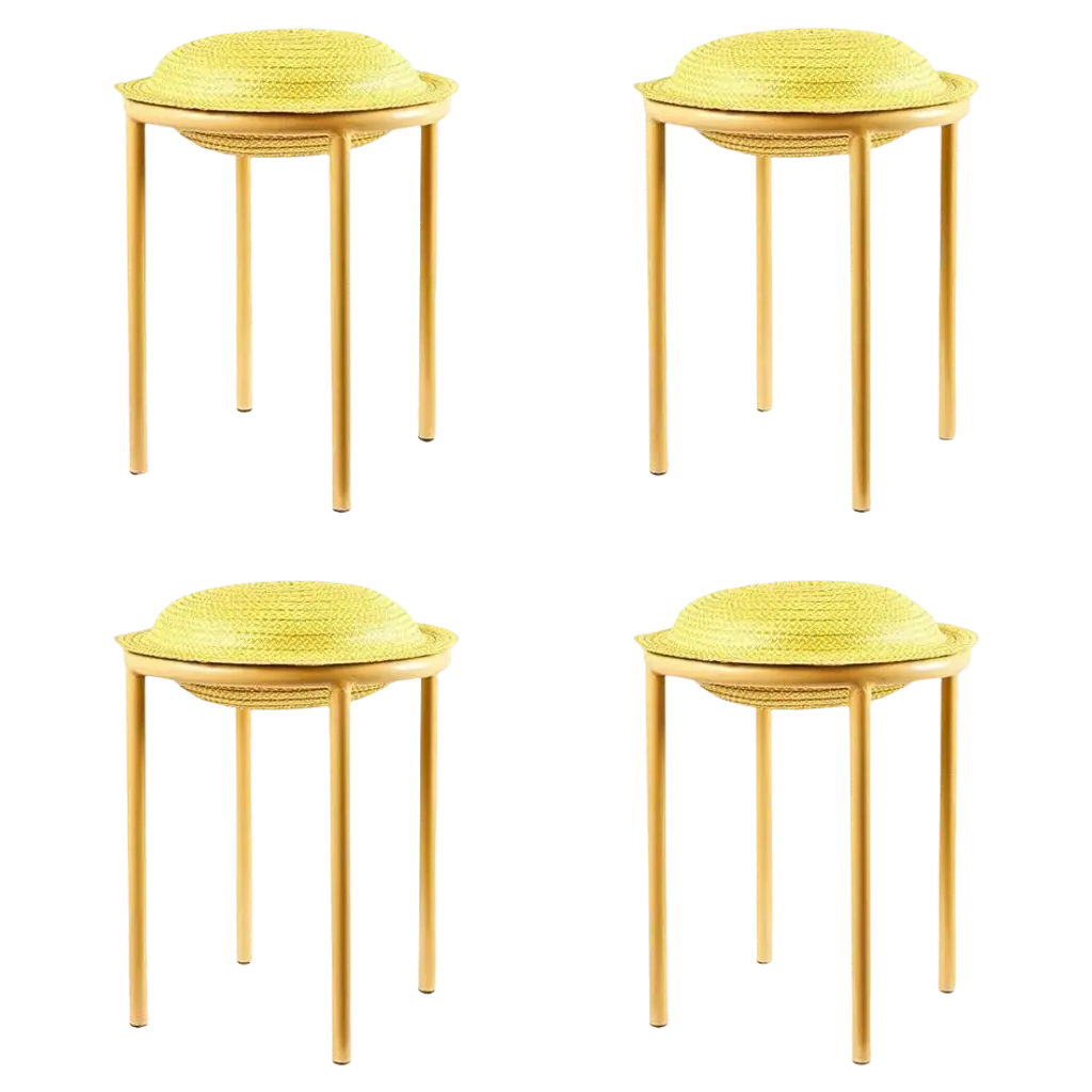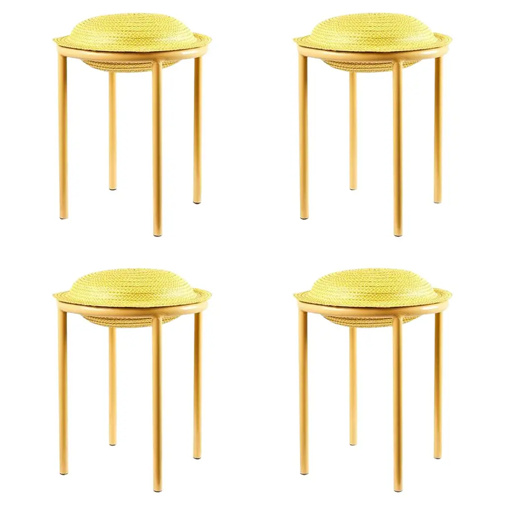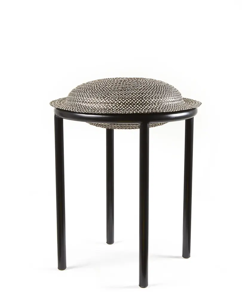 Set of 4 black cana stool by Pauline Deltour by Cristina Celestino.Materials: Galvanized and powder-coated tubular steel. Caña Flecha.Technique: Hand-woven with natural fibers in Colombia. Natural dyed. Dimensions: Diameter 40.2 x height 48.1 cm Available in colors: black/ natural, black, yellow/ natural, sand, dark red/ natural, carne, vivid red/ natural, dark red. The adorable Cana stool, designed by Pauline Deltour, adds a fun pop of color to any room. Its round seat is braided by hand from caña flecha, a natural material that is obtained from the eponymous palm.It takes many steps of manual labor to extract the fibers from the caña flecha palm leaves before they are colored with natural dyes. Then the artisans use the fibers to braid the seat by hand. The frame of the stool is made of powder-coated steel. Just the preparation of all the materials takes three days, while the production of each stool takes four days.Born in France, Pauline Deltour’s aesthetic is defined by being strikingly simple and beautifully detailed at once. Her designs showcase a curiosity in the qualities of the raw materials and transferring production techniques between disciplines. Pauline Deltour joined Ames founder Ana Maria Calderón Kayser on a trip to Colombia to study the local materials first hand and learn from the artisans about the traditional weaving techniques. Back in her Paris studio, where she develops furniture and product designs for international brands, Deltour designed a range of furniture and living accessories for Ames.