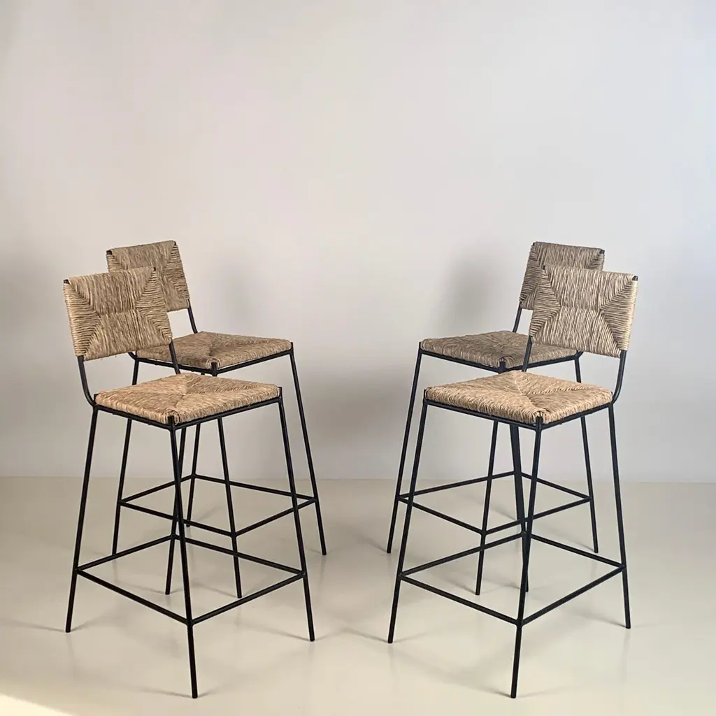 Set of 4 'Campagne' counter height stools by Design Frères.Chic combination of slender but sturdy and stabile powder coated steel frames with handwoven rush seats and backs. Extra support under the rush seat for durability. Durable plastic caps on the feet to prevent scratching floor surfaces. Additional measurements: 26 in. seat height (can be adjusted to 25 in. or 24 in. if needed). The footrest bar is a standard 7 in. from the floor.