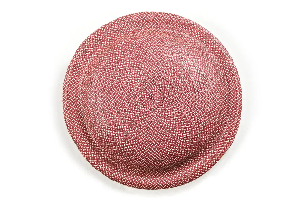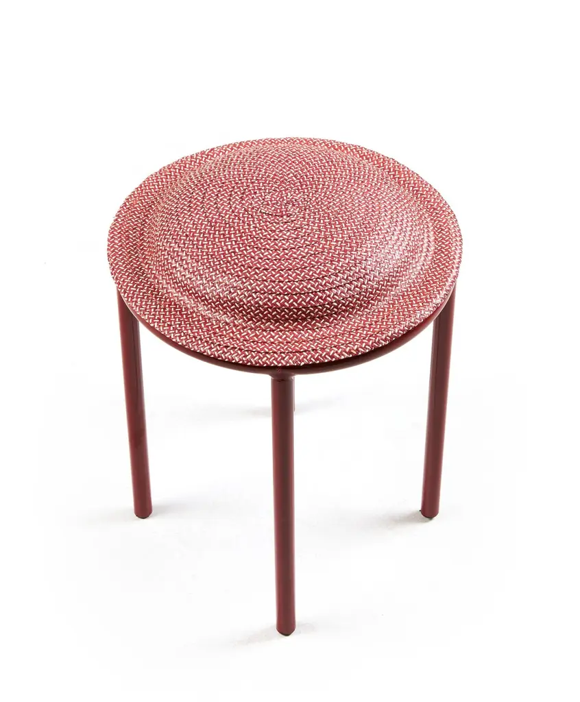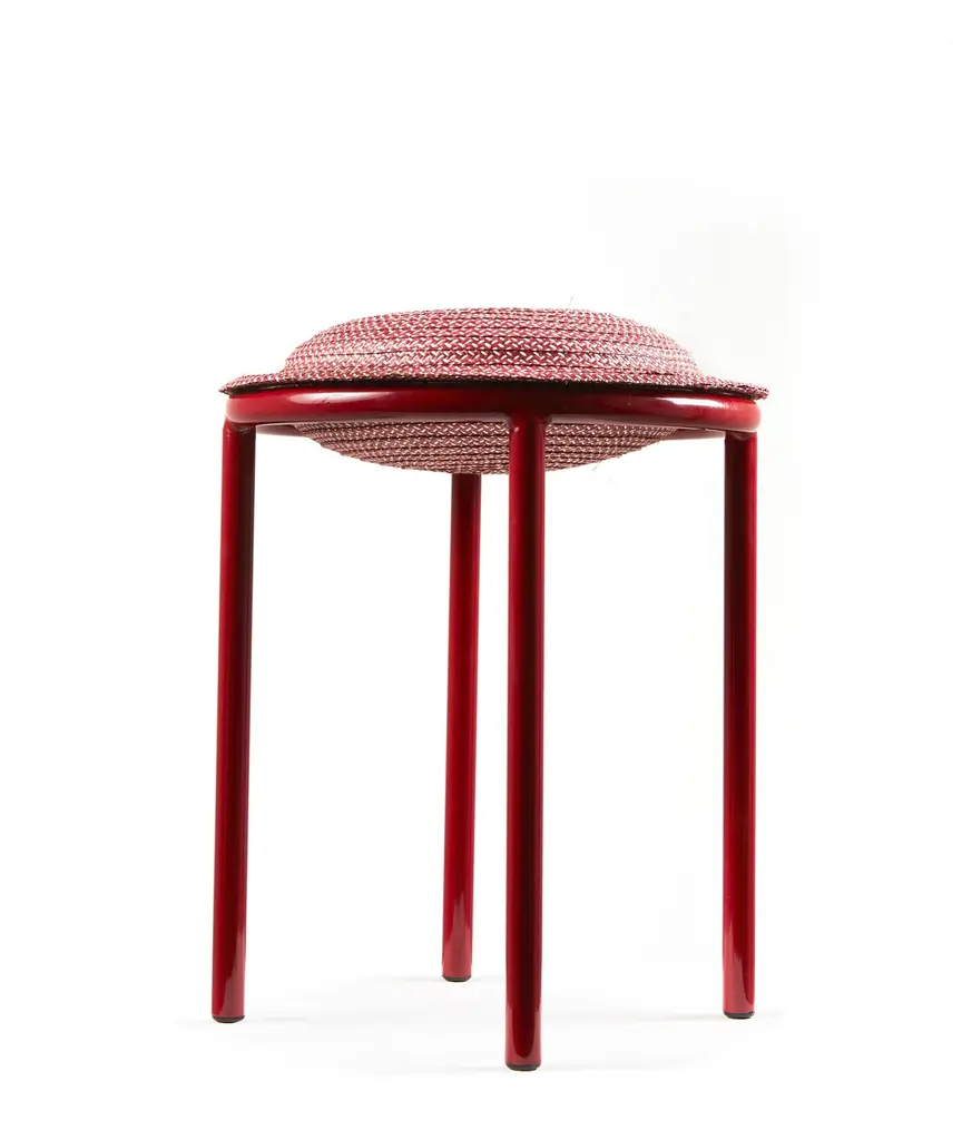 Set of 4 Red Cana stool by Pauline Deltour by Cristina CelestinoMaterials: Galvanized and powder-coated tubular steel. Caña Flecha.Technique: hand-woven with natural fibers in Colombia. Natural dyed. Dimensions: diameter 40.2 x height 48.1 cm Available in colors: black/ natural, black, yellow/ natural, sand, dark red/ natural, carne, vivid red/ natural, dark red. The adorable Cana Stool, designed by Pauline Deltour, adds a fun pop of color to any room. Its round seat is braided by hand from caña flecha, a natural material that is obtained from the eponymous palm.It takes many steps of manual labor to extract the fibers from the caña flecha palm leaves before they are colored with natural dyes. Then the artisans use the fibers to braid the seat by hand. The frame of the stool is made of powder-coated steel. Just the preparation of all the materials takes three days, while the production of each stool takes four days.Born in France, Pauline Deltour’s aesthetic is defined by being strikingly simple and beautifully detailed at once. Her designs showcase a curiosity in the qualities of the raw materials and transferring production techniques between disciplines. Pauline Deltour joined Ames founder Ana Maria Calderón Kayser on a trip to Colombia to study the local materials first hand and learn from the artisans about the traditional weaving techniques. Back in her Paris studio, where she develops furniture and product designs for international brands, Deltour designed a range of furniture and living accessories for Ames.