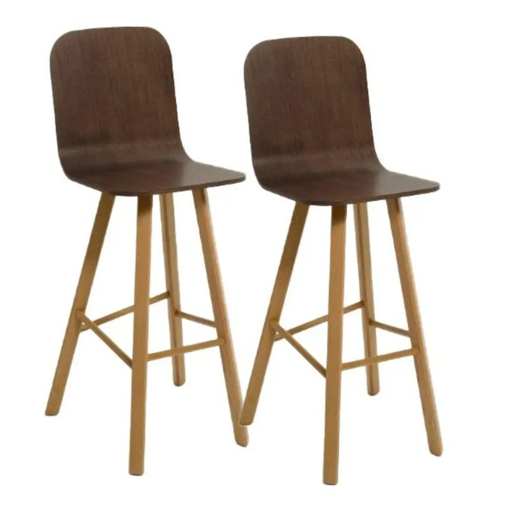 Set of 4, Tria stool, High Back, Canaletto Walnut, Natural Oak Legs by Colé Italia with Lorenz & Kaz Dimensions: H.seat 67/77 (H.105/115) x D.52 x W.48 cmMaterials: Canaletto Walnut, Plywood Stool with High Back, Solid Oak Wood 4 legsAlso Available: Tria Stool Upholstered, Low backTC: C.O.M. fabric - send us your own materialCA: Cat A - Angel (polypropylene), Ganesha (synt. leather), Nord Wool (felt)CB: Cat B - Tiffany (polyestere), Lana (aquaclean)CC: Cat C - Velvetforthy (Velvet), Topia (wool), Novum (Wool), Opera (felt)CP: Cat P - Milano (full grain leather) Our iconic chair designed by German duo Lorenz + Kaz. Tria is a table chair, at the same time many people place it asa sculpture, as ornament in an entrance, a bedroom or in a living room. It recalls the impossible forms of Dutch graphicartist and engraver Maurits Escher, defining itself in a game of twists and elusive leak. The corolla-shaped shell can beused in two different seating positions, center or side, in this case with one armrest. The shell is composed of three equal elements in bent plywood assembled together and veneered with a special wood finishing ivory/ black stripes.It is also available in veneered oak, natural or stained open pore in different colors, as well as customized colors (min. 4units). Available with 3 or 4 solid wood legs, or 4 metal legs in different finishings. For a better back comfort if you useTria chair in center position, for dining or studying, you can add a back cushion specially designed for it, upholsteredand coated with a wide range of fabrics.Colé is a young Italian design brand, with a high-end production 100% made in Italy. Born from the experience of Matteo De Ponti, architect, who grew up in one of the most outstanding Milanese design families, and the artistic sensibility of Laura Macagno, degree in Economics and passionate of art and design. Our Mission is to create design icons, beautiful and comfortable pieces that can Stand the test of time, furnishing houses of international and sophisticated clients, and realized with craftsmanship, thus unique. “We love objects which own deep roots, excellent quality, and a strong evocative power. Archetypal forms dressed with new beauty without losing their classical composure”.Our expressive research is inspired by the utopian force of Italian eminences grises architects and designers of the ’50s, the Scandinavian design, the Bauhaus, ethnic handcraft and houses of famous writers of the XX century, all different as a style but united by the intense soul of those who worked and lived there.