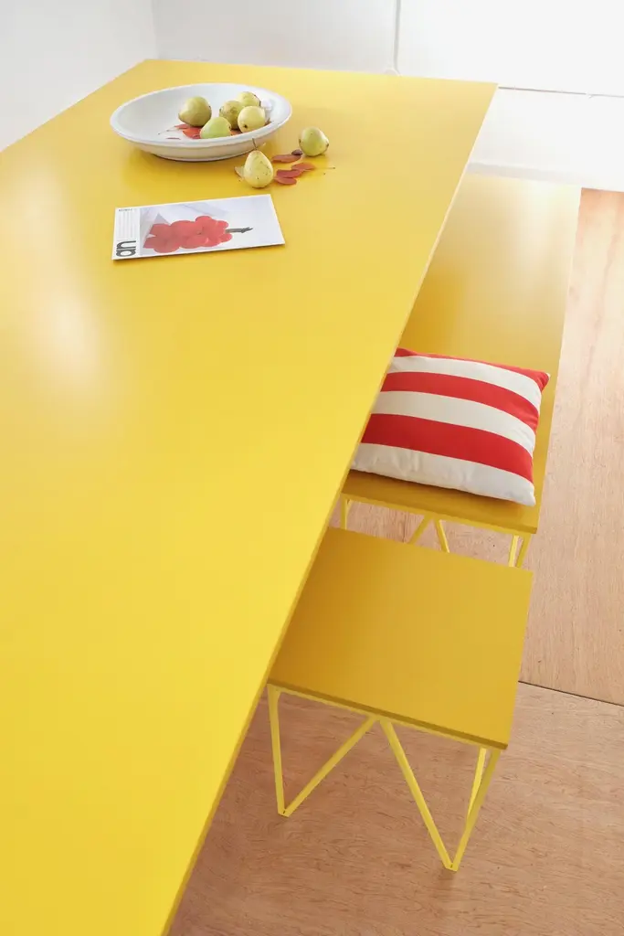 The color play stools are part of &New’s color play dining room collection, which consists of dining tables, benches, stools and cabinets made in Britain by local craftsmen. The design of the collection was driven by function and the minimal & new aesthetic. The playful and functional design looks great against period details as well as in a modern space, suitable for both residential and commercial environments. This set of color play stools are made with yellow powder-coated steel frames and a birch plywood seat which is lacquered in a contrasting bright yellow. The stools are available in a combination of over one hundred color ways; seven colors for the lacquered plywood seat and fifteen colors for the steel frame. The stools are also available in other quantities.The base structure is made in a powder-coated steel, which lends a fine line minimalism to the pieces. The seat is finished in a food safe satin lacquer which is skilfully applied onto a color matched undercoat leaving the grain of the birch plywood on show. Therefore, every single seat is beautifully different depending on the grain and character of the plywood underneath. Colour samples available to order from our storefront - LU2894331610202 Each stool measures 29 cm x 33 cm x 47 cm high.