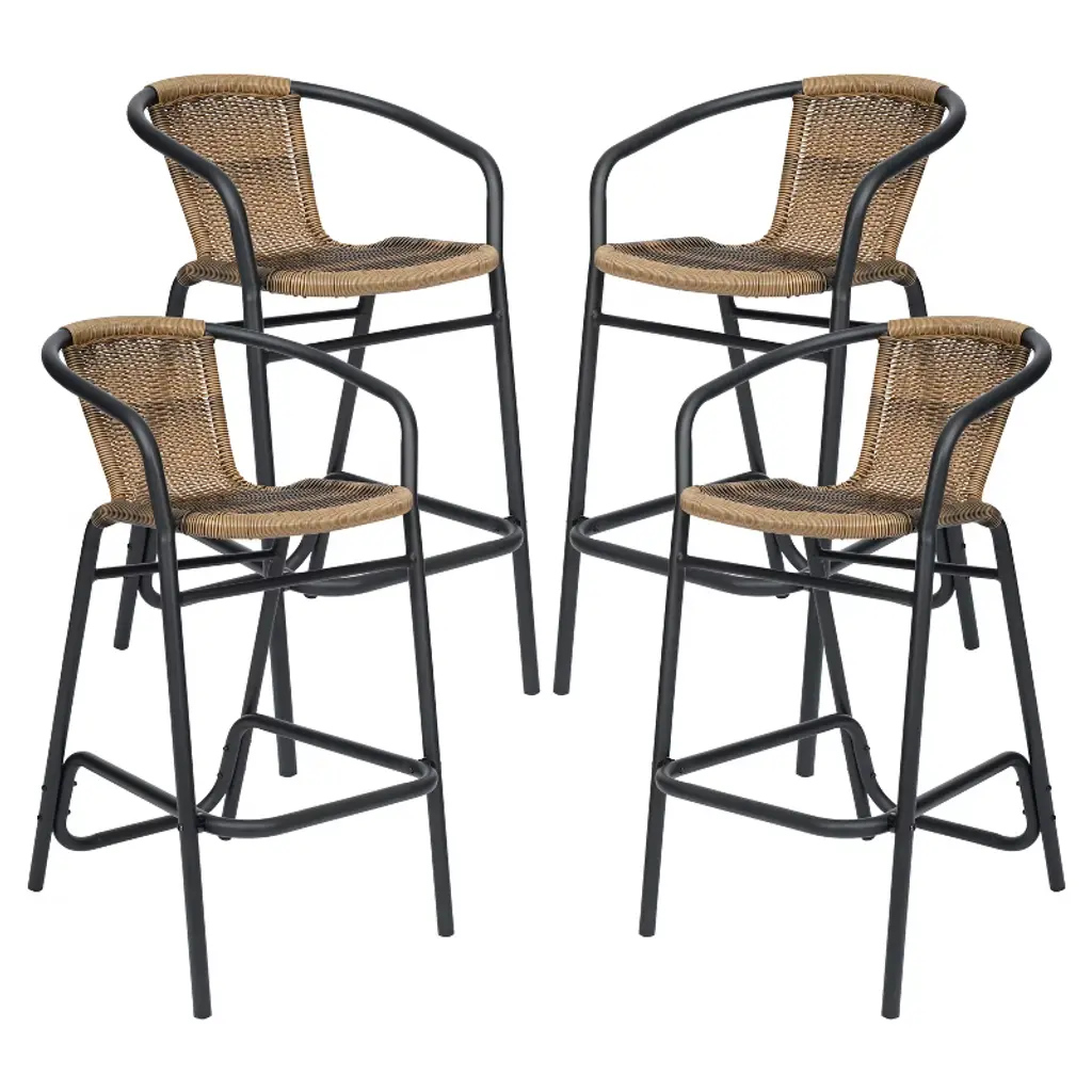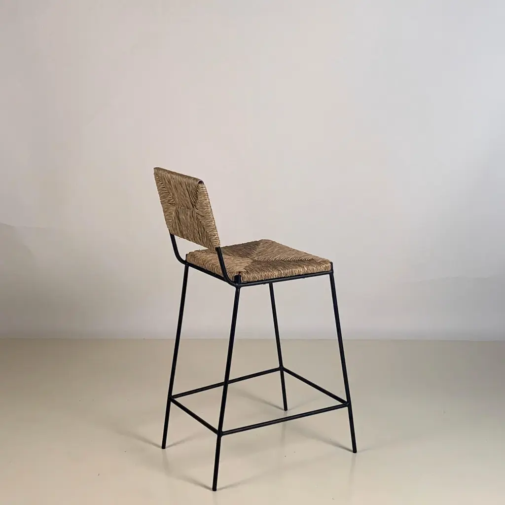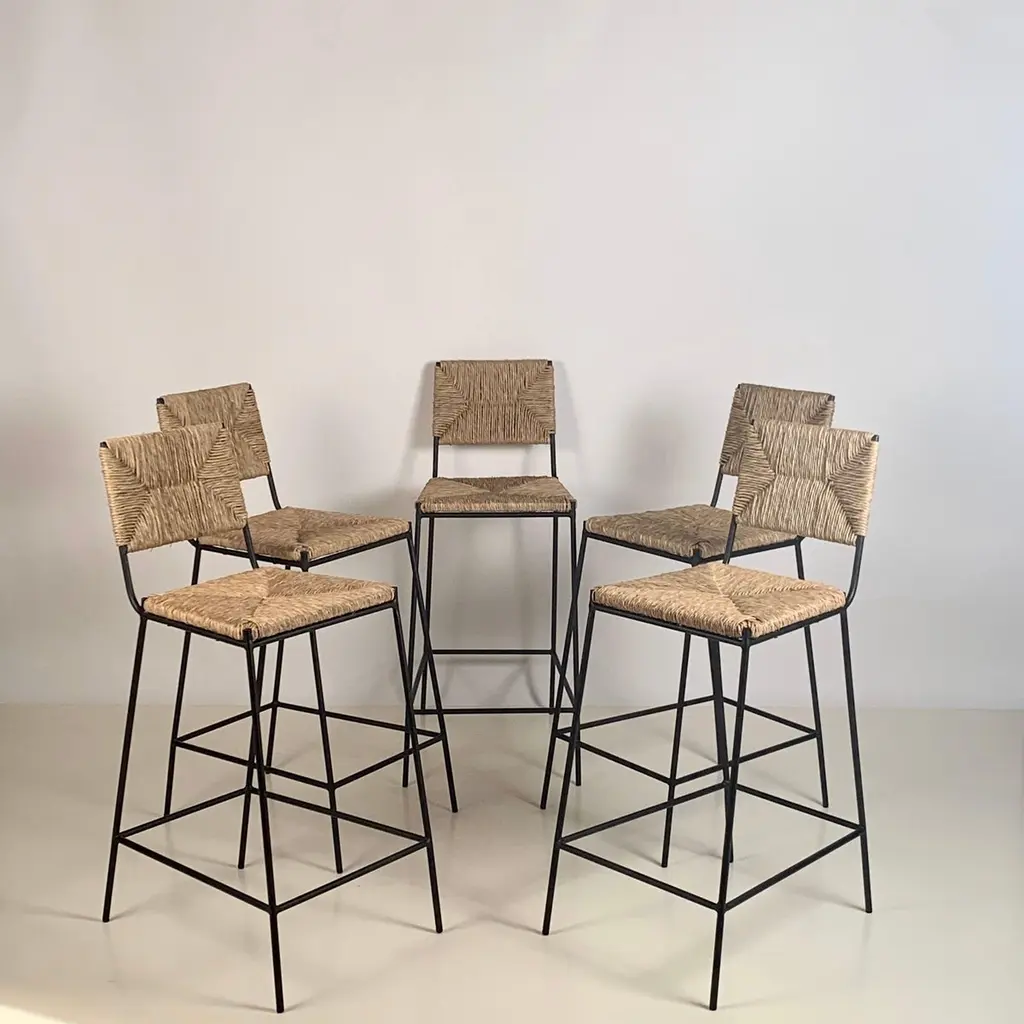 Set of 5 'Campagne' counter height stools by Design Frères.Chic combination of slender but sturdy and stabile powder-coated steel frames with handwoven rush seats and backs. Extra support under the rush seat for durability. Durable plastic caps on the feet to prevent scratching floor surfaces.Additional measurements: 26 in. seat height (can be adjusted to 25 in. or 24 in. if needed). The footrest bar is a standard 7 in. from the floor.