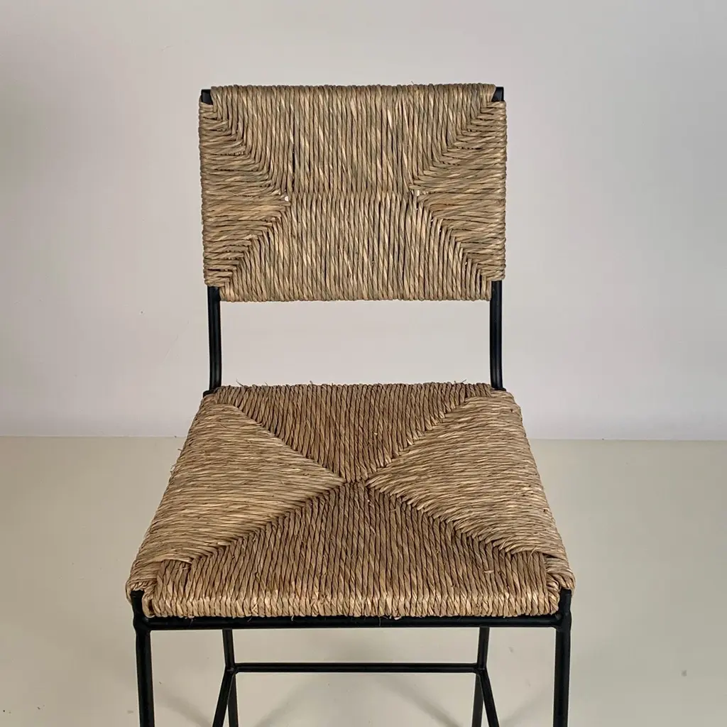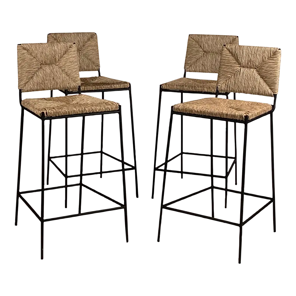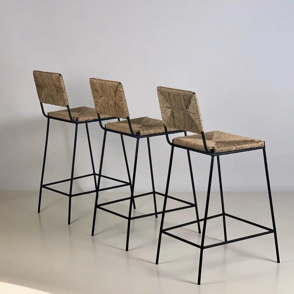 Set of 5 'Campagne' counter height stools by Design Frères.Chic combination of slender but sturdy and stabile powder-coated steel frames with handwoven rush seats and backs. Extra support under the rush seat for durability. Durable plastic caps on the feet to prevent scratching floor surfaces.Additional measurements: 26 in. seat height (can be adjusted to 25 in. or 24 in. if needed). The footrest bar is a standard 7 in. from the floor.