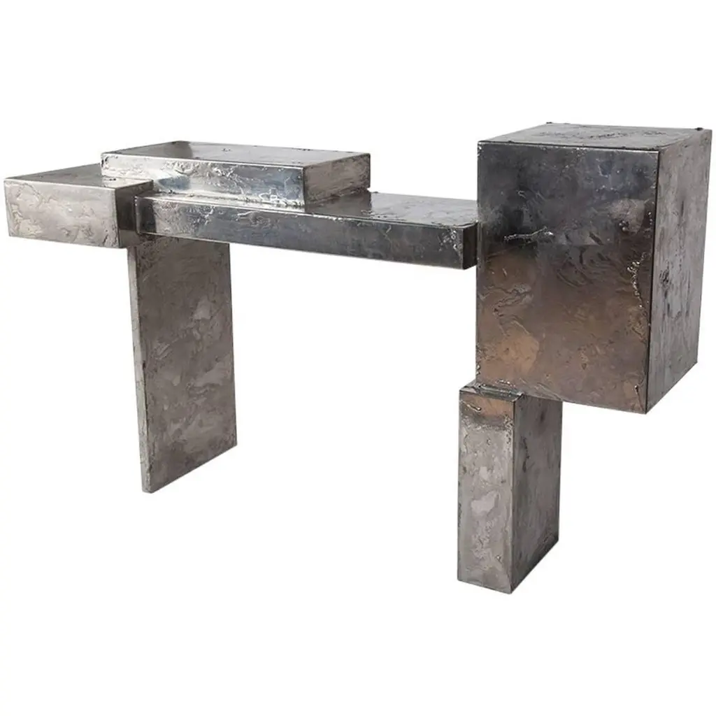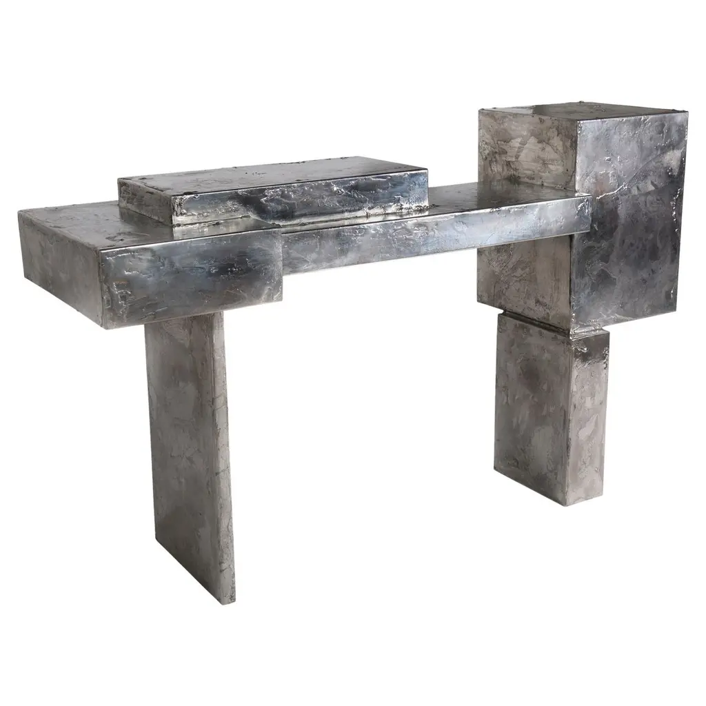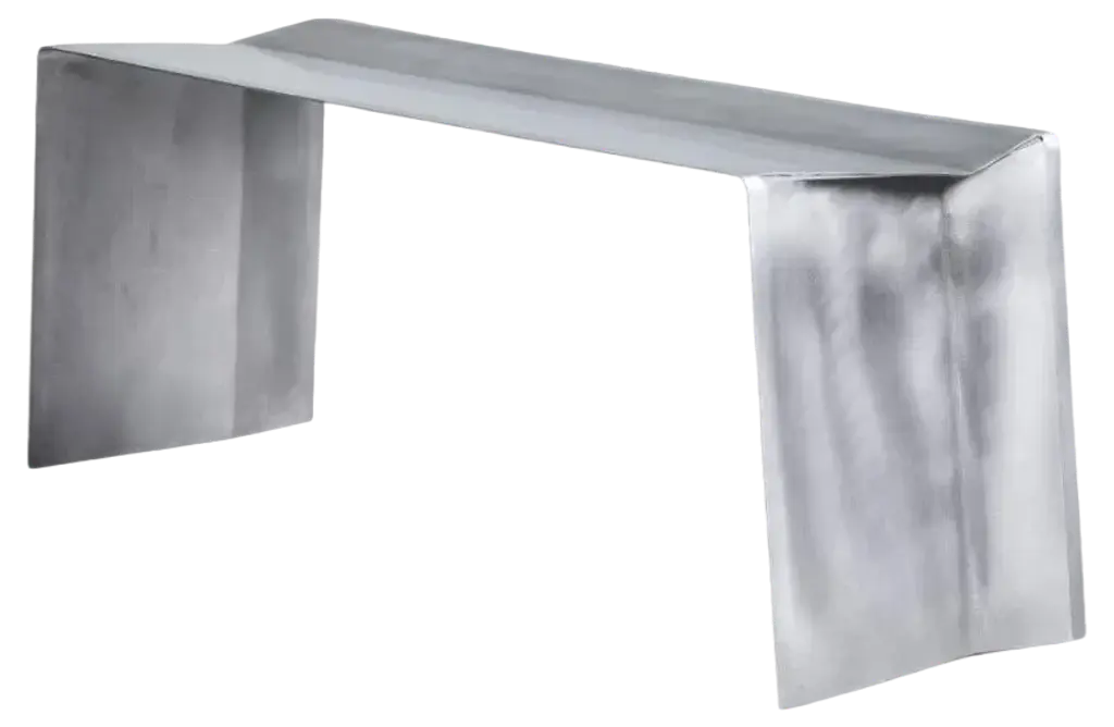 Set of camber stool and bench by Paul Coenen.Dimensions: Stool: W 47 x D 37 x H 45 cmBench: W 118 x D 37 x H 45 cmMaterials: Stainless steel.The Camber bench and stool originated from the IDEA of manufacturing a piece of furniture from a single piece of sheet metal.The inclining angle of the seat formed the basis for the rest of the design, with each cut and fold having the same 5 degree angle.Starting with a flat rectangle, two angular cuts are made. The first three folds are then made lengthwise by machine, after which the legs are finally bend into the right angle by hand.Borders of assemblyThe manufacturing industry is using standard sized Material, and every machine used works according to these sizes. Instead of seeing this as a limitation, it became an inspiration to search for new possibilities.Sheet metal is often folded to rule out it’s flexible properties and to create stiffness in the Material. This flexibility can also be used in our advantage. By combining this feature together with high precision manufacturing, aform language evolved: the flexibility of metal is used to lock pieces together due to the sheet’s force of bending back to it’s original shape.Every piece of furniture is made out of a standard Size sheet of 1000 by 2000 millimeters.Paul Coenen employs a intuitive and hands-on approach, where he explores his fascination for materials and both modern and traditional manufacturing techniques. His work is straightforward; the appearance of the objects are a consequence of Material and technique. He graduated from the Design Academy Eindhoven in 2019. Material Zinc-plated SteelPhotography Pierre Castignola.