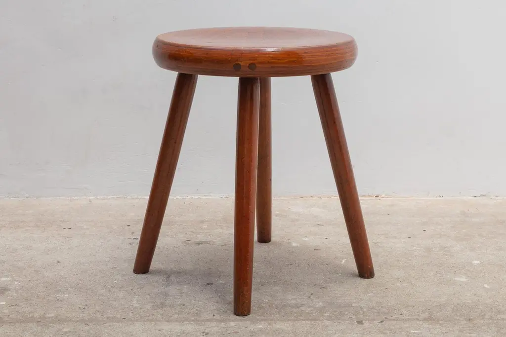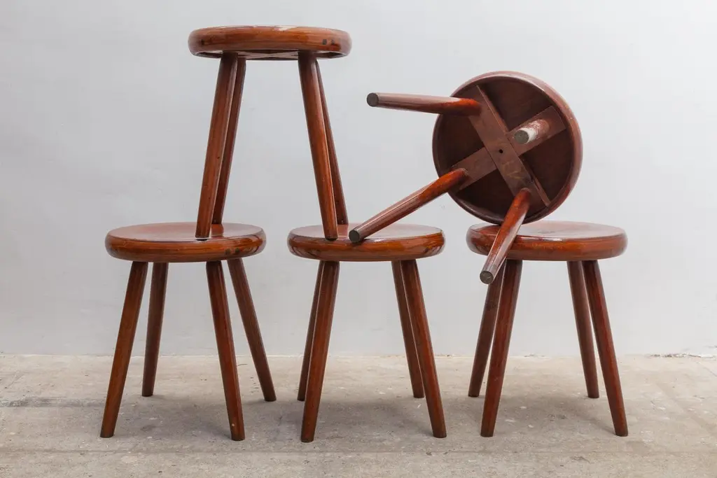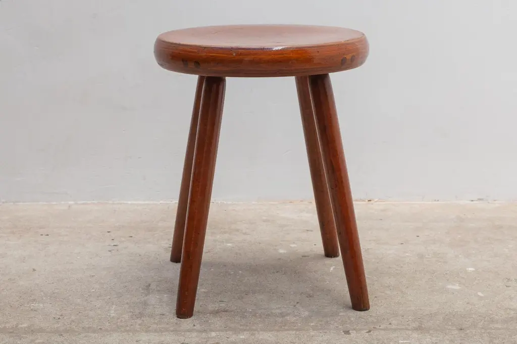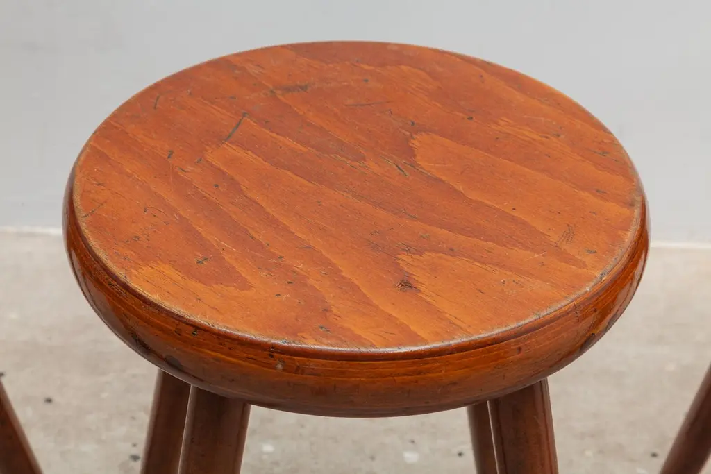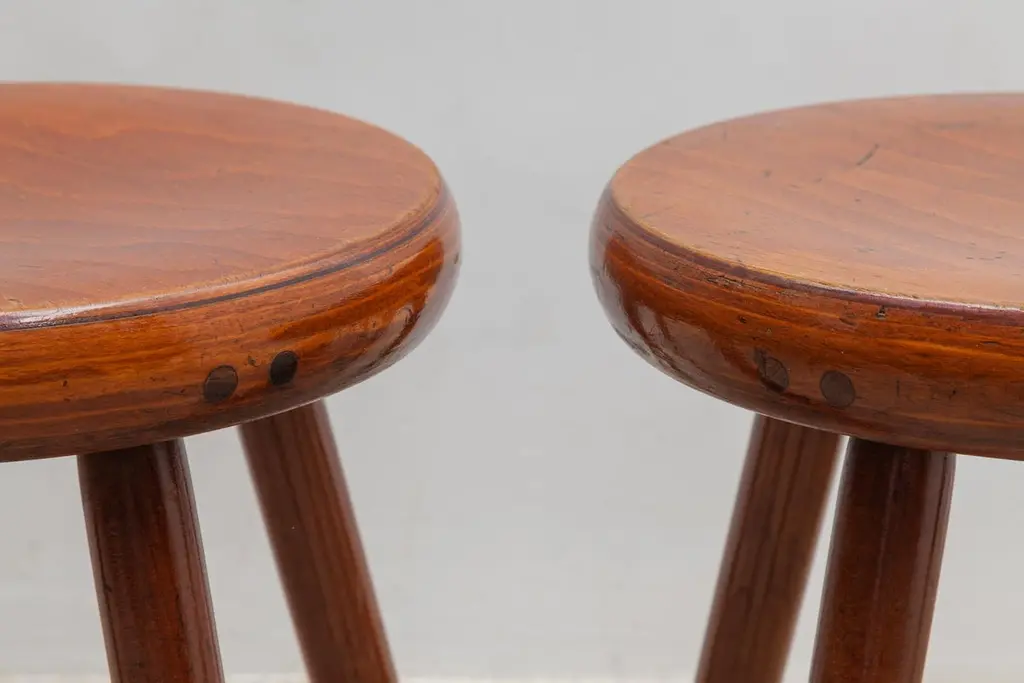Nordic stools in rich brown wood with four pegged legs. Very nice patina and good condition. Seat height 45 cm.