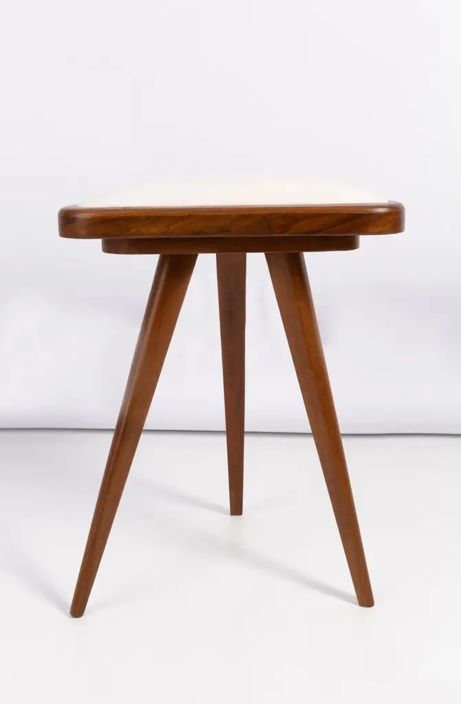 Stools from the turn of the 1960s and 1970s. Beautiful velour upholstery in 2 different colors. The stools consists of an upholstered part, a seat and wooden legs narrowing downwards, characteristic of the 1960s style. They are absolutely unique.Any combination of fabric and wood colors are possible - please check the last pictures with color samples and ask for more informations.