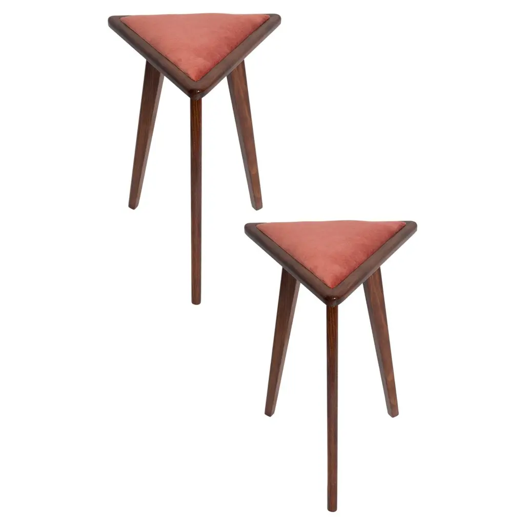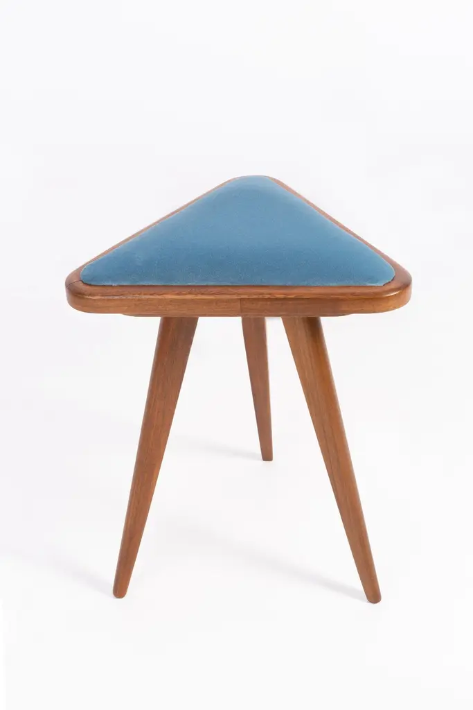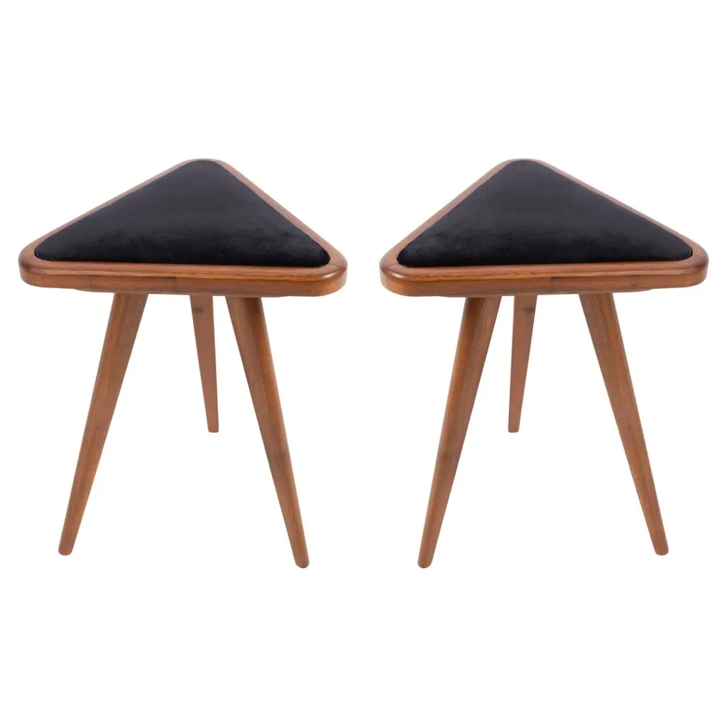 Stools from the turn of the 1960s and 1970s. Beautiful velour upholstery in 2 different colors. The stools consists of an upholstered part, a seat and wooden legs narrowing downwards, characteristic of the 1960s style. They are absolutely unique.