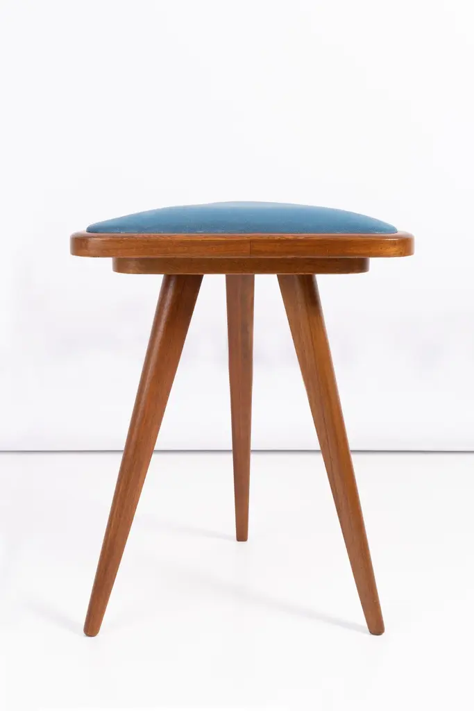 Stools from the turn of the 1960s and 1970s. Beautiful velour upholstery in blue color. The stools consists of an upholstered part, a seat and wooden legs narrowing downwards, characteristic of the 1960s style. They are absolutely unique.Any combination of fabric and wood colors are possible - please check the last pictures with color samples and ask for more informations.
