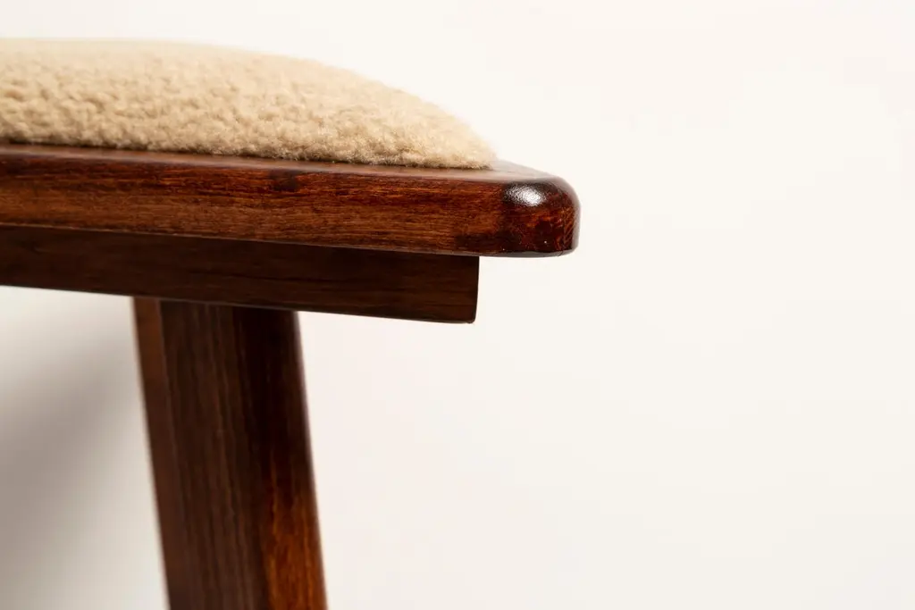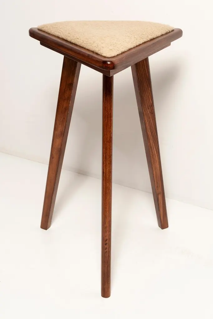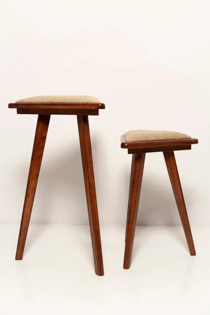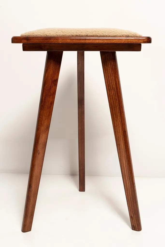 Stools inspired by 60s style. Beautiful boucle upholstery in light cream white color. The stools consists of an upholstered part, a seat and wooden legs narrowing downwards, characteristic of the 1960s style. They are absolutely unique. We can prepare them also in another wood and boucle color.