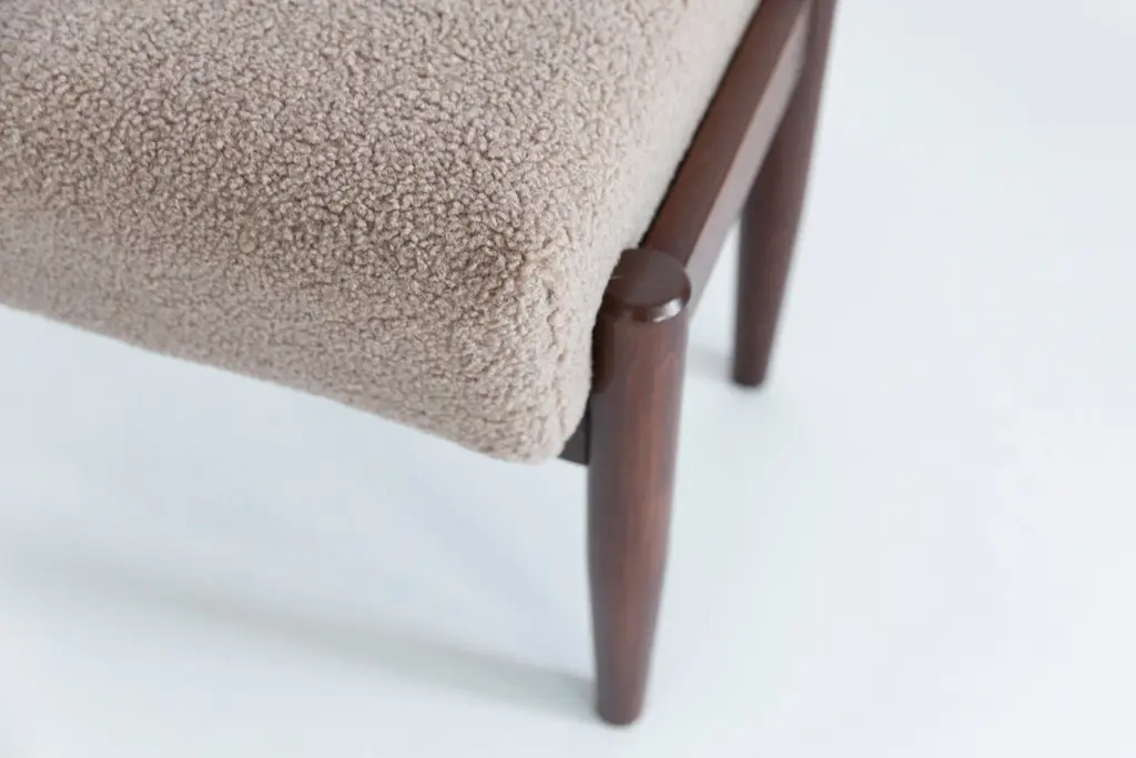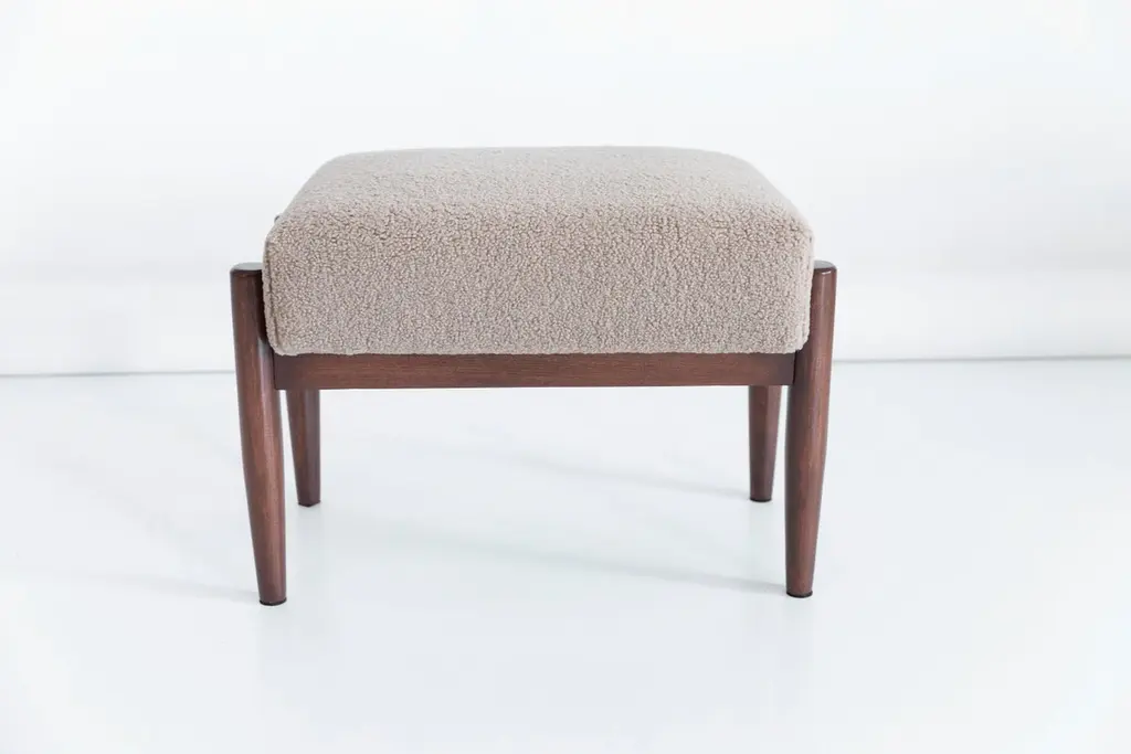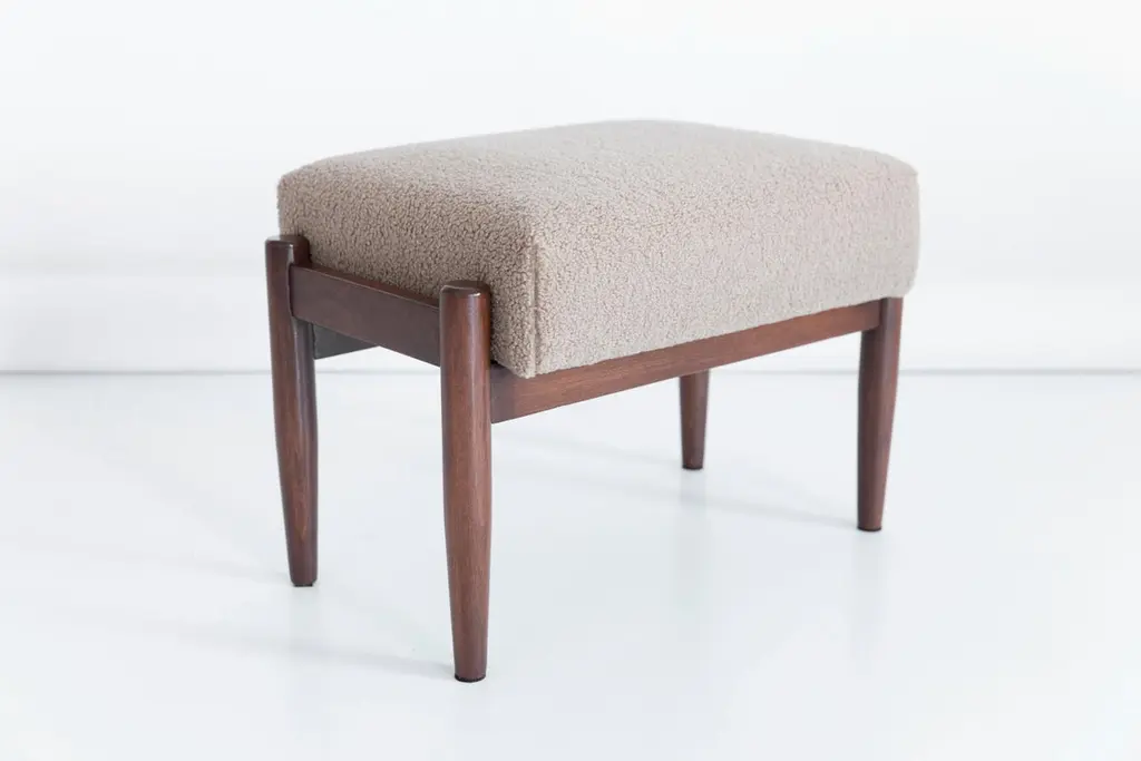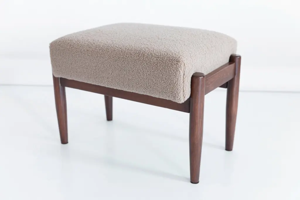 Stools from the turn of the 1960s. The stools consist of an upholstered part, a seat and wooden legs narrowing downwards, characteristic of the 1960s style.Stools were designed by Edmund Homa, a Polish architect, designer of industrial design and interior architecture, professor at the Academy of Fine Arts in Gdansk.Upholstery, artificial fur has a structure reminiscent of a dense, fleshy, slightly rough sheep fleece. This is one of those upholstery fabrics whose haptic (tactile) qualities are as important as strength, pattern or color. It is characterized by a knotty weave, high basis weight and abrasion resistance. It is available in 10 subdued colors, inspired by the natural colors of wool.We can prepare this stools also in another option of fabric and wood.