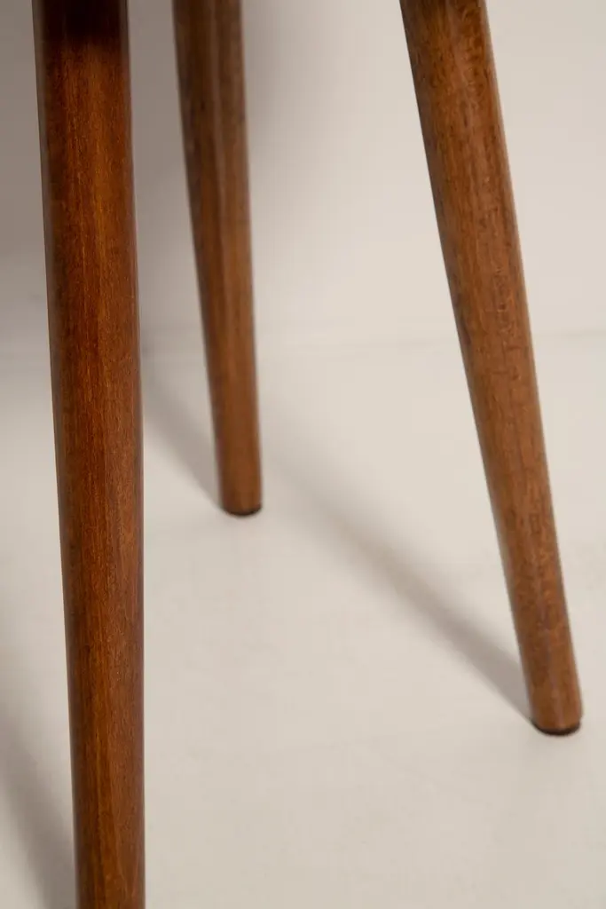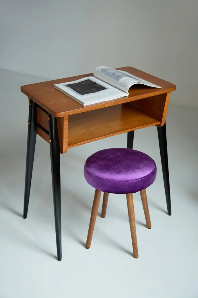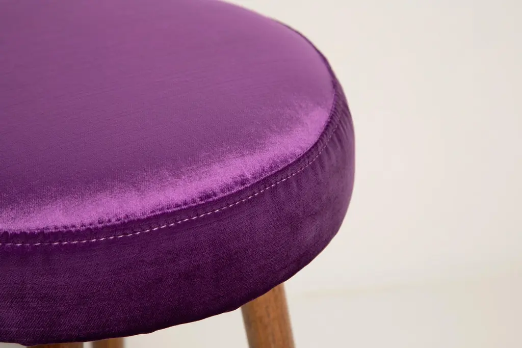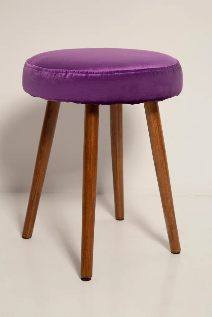 Stool from the turn of the 1960s and 1970s. Beautiful glossy purple color velvet upholstery. The stool consists of an upholstered part, a seat and wooden legs narrowing downwards, characteristic of the 1960s style. We can prepare this pair also in another color of fabric and wood.Here set of two is available.
