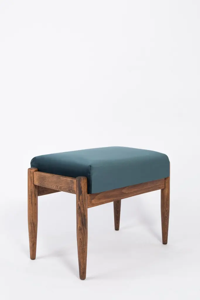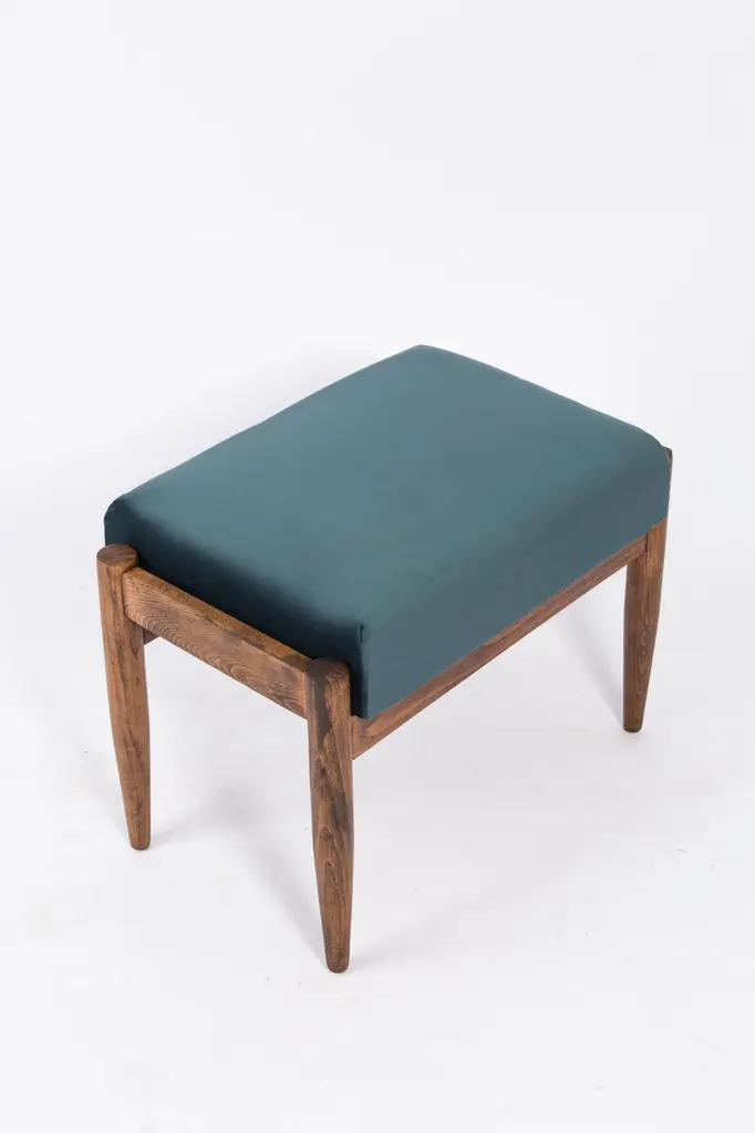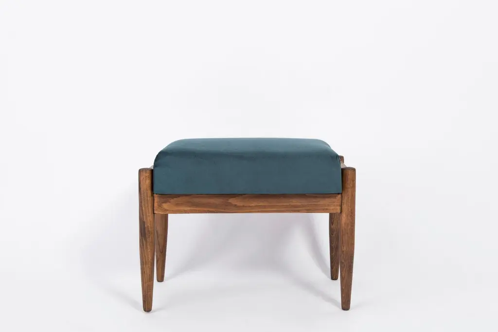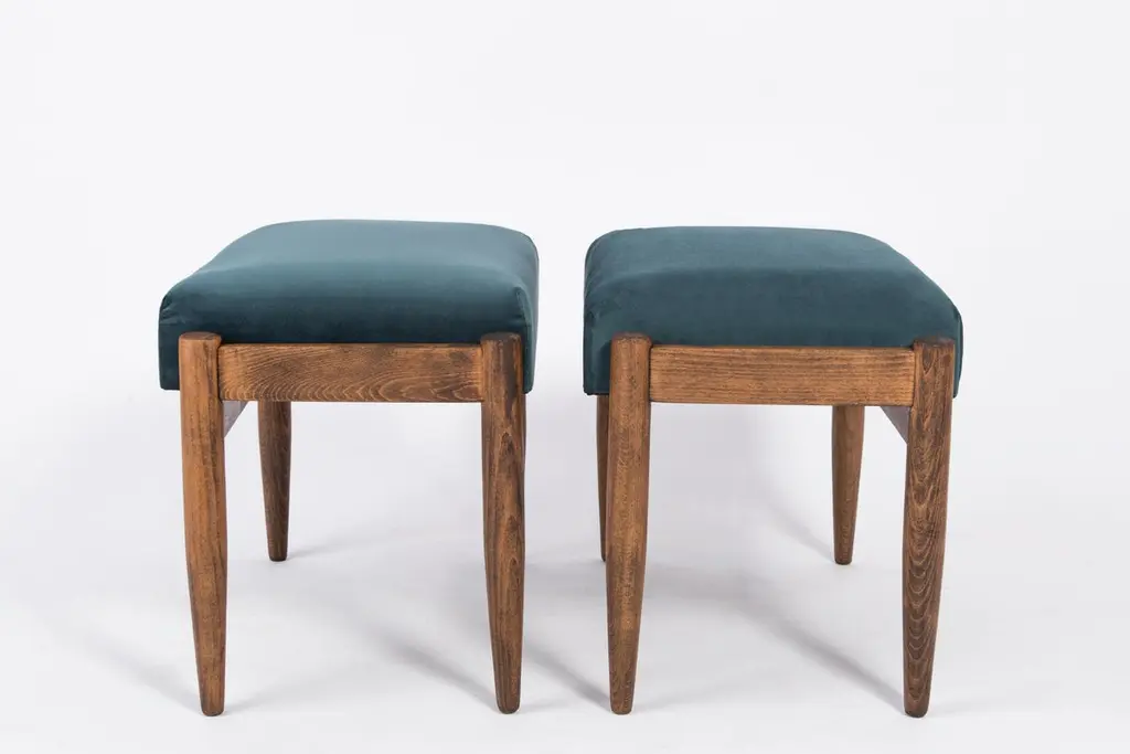 Stools from the turn of the 1960s. Beautiful petrol blue high quality velvet upholstery. The stools consists of an upholstered part, a seat and wooden legs narrowing downwards, characteristic of the 1960s style. We can prepare this stools also in another option of fabric and wood.