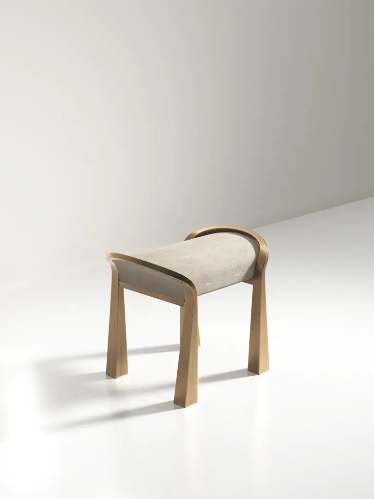 The Paris based label has distinguished themselves since their launch, with their iconic use of shagreen mixed with brass and other exotic materials. All furniture is handcrafted by skilled artisans, ultimately making each piece unique, designed in Paris and produced in the Philippines.The Arche Stool by R&Y Augousti is a stunning piece, a statement in any space. The black shagreen inlaid seat is nestled in between a pair of bronze-patina brass sculptural cutout "arched" legs. This design also exists upholstered in velvet or client COM and as a bench, see images at end of slide. Sold individualy The dimensions of this piece are 61 x 43.8 x 52.6 cm (seat height 37cm)All R&Y Augousti pieces are handmade by artisans, ultimately making each piece unique.Custom color/sizing available on request.Wipe clean with soft dry cloth. Acclaimed design duo Ria & Yiouri Augousti have established themselves since the 1990’s as pioneers of modern-vintage style through their luxurious art-deco inspired collections.The Paris based label has distinguished themselves since their launch, with their iconic use of shagreen mixed with brass and other exotic materials. All furniture is handcrafted by skilled artisans, ultimately making each piece unique. All shagreen-covered items should be kept out of direct sunlight, color variants may occur on the stingray and other exotic finishes, but this showcases the Parisian label's commitment to creating authentic luxurious products using natural components.
