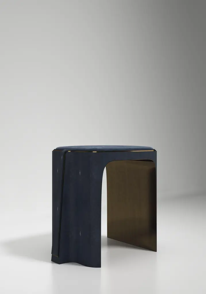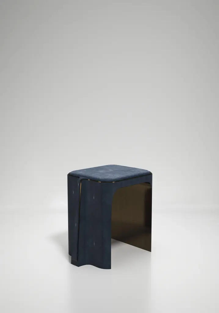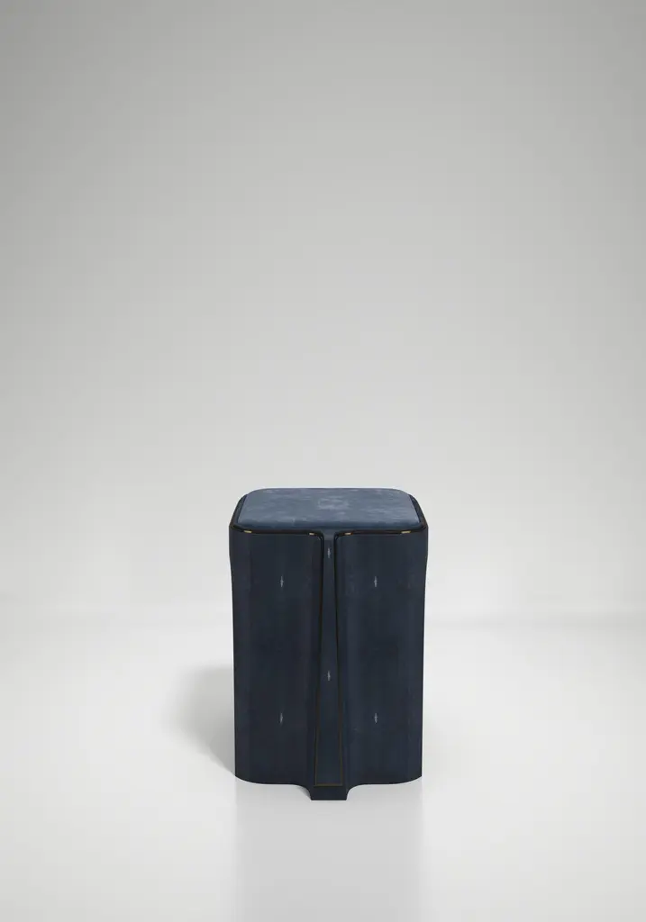 The Paris based label has distinguished themselves since their launch, with their iconic use of shagreen mixed with brass and other exotic materials. All furniture is handcrafted by skilled artisans, ultimately making each piece unique, designed in Paris and produced in the Philippines.The Axis Stool is an effortless piece that embodies sophistication along with subtle graphic detailing. Inlaid in blue shagreen, the tapered frame creates a geometric aesthetic within the timeless design of the piece. The seat is upholstered with a thin blue velvet cushion and the open bottom is inlaid in bronze-patina brass. Available as a bedside table, side table, bench and console. Custom sizing and finishing available on request. The dimensions of this piece are 53 x 40 x 45 cmAll R & Y Augousti pieces are handmade by artisans, ultimately making each piece unique.Wipe clean with soft dry cloth.Acclaimed design duo Ria & Yiouri Augousti have established themselves since the 1990s as pioneers of modern-vintage style through their luxurious Art Deco inspired collections.The Paris based label has distinguished themselves since their launch, with their iconic use of shagreen mixed with brass and other exotic materials. All furniture is handcrafted by skilled artisans, ultimately making each piece unique. All shagreen-covered items should be kept out of direct sunlight, color variants may occur on the stingray and other exotic finishes, but this showcases the Parisian label's commitment to creating authentic luxurious products using natural components.