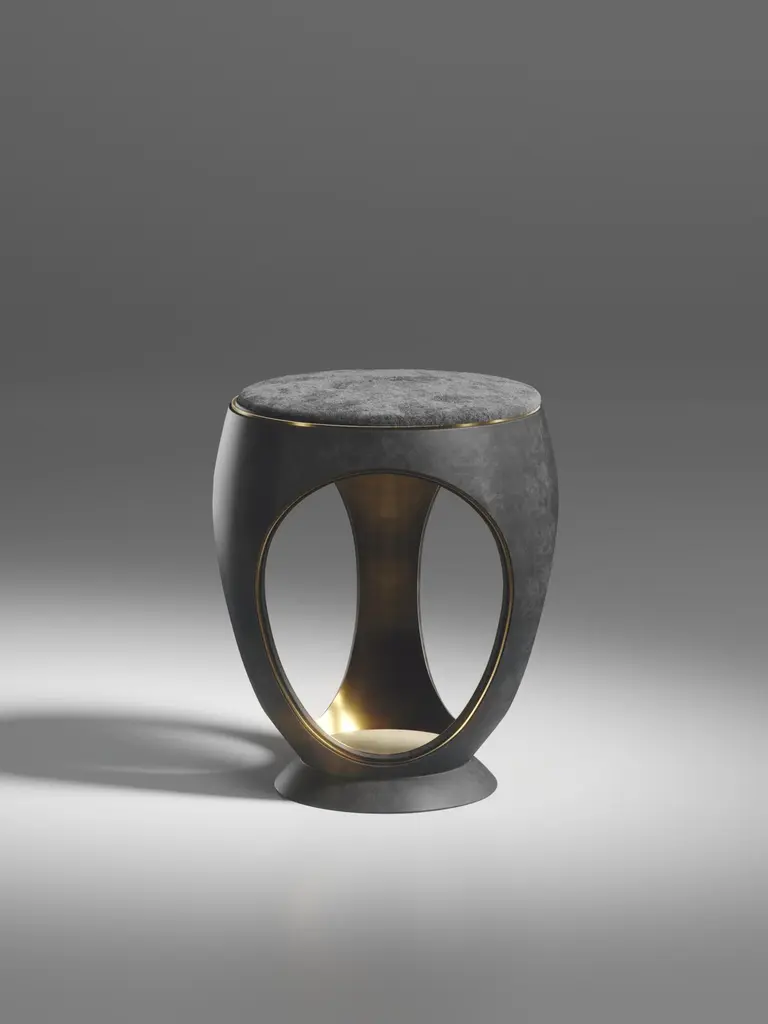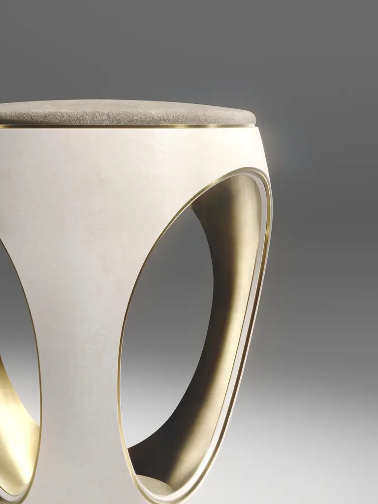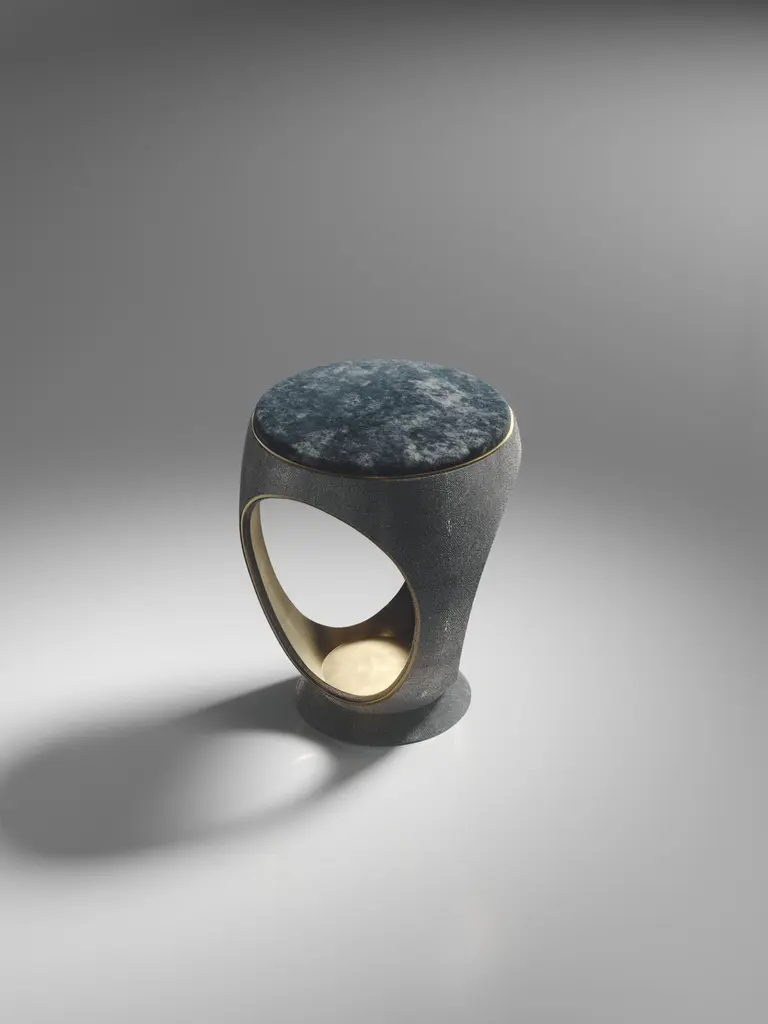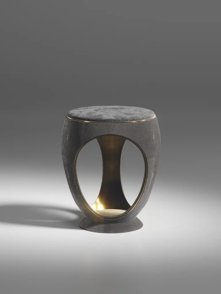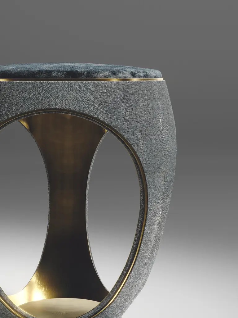 The Paris based label has distinguished themselves since their launch, with their iconic use of shagreen mixed with brass and other exotic materials. All furniture is handcrafted by skilled artisans, ultimately making each piece unique, designed in Paris and produced in the Philippines.The ring stool in cream shagreen is one of the most iconic pieces of the R&Y Augousti Collection. A Sculptural, jewel-like shape, this piece has been revamped with a discreet bronze-patina brass indentation detail on the exterior, as well as the inner part being inlaid in bronze patina brass and with an upholstered cream velvet top. This piece is available in other variations, see images at end of slide. Custom color and sizing available on request.All materials are hand-selected and hand-dyed before being inlaid, ultimately making each piece a one of a kind.The dimensions of this piece are 43 x 43 x 50 cm / 17" x 17" x 19.5"All R & Y Augousti pieces are handmade by artisans, ultimately making each piece unique.Wipe clean with soft dry cloth.Acclaimed design duo Ria & Yiouri Augousti have established themselves since the 1990s as pioneers of modern-vintage style through their luxurious Art Deco inspired collections.The Paris based label has distinguished themselves since their launch, with their iconic use of shagreen mixed with brass and other exotic materials. All furniture is handcrafted by skilled artisans, ultimately making each piece unique. All shagreen-covered items should be kept out of direct sunlight, color variants may occur on the stingray and other exotic finishes, but this showcases the Parisian label's commitment to creating authentic luxurious products using natural components.