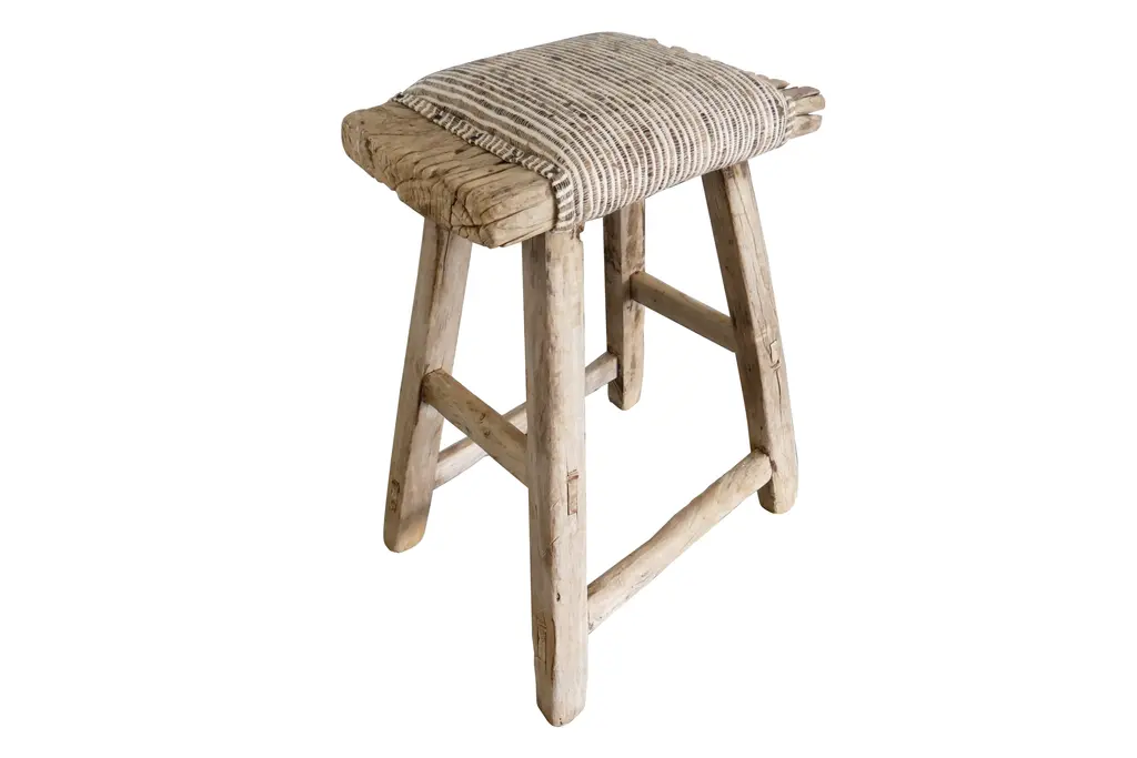 One-of-a-kind! Our authentic vintage Asian Shandong stool, primitively hand-built of solid heavy-weight raw elmwood. Constructed with early mortise & tenon joinery, showing much desirable history characteristics. Cushioned top, perfectly upholstered in ultra-luxe rolled woven heavy textural rustic silk textile in variegated camel & natural tones. Created by Fragments Identity in sunny California!