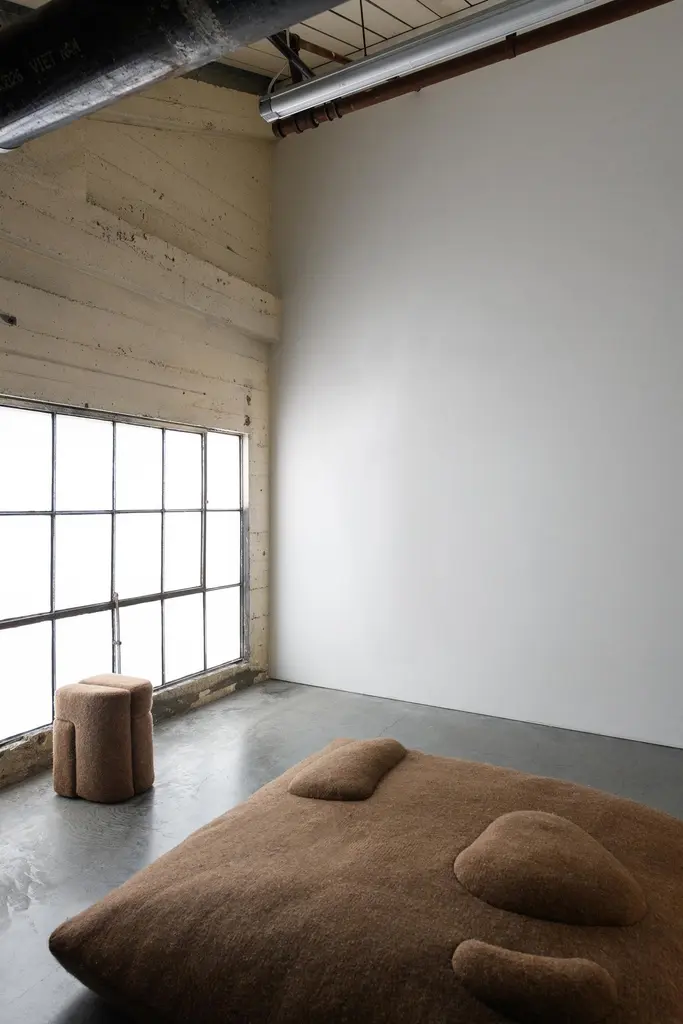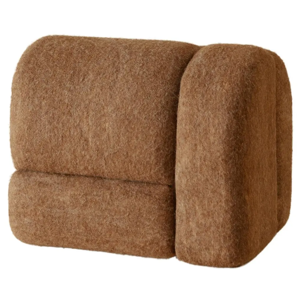 Sheep stool designed by Studio Ahead. The stool is upholstered in custom cream merino wool felt from Northern California sheep The stool could be placed on either side horizontally or vertically. Each side design is unique. Designed and fabricated in North California. Dimensions: Horizontal 14 in. Height, 18.25 in. Width, 12.25 in. Depth / Vertical 18.25 in. Height, 14 in. Width, 12.25 in. DepthAvailable in 4 wool felt color options and COM upon request.