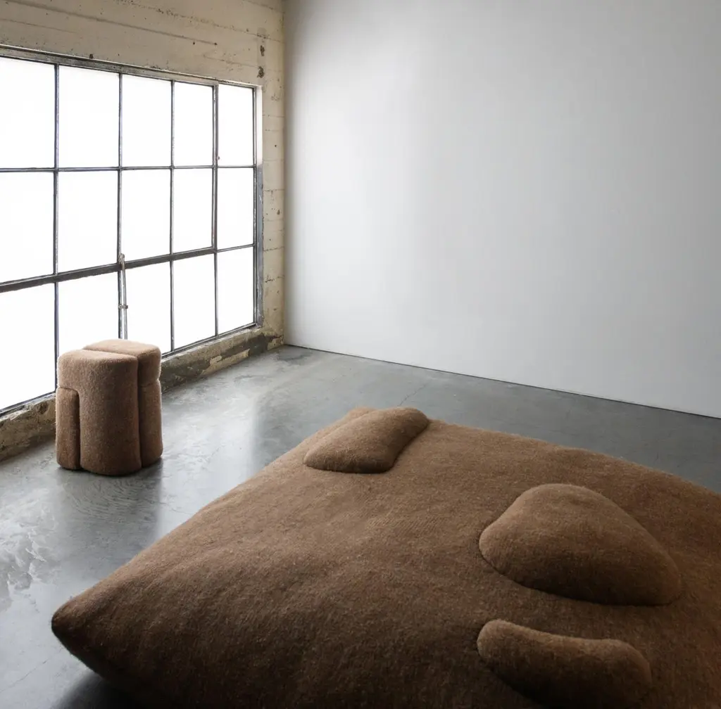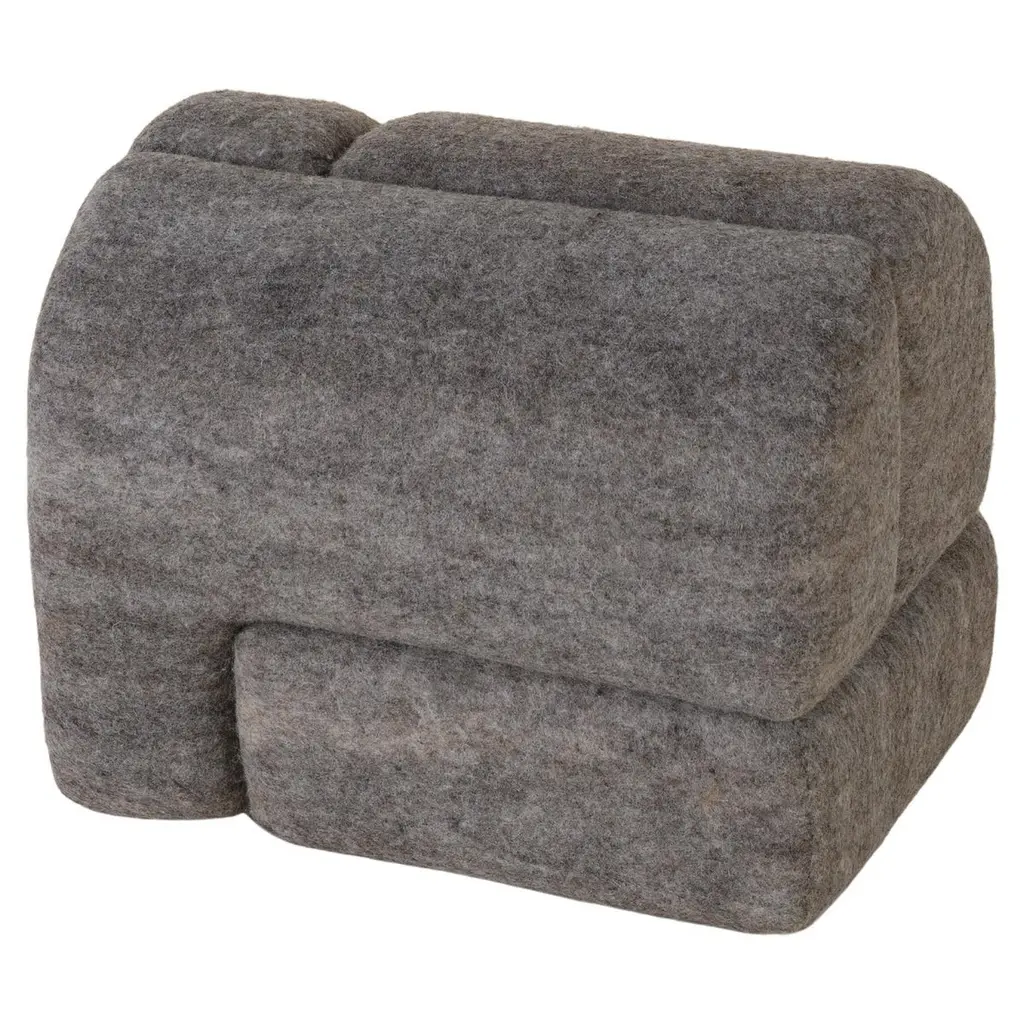 Sheep stool designed by Studio Ahead. The stool is upholstered in custom cream merino wool felt from Northern California sheep The stool could be placed on either side horizontally or vertically. Each side design is unique. Designed and fabricated in North California. Dimensions: Horizontal 14 in. Height, 18.25 in. Width, 12.25 in. Depth / Vertical 18.25 in. Height, 14 in. Width, 12.25 in. DepthAvailable in 4 wool felt color options and COM upon request.