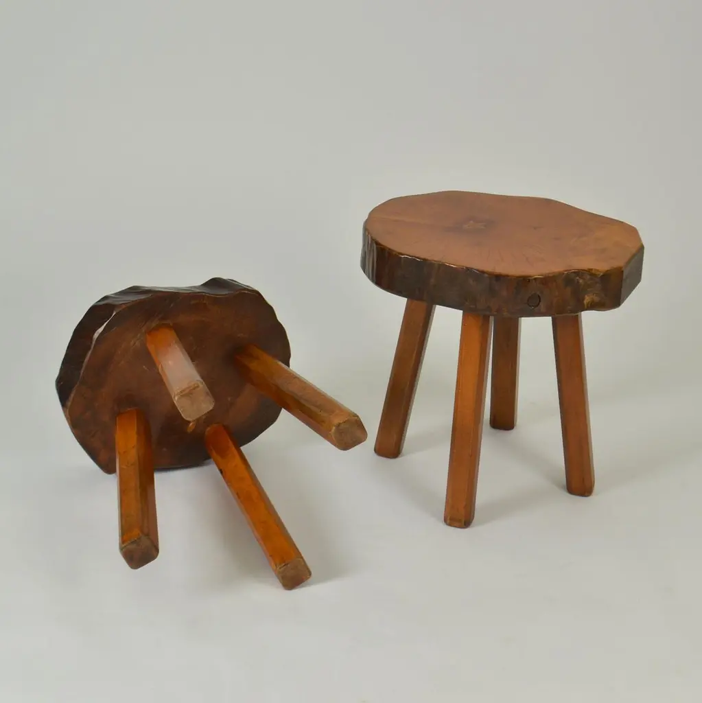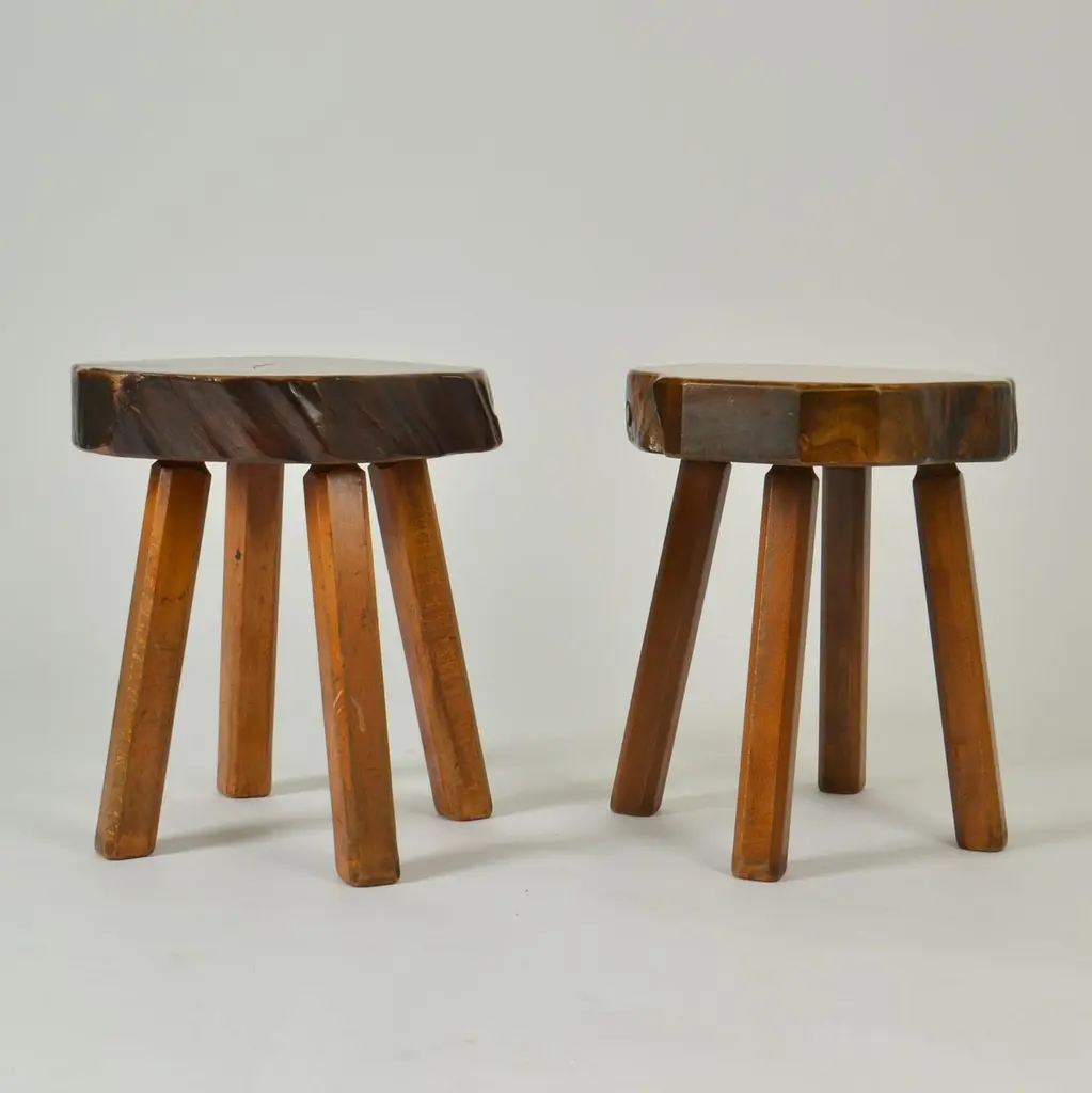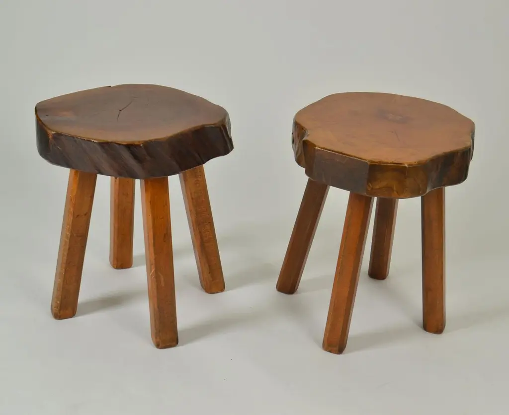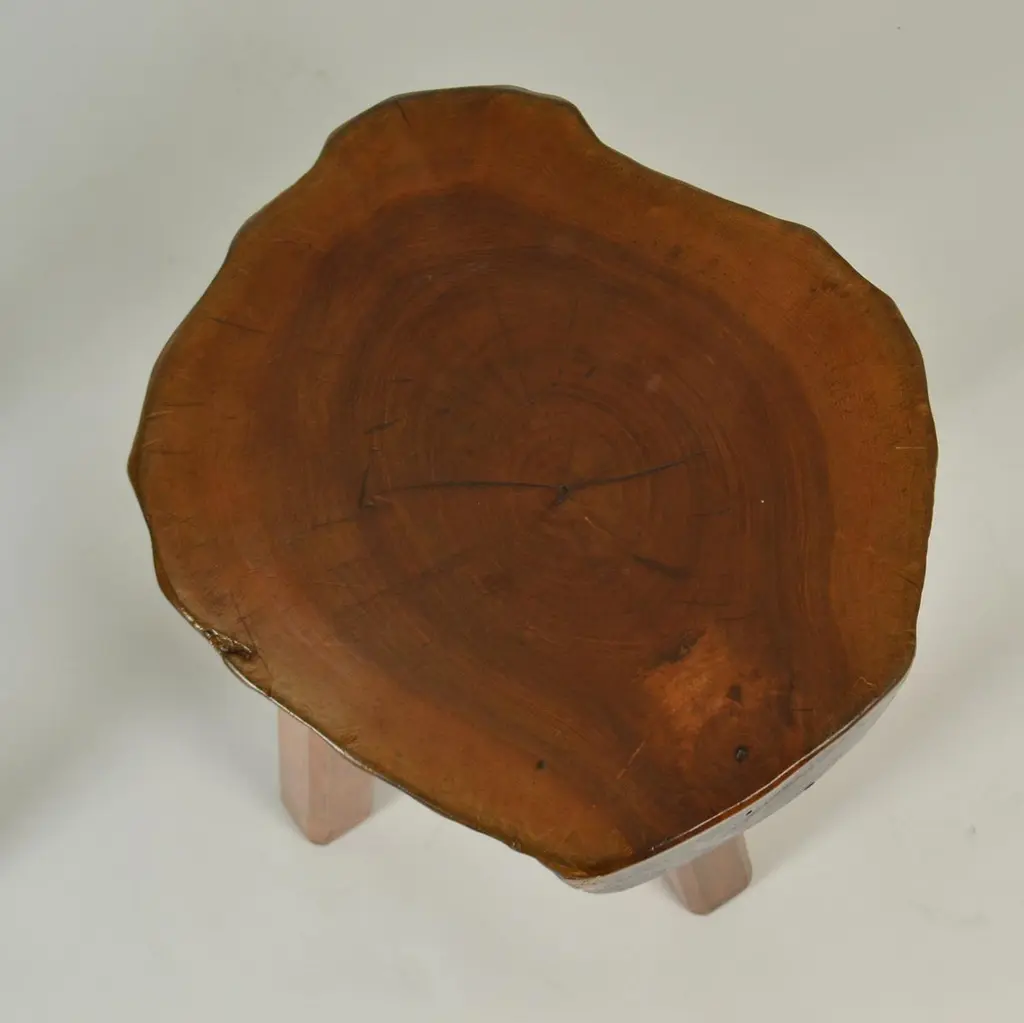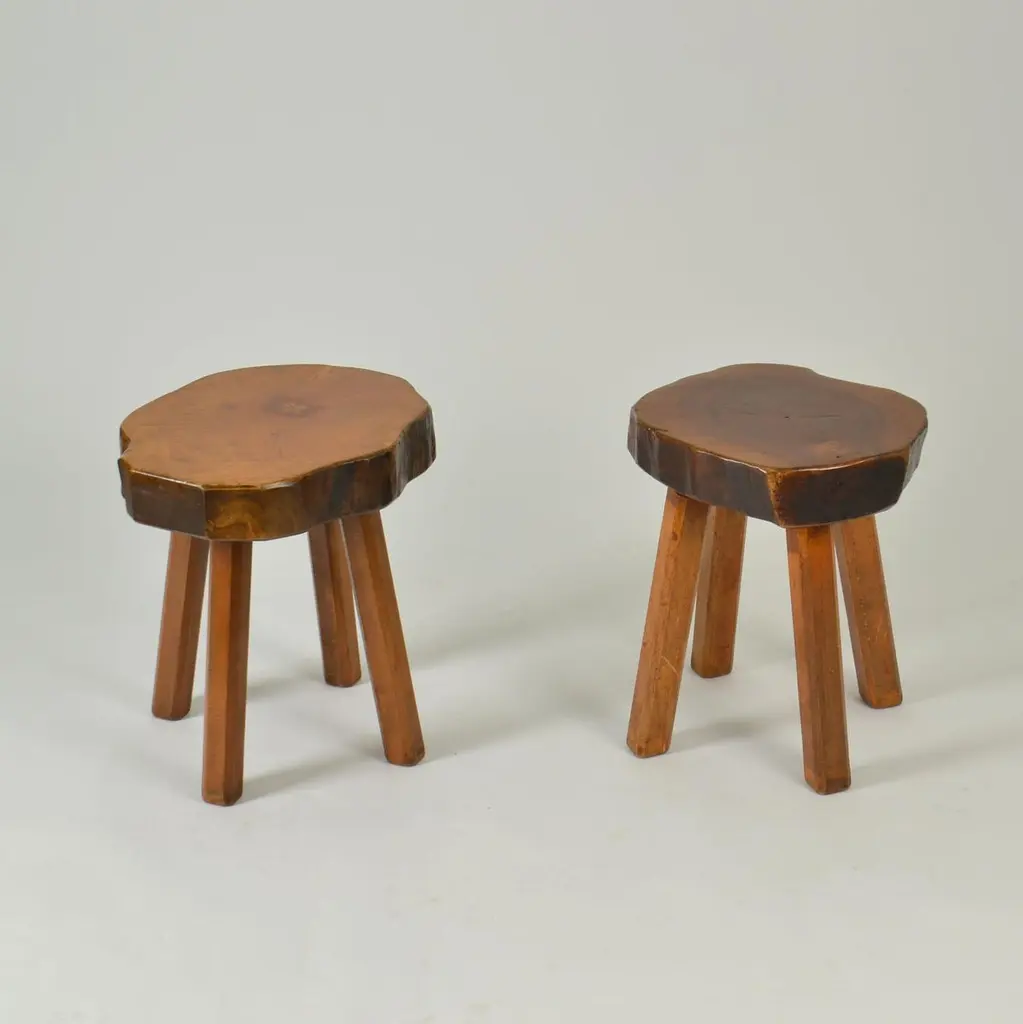 Pair of handcrafted side tables in Burr Elm wood 1970's. These stools have been handmade individually, therefore each stool is unique with a freeform shape seat using the natural contours of the wood. The voluptuous four legged tabless have a rustic alpine inspired style. These tables have acquired a nice patina commensurate with their age.Dimensions of individual tops are; 34 x 29 and 37 x 40 cm