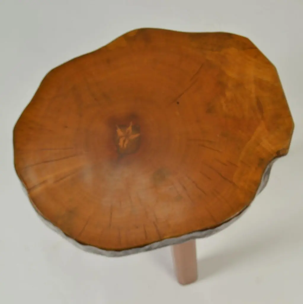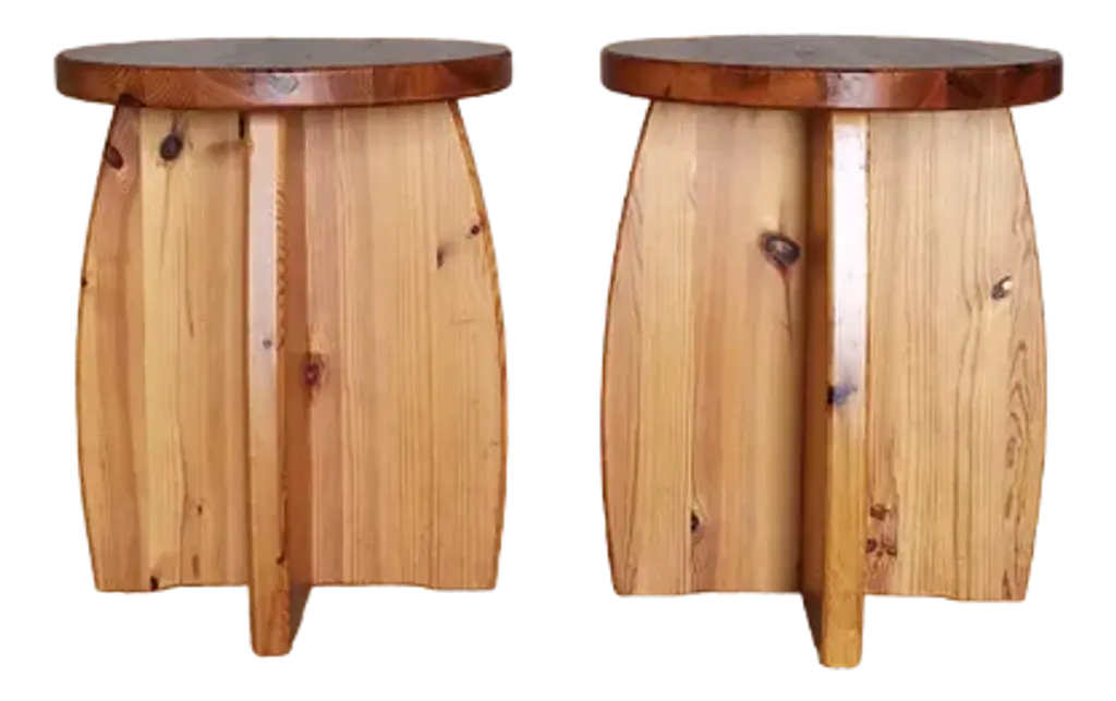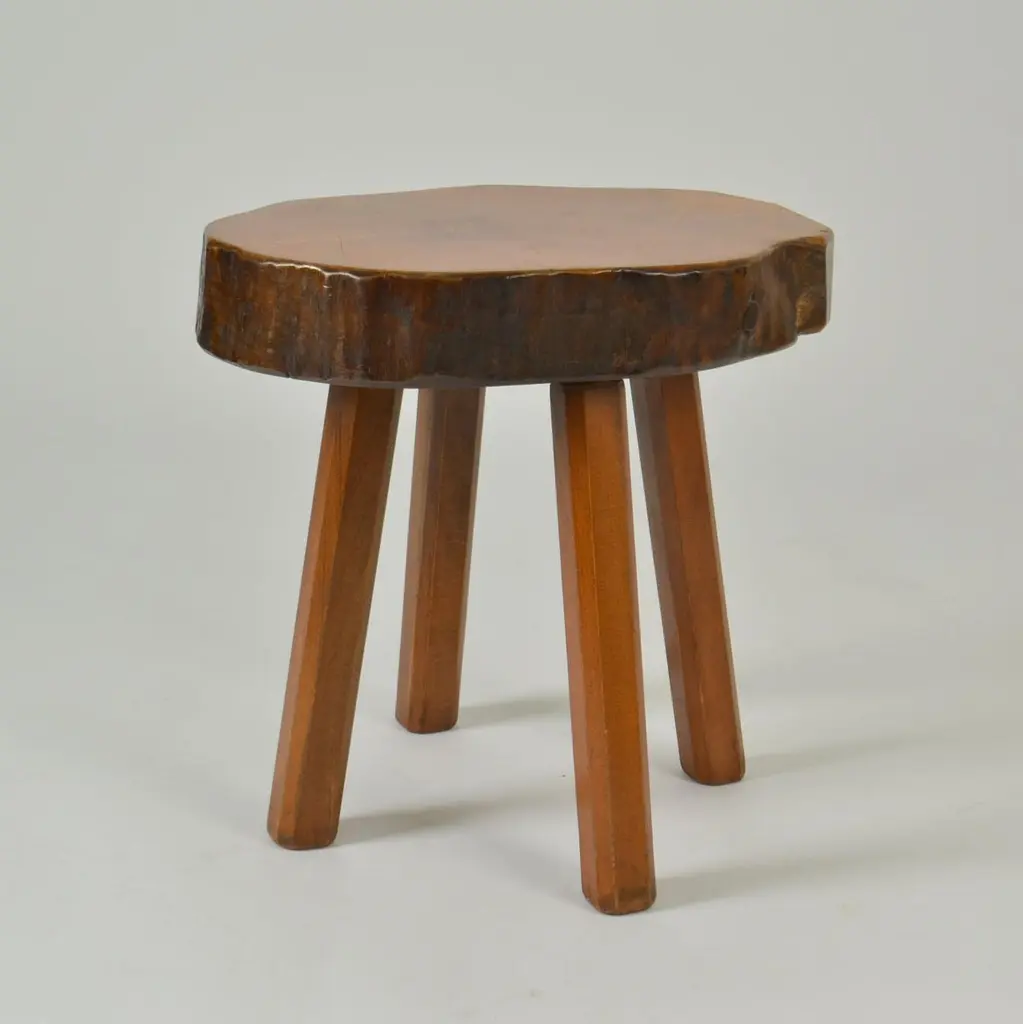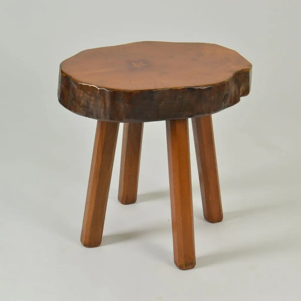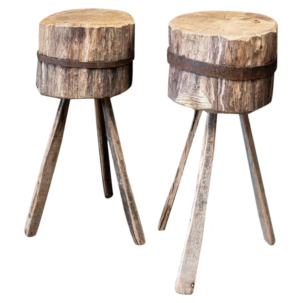 Pair of handcrafted side tables in Burr Elm wood 1970's. These stools have been handmade individually, therefore each stool is unique with a freeform shape seat using the natural contours of the wood. The voluptuous four legged tabless have a rustic alpine inspired style. These tables have acquired a nice patina commensurate with their age.Dimensions of individual tops are; 34 x 29 and 37 x 40 cm