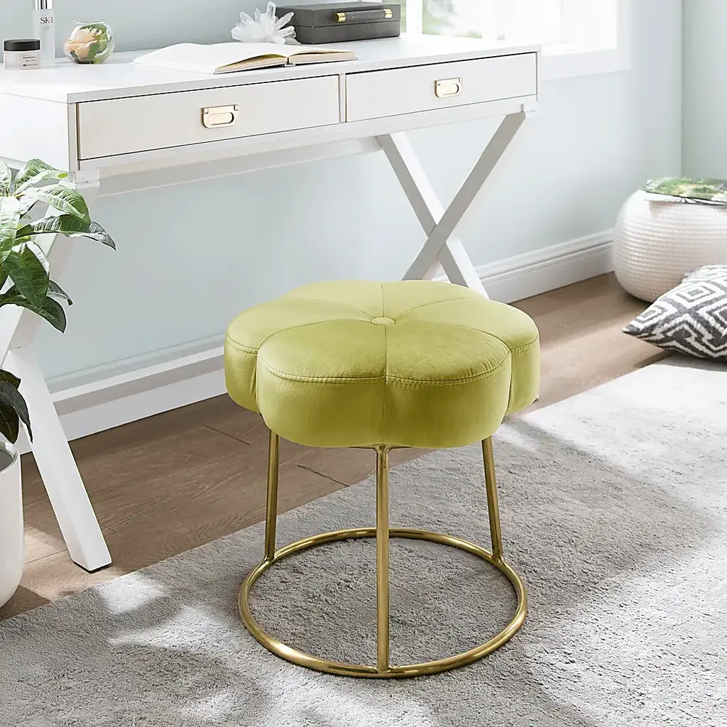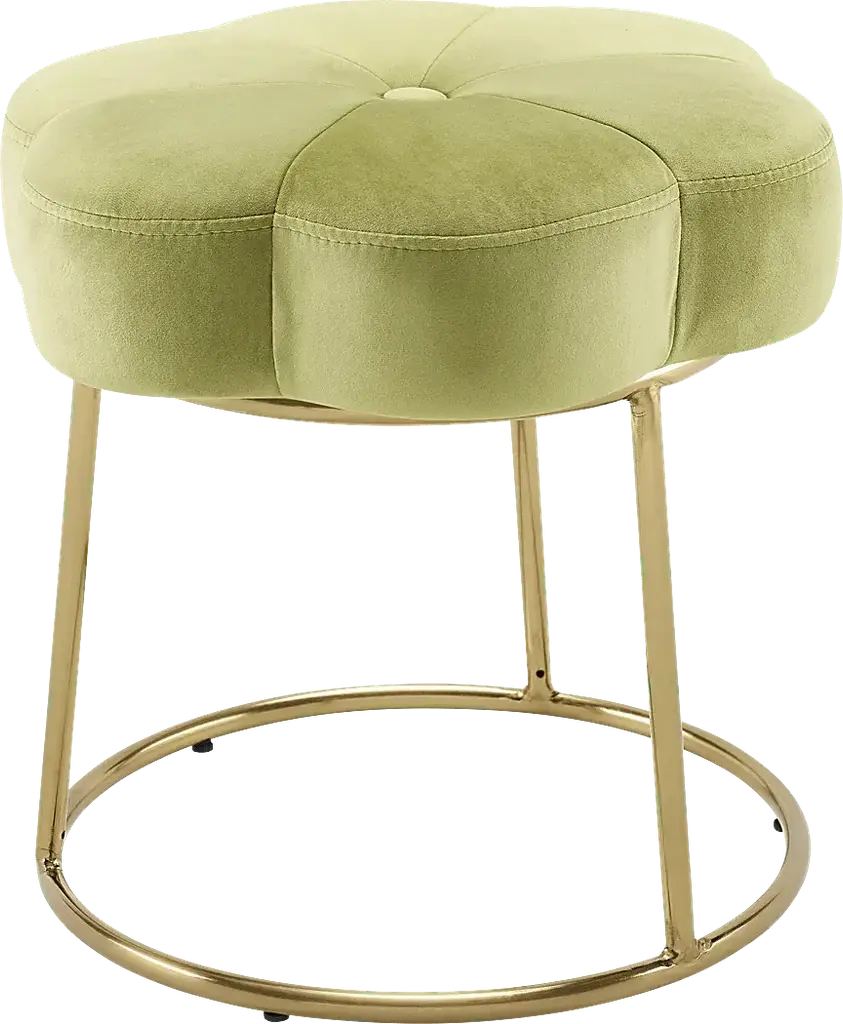 Inspired by boho design, the Silver Lane is a perfect pairing of minimal lines while still conveying a luxurious style. Plush light green velvet is used to create this subtle floral shape that offers soft padding for comfort. The foundation is an elegant gold color plated base. Sitting 17.75 Inches off the floor, this happy stool can fit under a make up vanity, bathroom prep table, desk or really, anywhere. Adds a welcomed pop of color to any room. Multiple colors to mix and match. Customer assembly is required.
