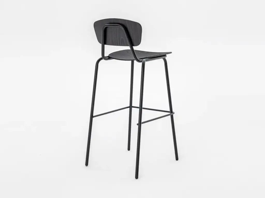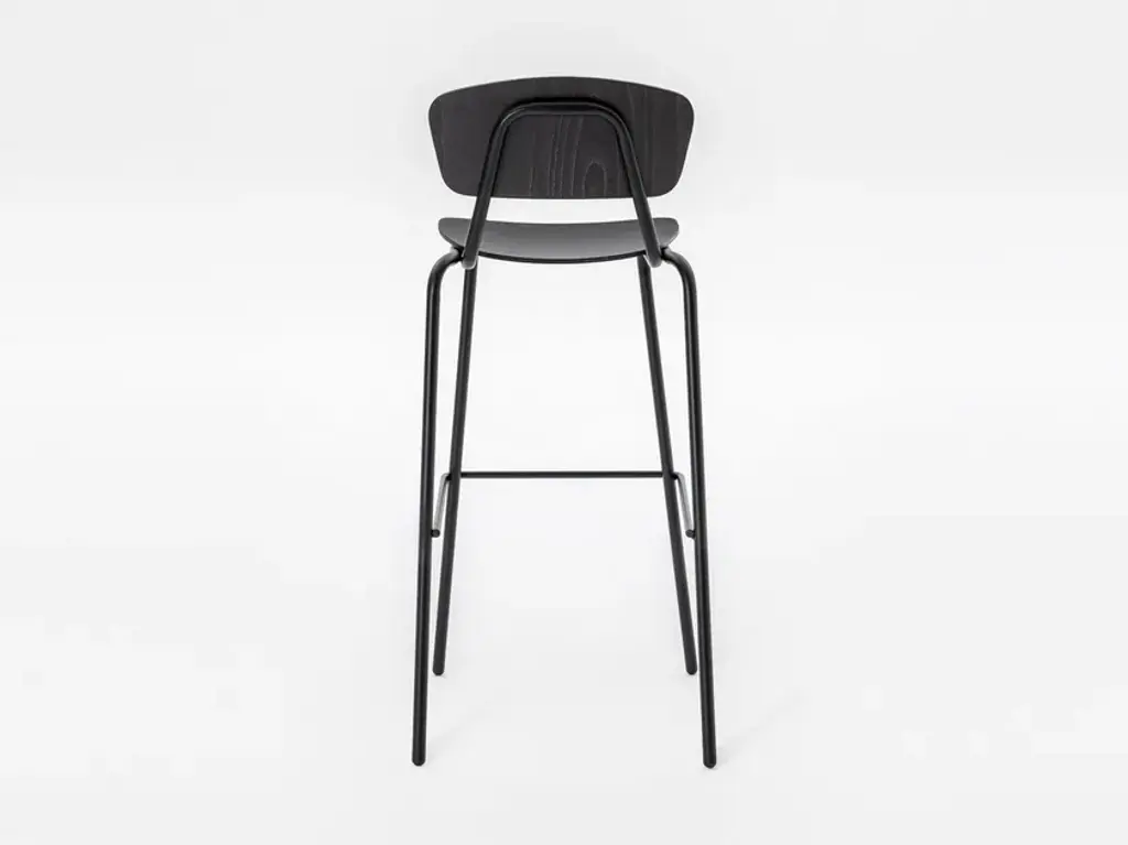 SIMPLE 105F is a stackable stool made of plywood and painted steel.Simple is a collection of seats designed for the Horeca world, which combines the simplicity and essentiality of forms with lightness and practicality. The strong connotation of the chairs typical of the Seventies combined with the “industrial” style that characterizes it, makes this seat suitable to be inserted both in modern and, at the same time, classic environments.Seat and backrest are made of black stained natural beech while the frame is made of sturdy steel. Light and stackable, it is ideal to furnish cafeterias, bakeries and restaurants but also domestic contexts.