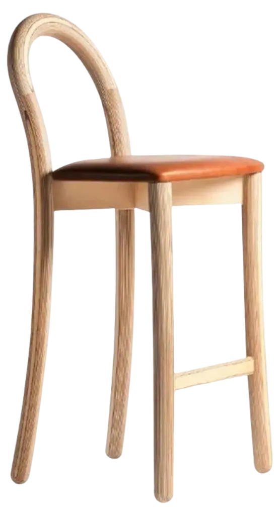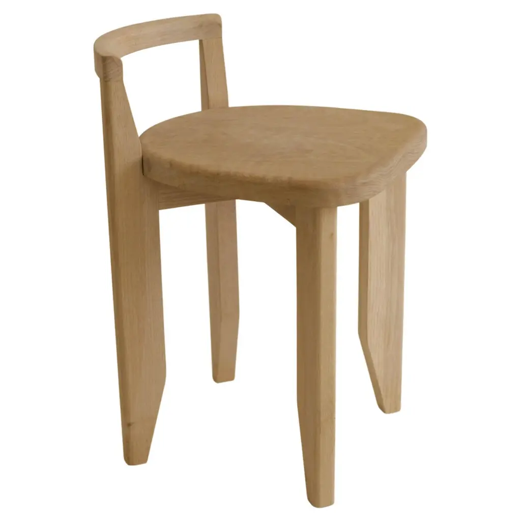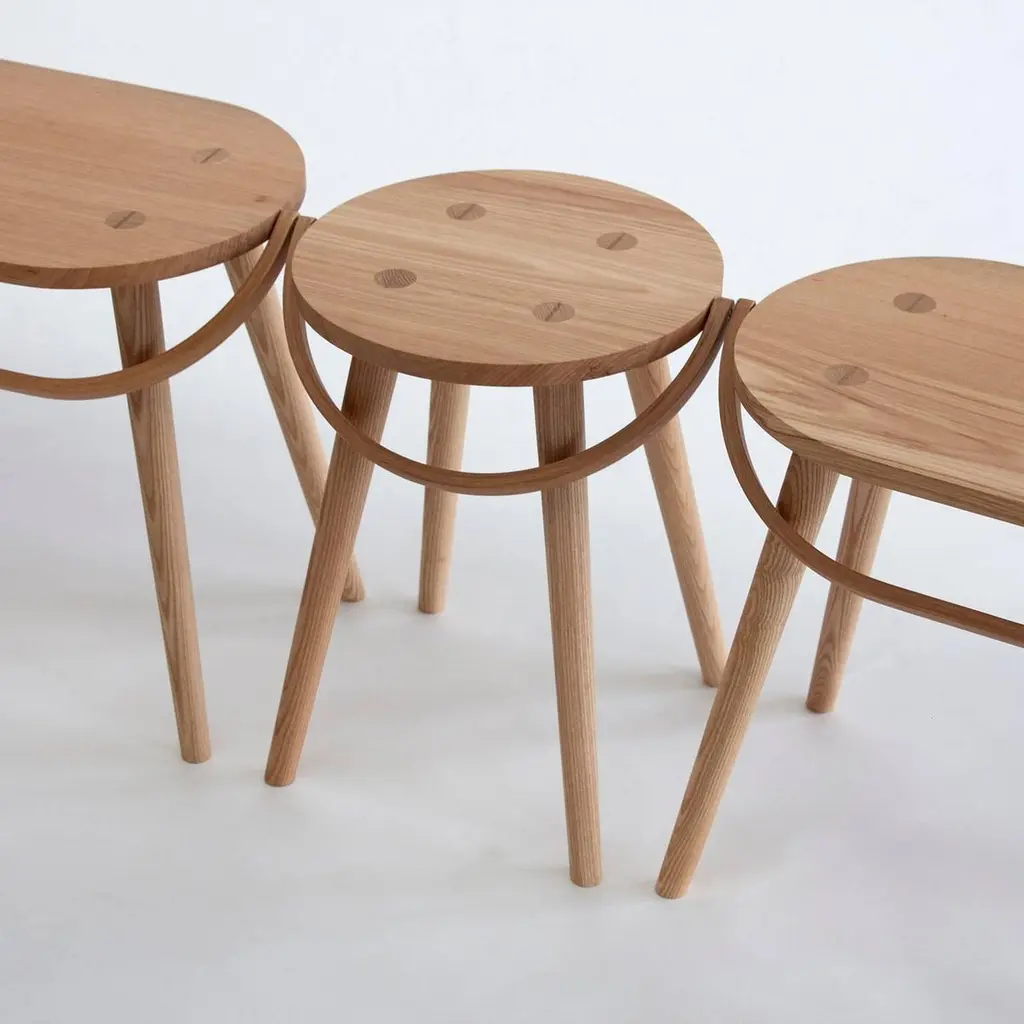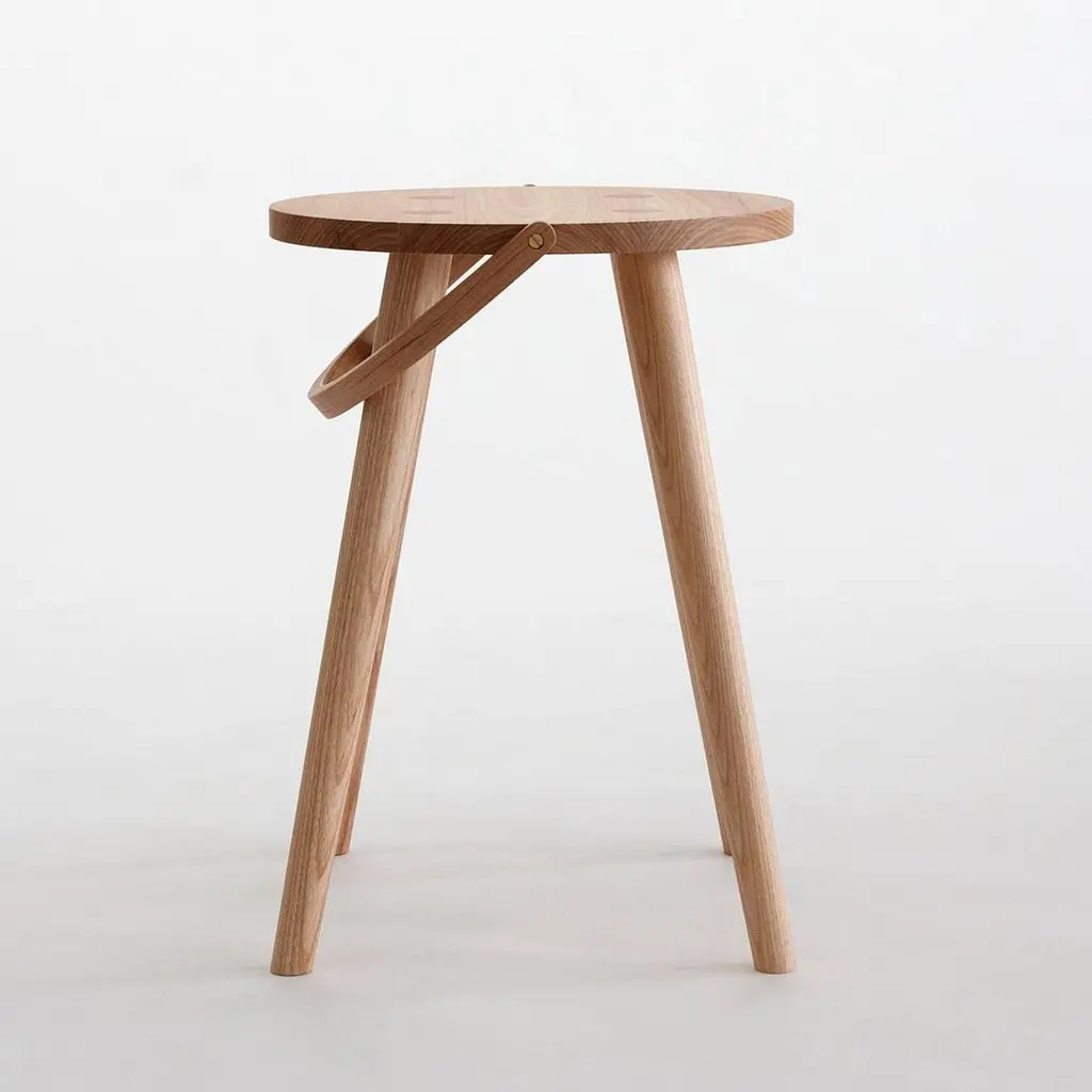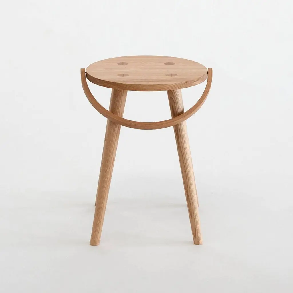 The Single Bucket Stool is a single sized, dining table height seat, or side table. The second of four versions from the Bucket Stools collection, a family of solid ash furniture featuring bentwood handles. These versatile pieces can function as either a seat or a side table, and their signature handles, which hug the contour of each top add a layer of functionality for easy transport or storage. Exposed tenons with wedge inserts join the legs to the top and accentuate both the craft and durability of it’s construction, a combination that creates a beautifully simple yet playful collection of functional objects well suited for a variety of interiors from restaurants and office spaces, to the home and anywhere in between. Designed in California by Yvonne Mouser and handmade by the Amish in Pennsylvania. Built from solid ash with a bentwood handle, matte finish and brass hardware.
