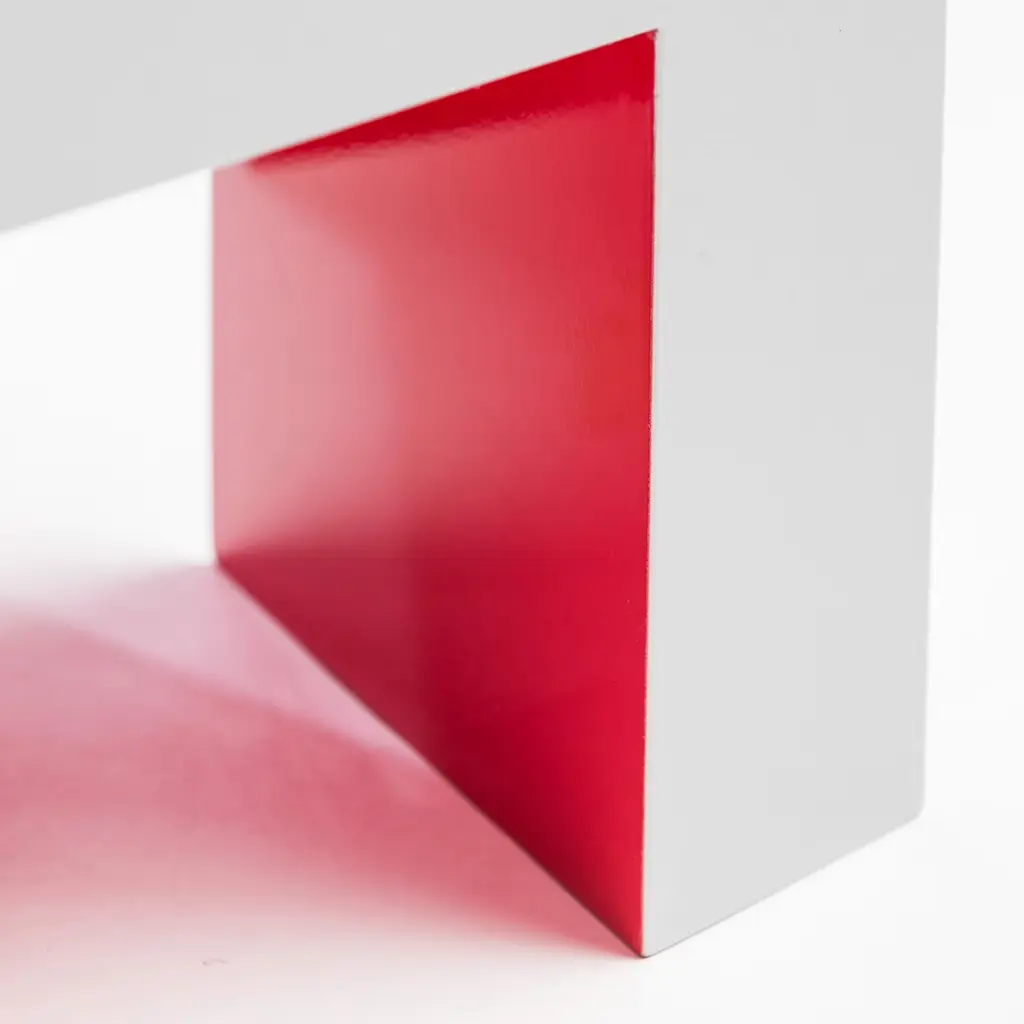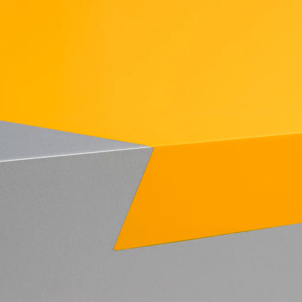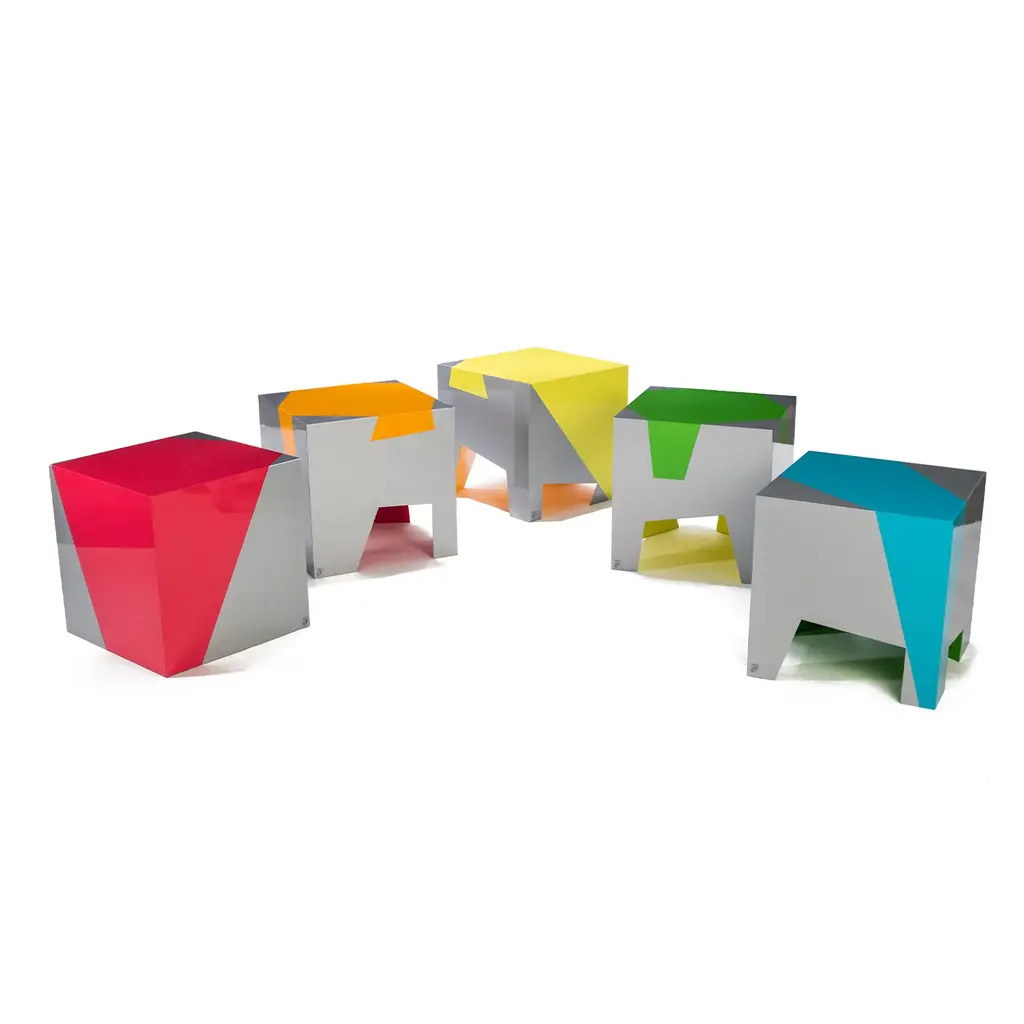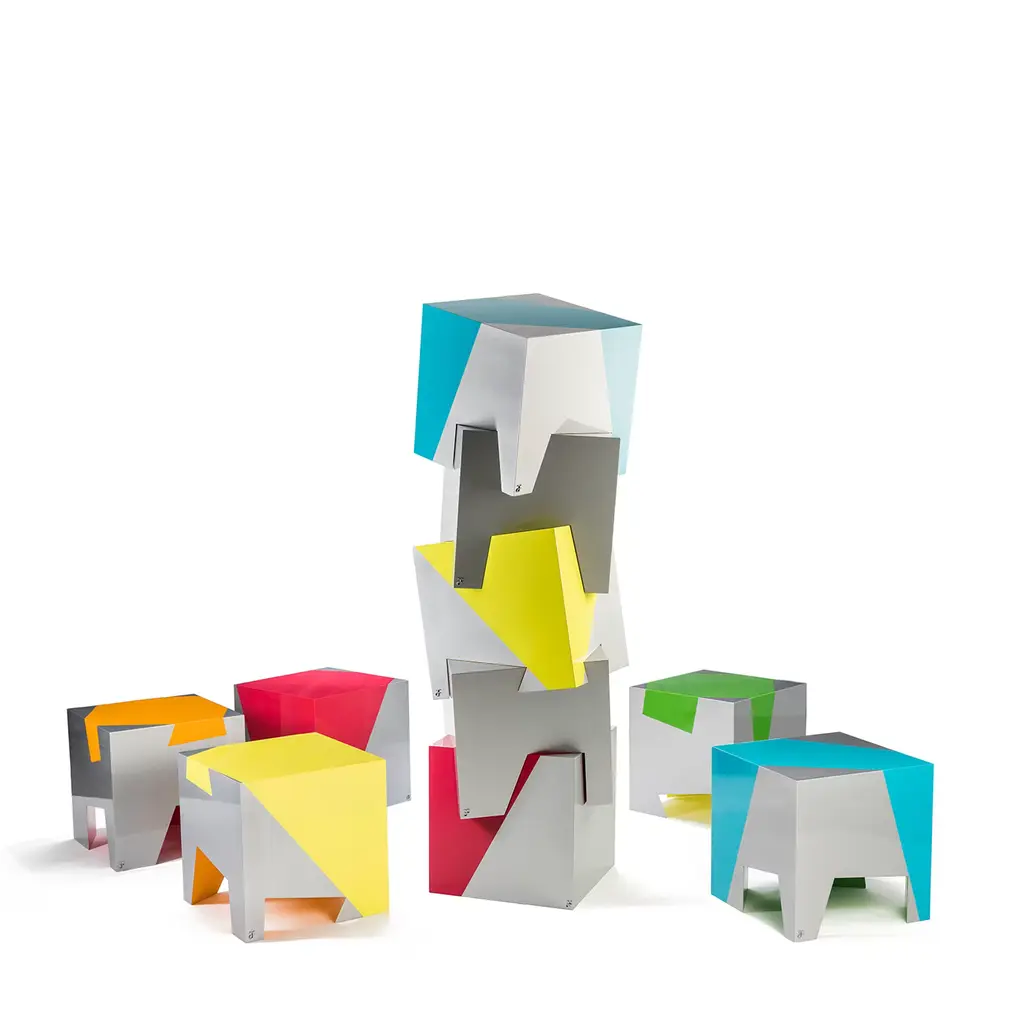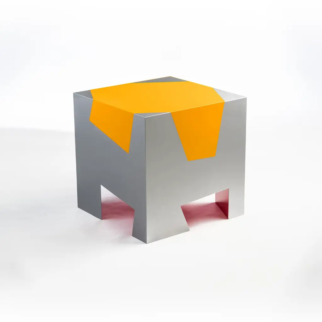 Combined with the other four interlocking elements from the same series to assemble an impactful decorative totem or displayed solo to provide an eccentric seating solution, this aluminum stool is sure to impress. Geometric lines offered in a distorted yet coherent ensemble and accented with vibrant shades of red and yellow enliven its cubic silhouette, completed by mismatching different feet. Made-to-order using handmade, artisan methods.