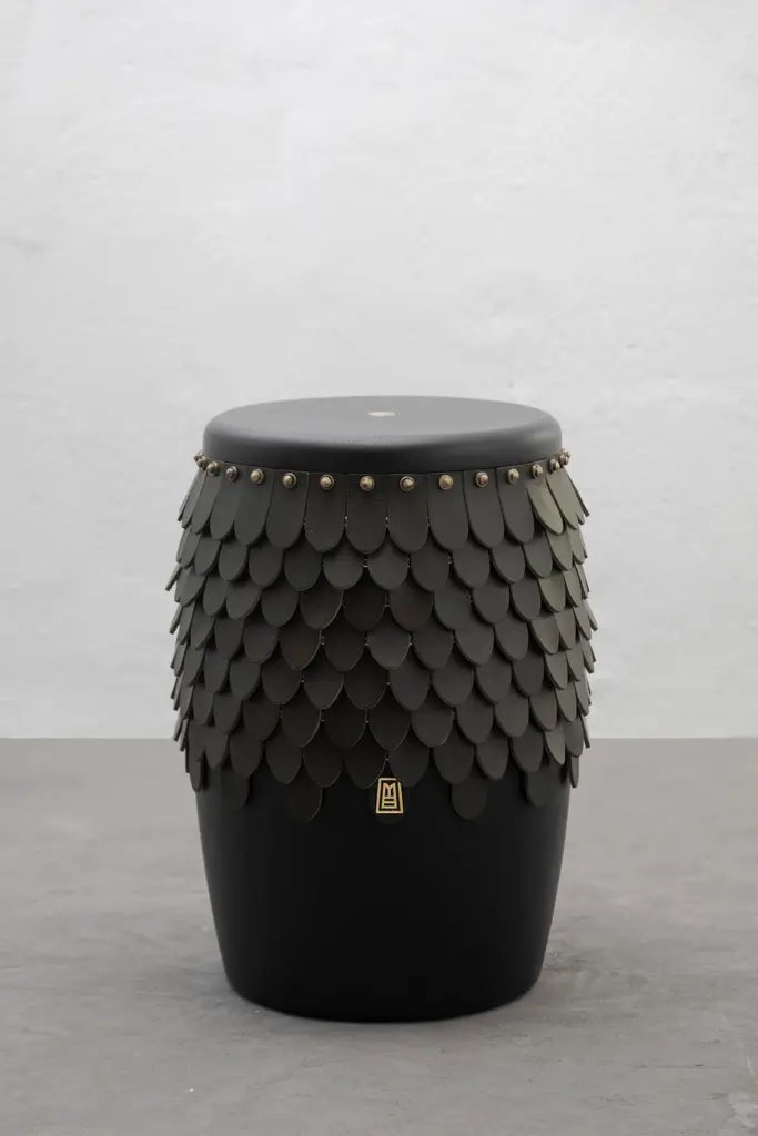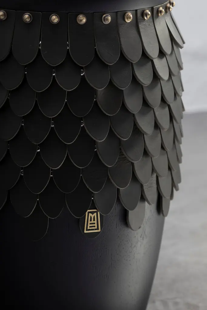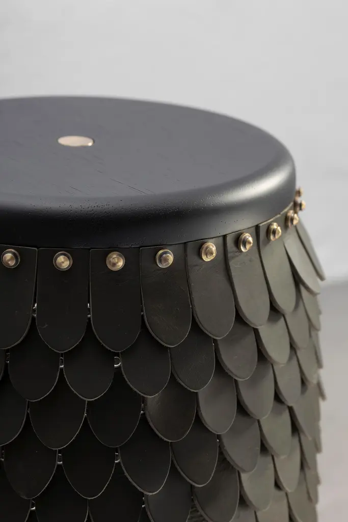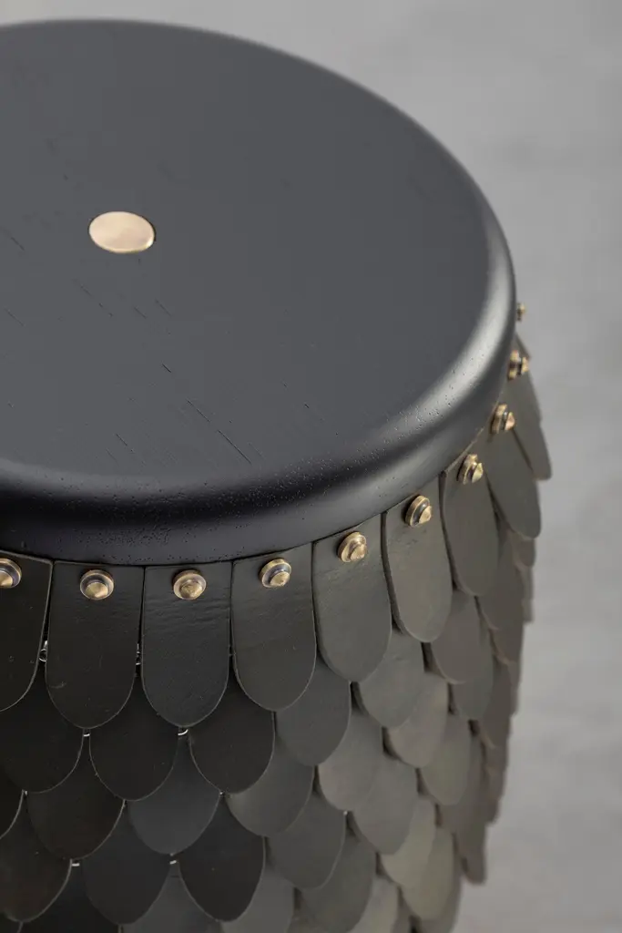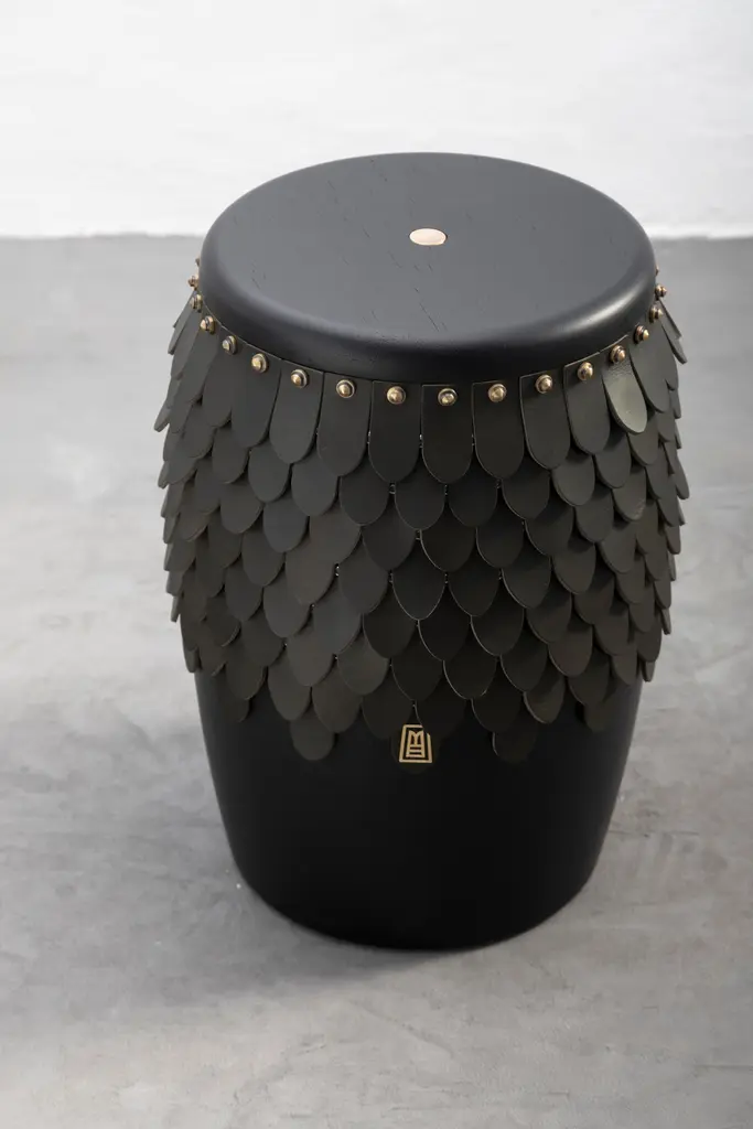 Stool crafted from solid Seike wood with Ébano finish, featuring thick leather accents, and aged bronze or stainless steel CNC-lathed hardware.Our SITIERA_01 stool and side table embodies our commitment to conscious design, reflected not only in our relationship with artisans and suppliers but also in our use of noble materials. ANDEAN primarily utilizes thick, natural Ecuadorian leather, carefully selecting the finest cowhides for our furniture and home décor. The SITIERA_01 stool and side table represent an effort to maximize material use. Through this exploration, we created a tribute to the Condor, our national symbol, by incorporating feather-like leather accents. This design maintains the visual language of Ecuadorian iconography while adding animalistic elements to the anthropomorphized sculptural piece.SITIERA is ANDEAN's second high-end residential furniture collection. Focused on seating and decorative mirrors, it is an exploration of the baroque and sacral archetypes that capture the essence of Quito's historic center art and architecture.The designs explore the relationship between contemporary organic forms with baroque-inspired details. Depicting iconography and symbols present in the sculptures and altarpieces found in Quito's colonial-era churches, monasteries, and convents. The collection is a tribute to the significant role the Baroque School of Quito played in shaping our material heritage and culture.ANDEAN studio’s practice is an exploration that highlights Ecuador's iconography and our Latin American essence. New items will be added to our ongoing collections every year, each bearing our equatorial design stamp and a distinct aesthetic.ARTISANSWashington Romero: WoodworkingEdison Simbaña: Bronze and Stainless Steel CNC Lathe