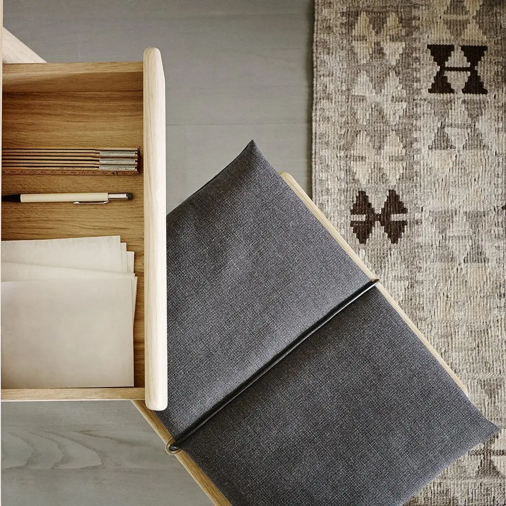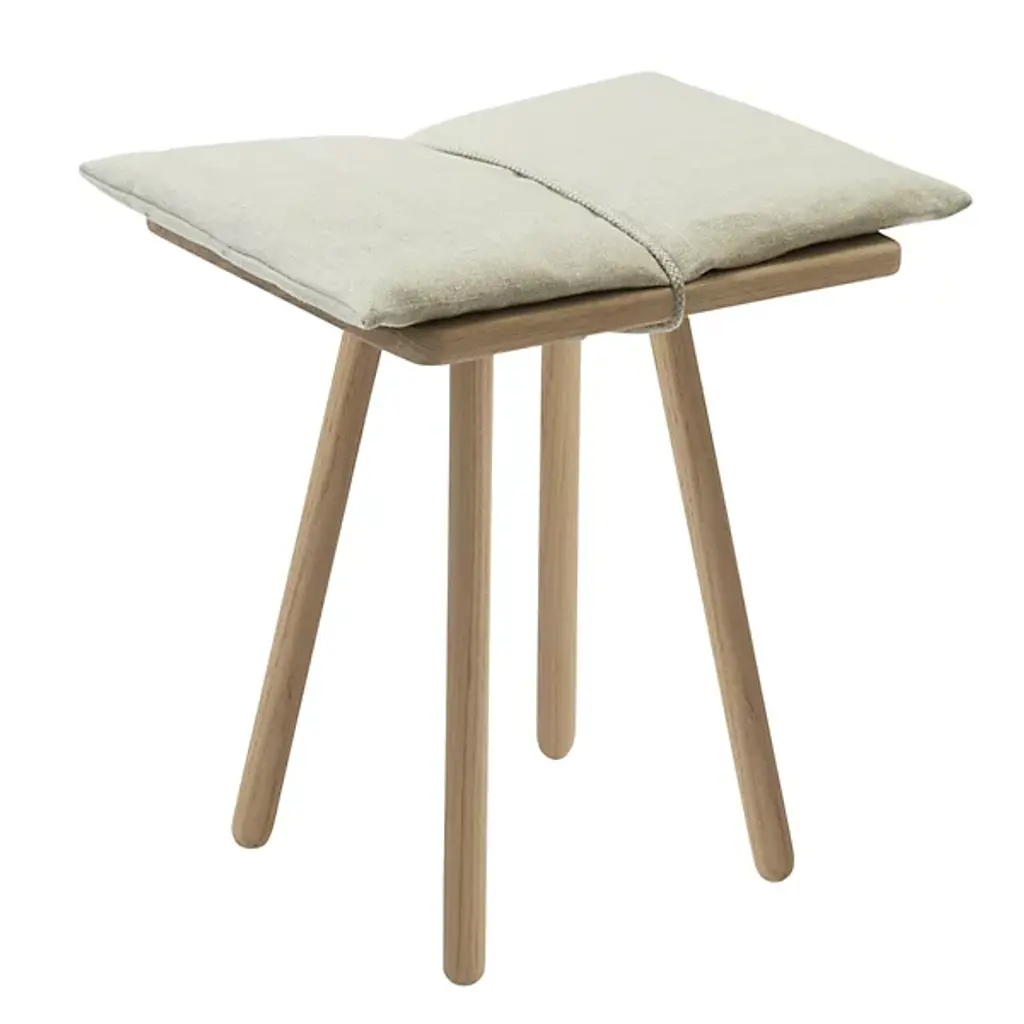 The Georg collection, designed by Chris L. Halstrom, is inspired by the need to store, hang and drop things off in the hallway of a home. The stool is part of design museum Trapholts permanent collection, it is a back-up seat designed in a material encounter between wood, wool and leather in an expression in between Nordic sensuality and Japanese minimalism. The stool is a piece of furniture in its own right - for why not use the back-up furniture instead of storing it out of sight?