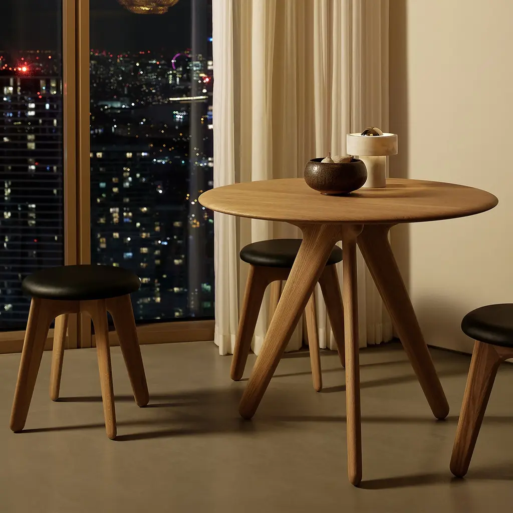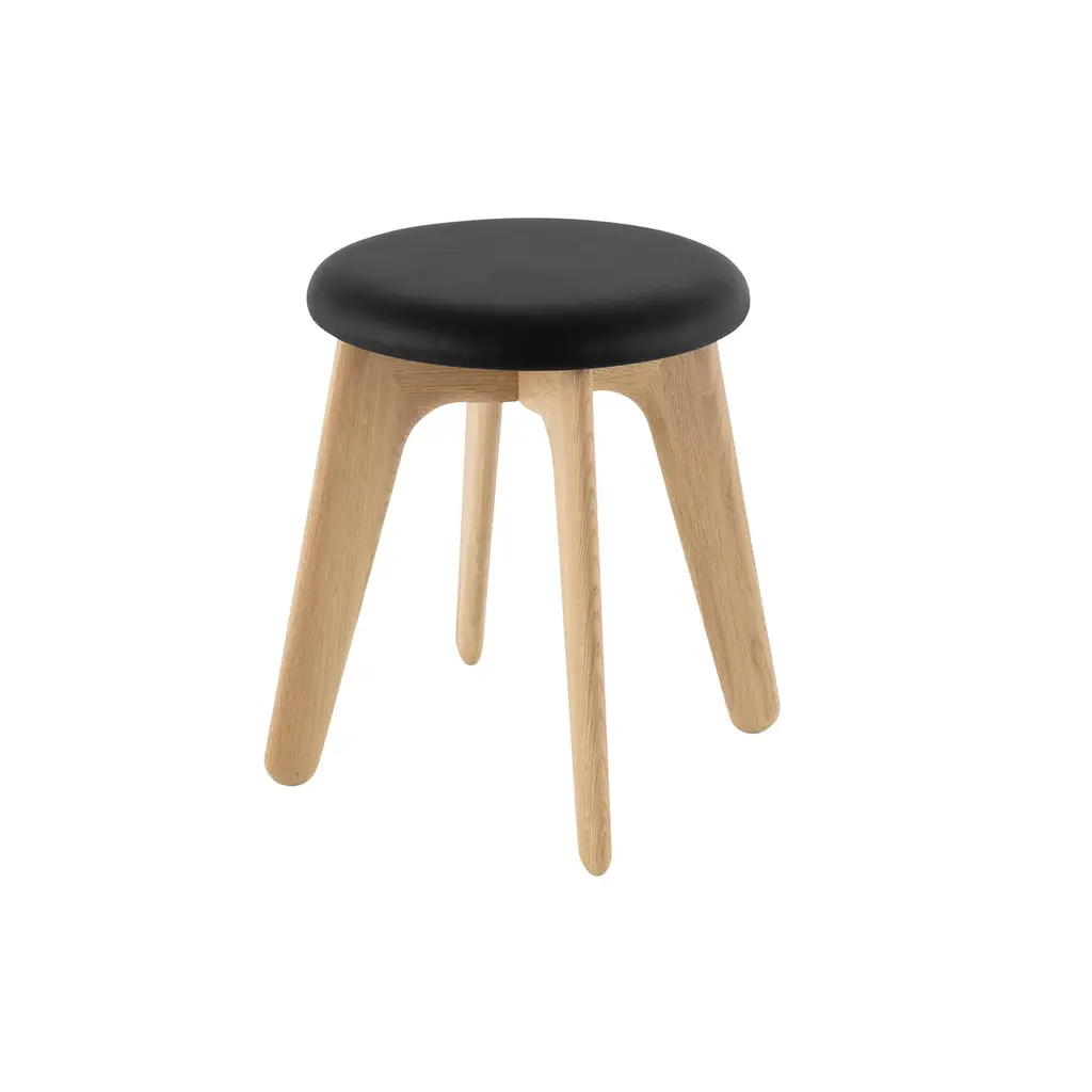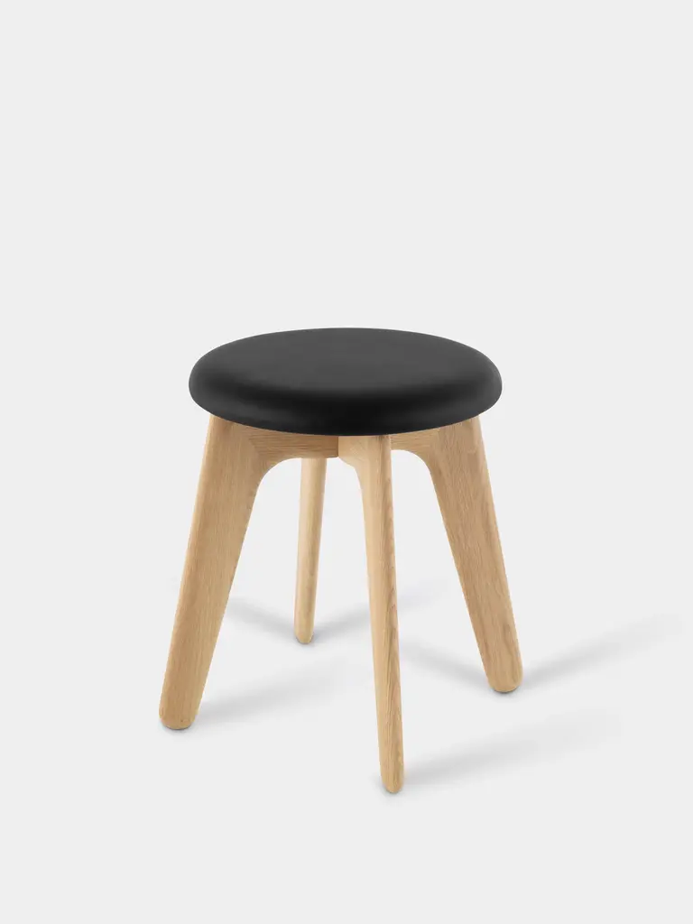 Tom Dixon’s forthright take on a wooden stool brings an addition to his Slab collection, made from solid oak and sourced from sustainably-managed timber. In either black or natural oak, the surface of the wood is deeply brushed to expose its natural grain and the seat is crafted with a gently radius edge with an upholstered leather seat.