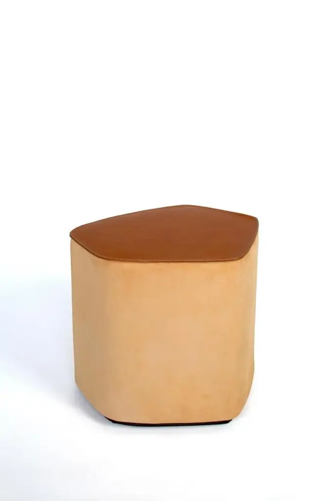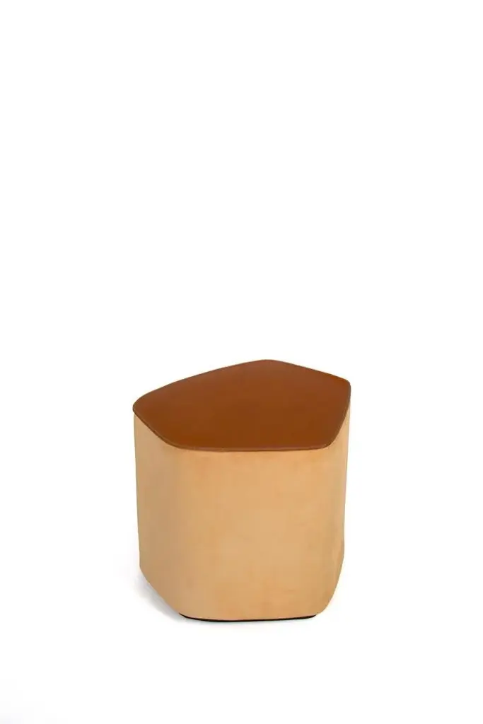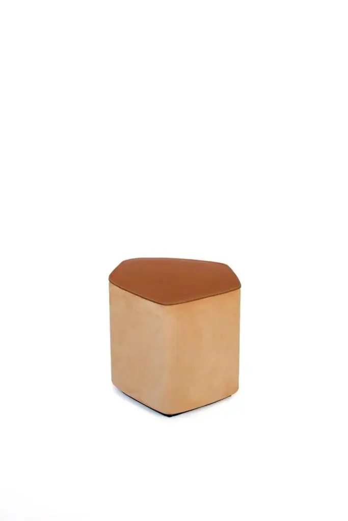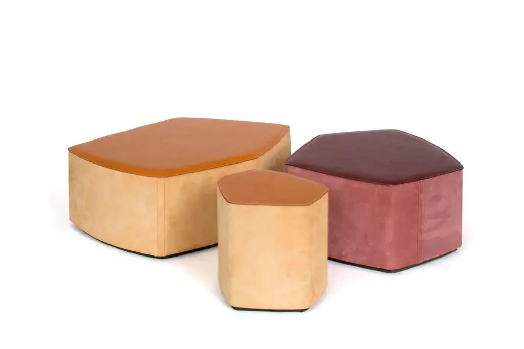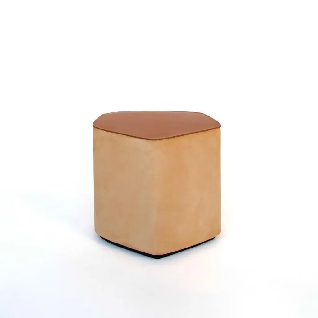 Small pouf! leather stool by nestor perkal dimensions: w 45 x d 39 x h 40 cm materials: leather, poplar plywood, suede. Available in other colors and in 3 sizes. The pouf! collection is made up of three seats made of leather and suede. They look like diamonds, minerals or the footprints of an animal in the soil. They are suitable for home furnishing, in the office or in a public place. Genuine italian vegetable-tanned leather, colours as per available range. Vegetable-tanned suede?; colours as per available range. Non-distortable expanded polyurethane filling in various densities. Base in stained poplar plywood. This piece is attributed to the mentioned designer/maker. It has no attribution mark and no official proof of authenticity, however it is well documented in design history. I take full responsibility for any authenticity issues arising from misattribution