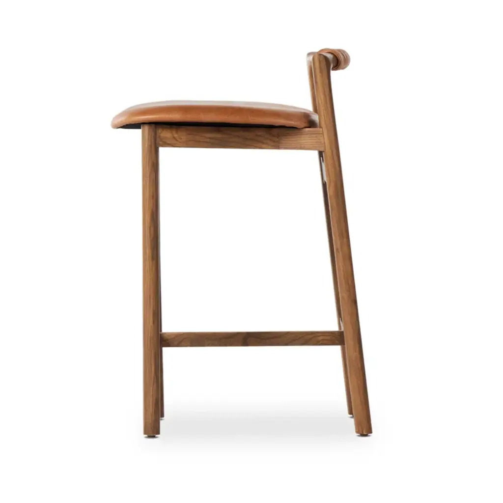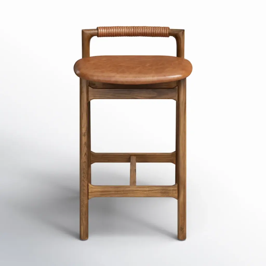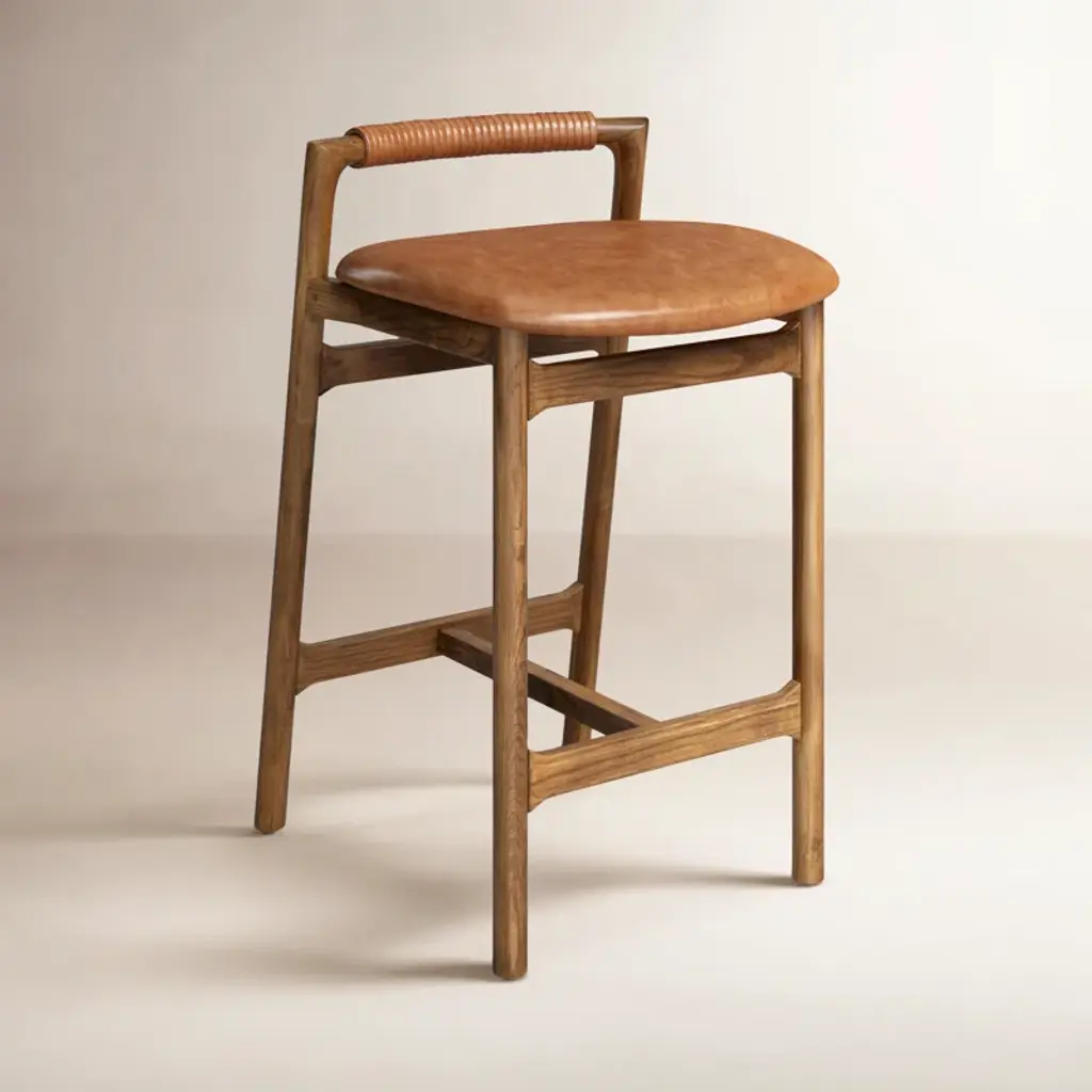 Design-forward with a minimalist frame, this stool features an upholstered seat and a low back with leather wrap detailing. Our stool has been finished to highlight the naturally rich variance in color and feel across each piece.