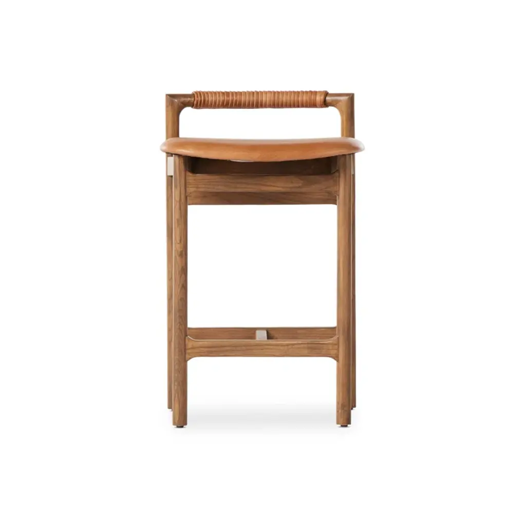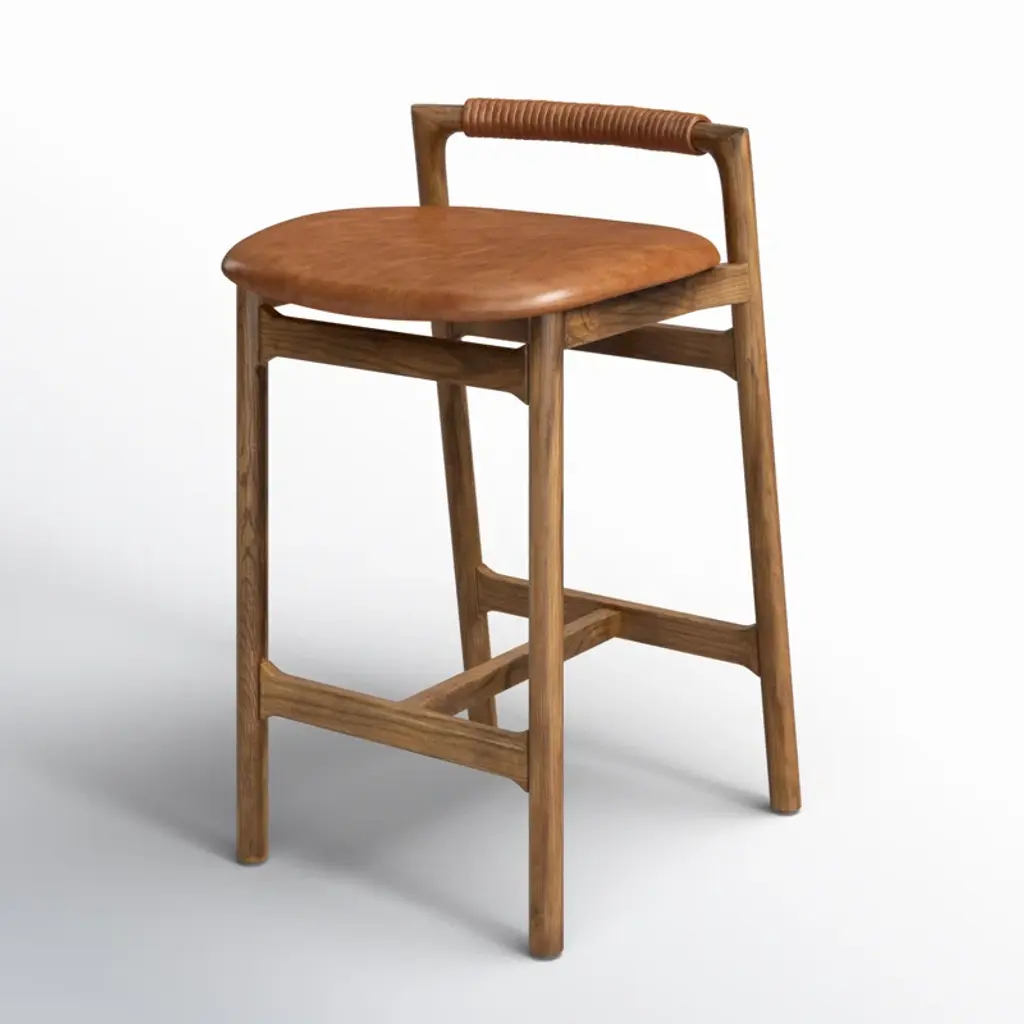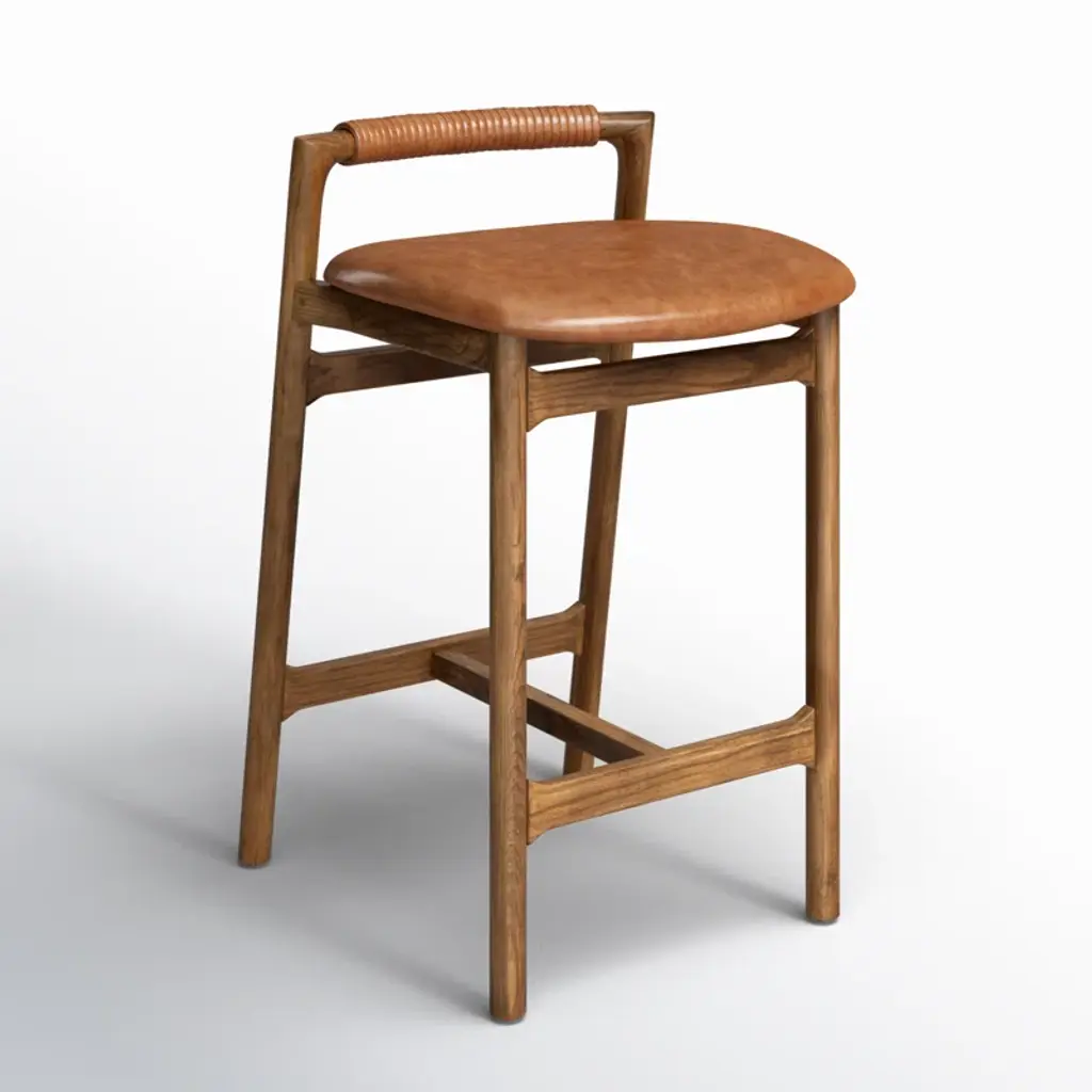 Design-forward with a minimalist frame, this stool features an upholstered seat and a low back with leather wrap detailing. Our stool has been finished to highlight the naturally rich variance in color and feel across each piece.