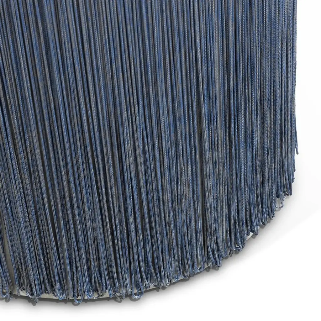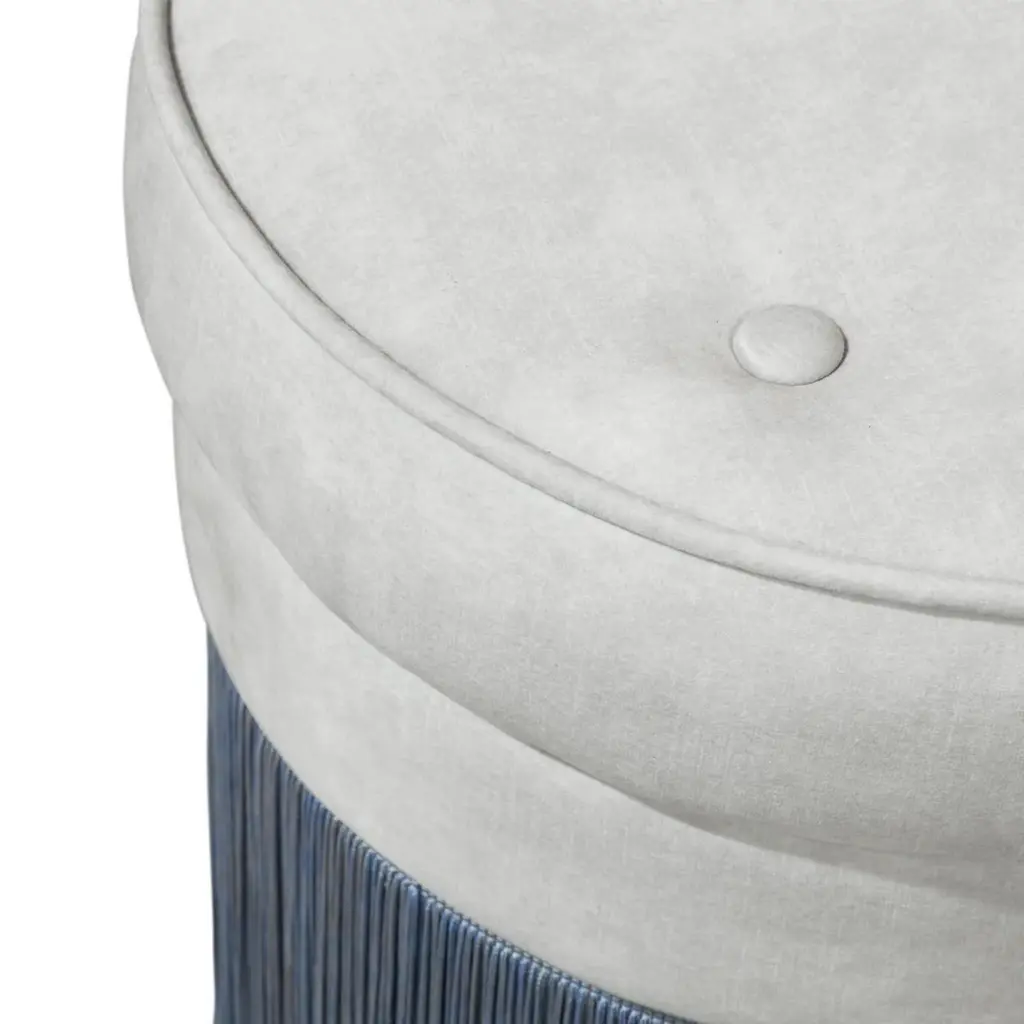 Each of these fashionable pouf stools feature their own unique combination of contrasting materials. One of a trio of KOKET pouf designs, the tailored button tufted seats, satin brass belts and flowing fringed skirts make this lovely lady the perfect accent seat whether standing alone or in a group.Materials & Finishes:Upholstery: COM - Customer's Own Material (Firenze Pearl 01 from KKbyKOKET Textiles Collection)Upholstery Base: COM - Customer's Own Material (Firenze Pearl 01 from KKbyKOKET Textiles Collection)Base Detail: Bullion Tassel Sophia (Blue)Clean & Care: Care for textiles by vacuuming or lightly brushing. Maintain textiles by keeping them away from direct sunlight. Rotate and flip cushions when vacuuming for even wear. The nap of high pile textiles such as velvets may become crushed or lose its original pile height. We recommend light steaming to lift the pile to its original height. The textile should also be brushed with a de-linting brush to maintain its pile. Water based or solvent cleaner may cause discoloration or staining. We recommend that stained or soiled textiles be professionally cleaned.