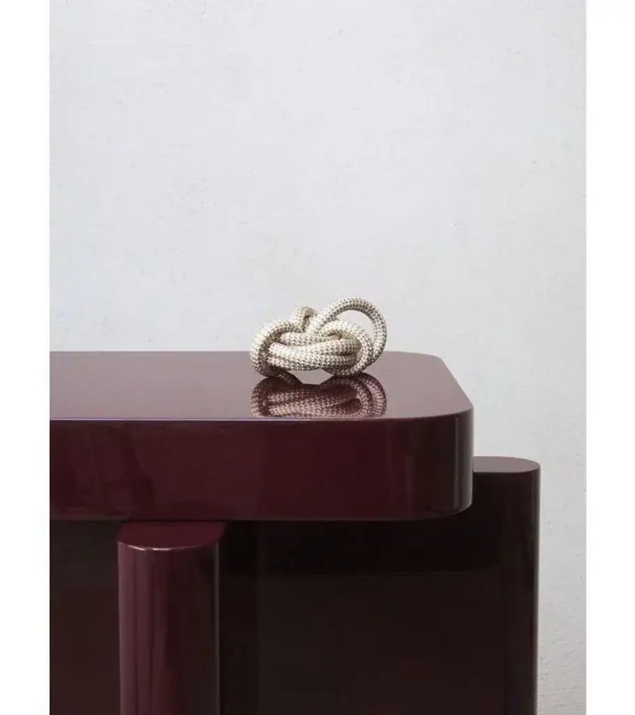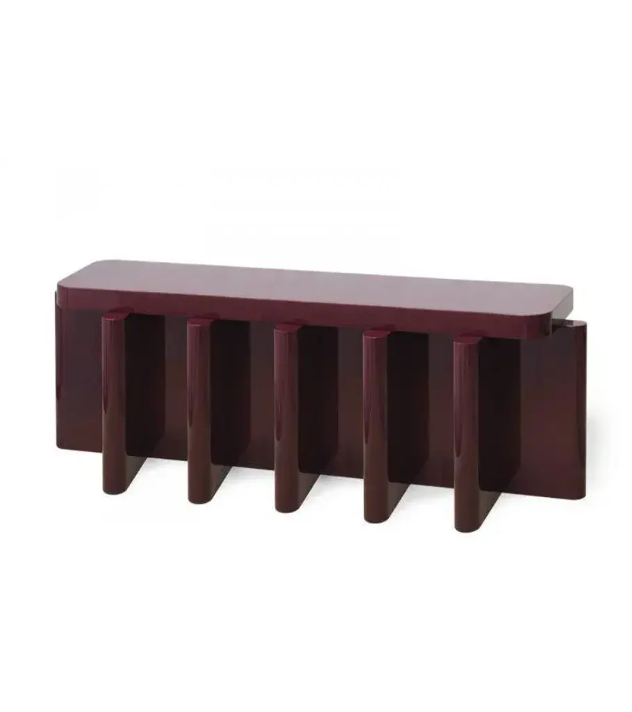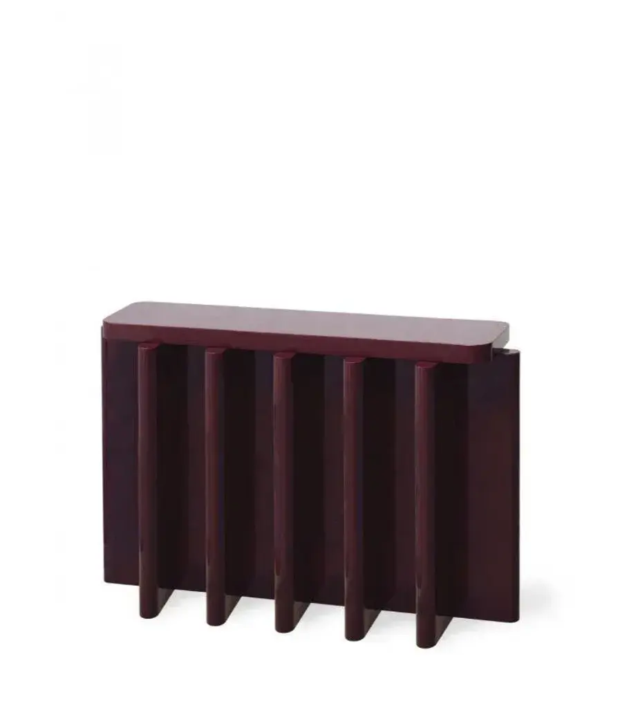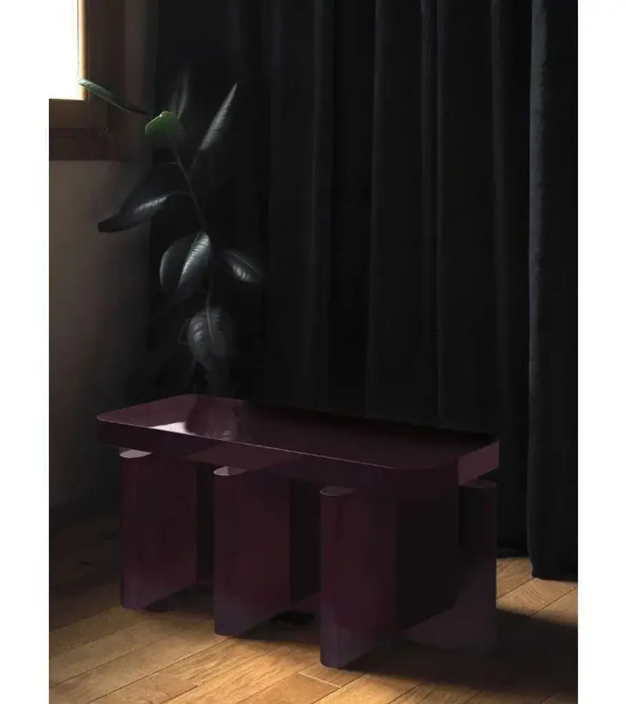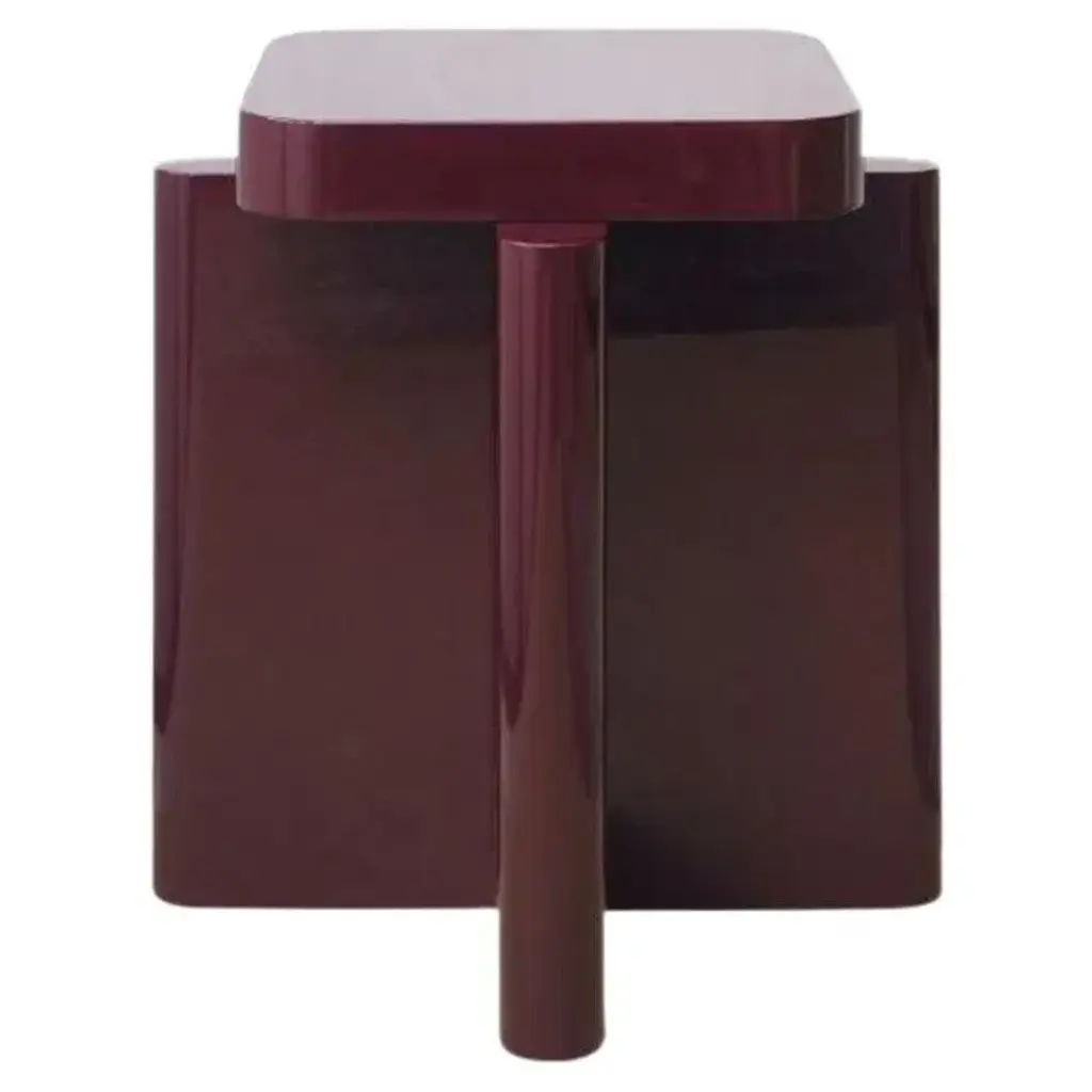 Spina t1.1 table/stool by cara davide dimensions: d 40 x w 40 x h 45 cm materials: solid nut wood, lacquered mdf. Also available in colors: bordeaux, caramel, dusty red, off-white, and natural wood. Spina is a collection of lacquered tables and seatings. The lacquered surfaces and consistent rhythm of the planes create a visual play of light, shadow, and reflection, adding depth and richness to this already visually graphic collection. The elements of the line are characterized by a dense skeletal base that supports a smaller horizontal plane along its axis. The thicknesses and proportions of the intersecting vertical planes visually saturate the space underneath its top, creating heaviness as if they were the pedestal for the horizontal plane. There is a visual hierarchy from the heavy plinth to the offset top plane and then to what gets displayed upon its surface. The notion of stacked objects and planes makes it a sort of altar with a totemic and primitive depiction. The collection is now composed of 4 elements in 4 lacquered gloss finishing colors. this piece is attributed to the mentioned designer/maker. It has no attribution mark and no official proof of authenticity, however it is well documented in design history. I take full responsibility for any authenticity issues arising from misattribution