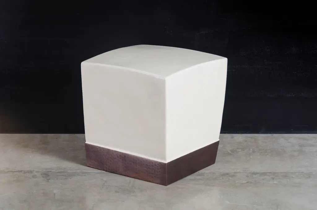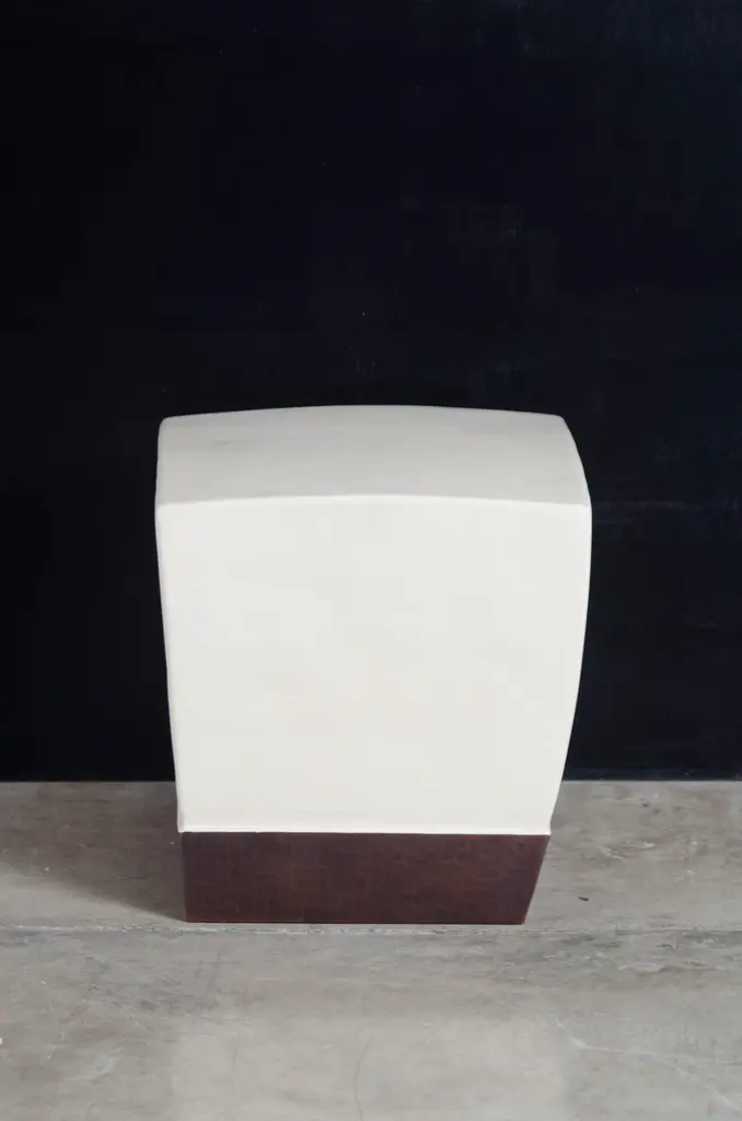Square crown drumstoolCream lacquerAntique copperHand repousseLimited EditionLacquer is a technique that dates back to the Shang dynasty, circa 1600-1100 B.C. These pieces are made with at least 60 coats of organic lacquer. Each layer of lacquer is applied with a curing period of 24 hours in between so that it can dry.Repousse´ is the traditional art of hand-hammering decorative relief onto sheet metal. The technique originated around 800 BC between Asia and Europe and in Chinese historical context, it began early as the Han Dynasty (206BC-AD220). The technique involves using a Hammer and various shaping tools.