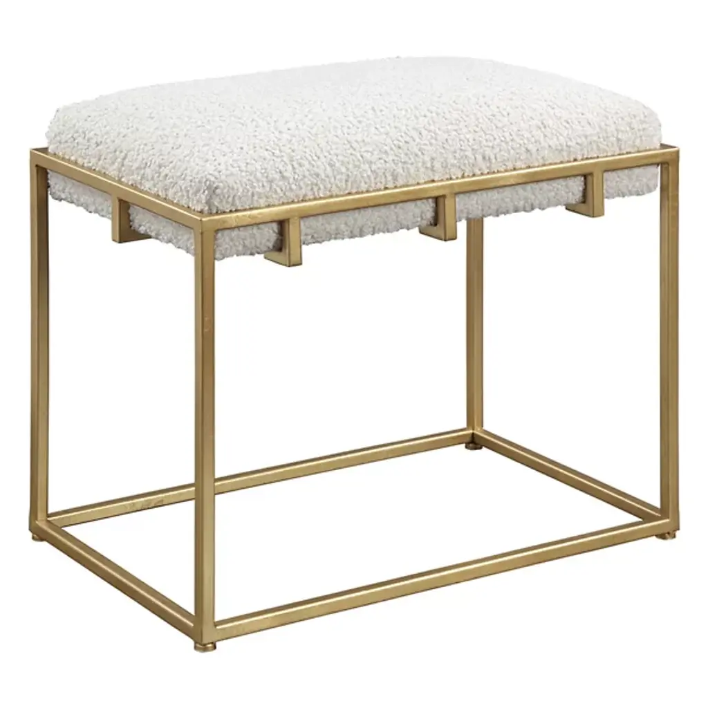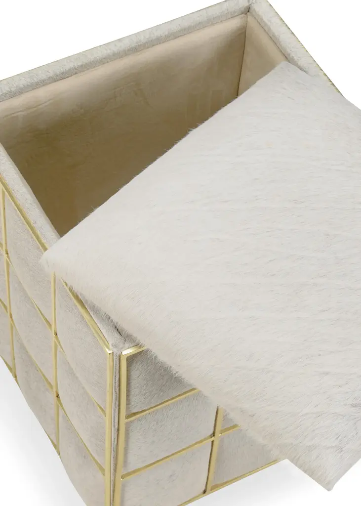 The square hide ottoman has a brass square motif on light gray hair on hide. This rustic modern ottoman can be pulled up to any seating group and is best used as a group of 3. The top lifts off for storage.