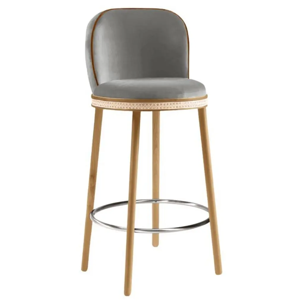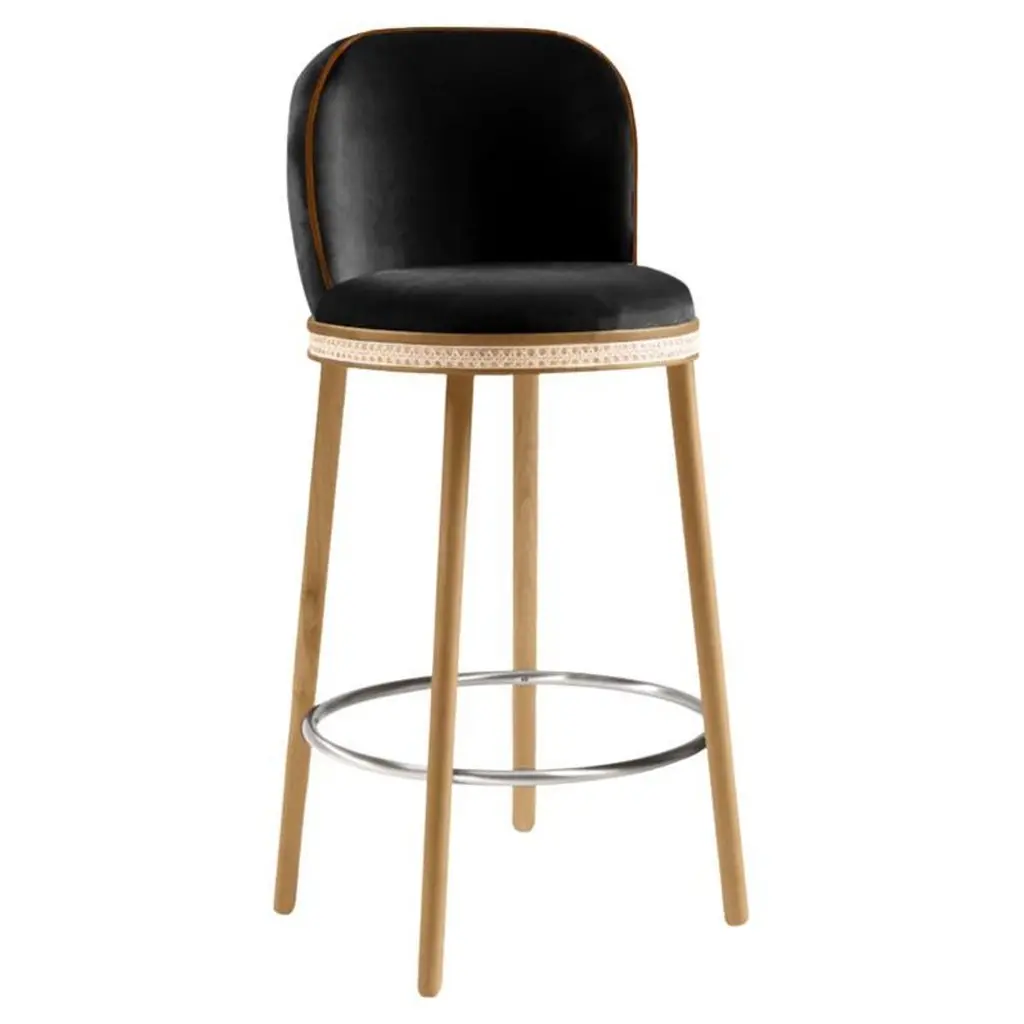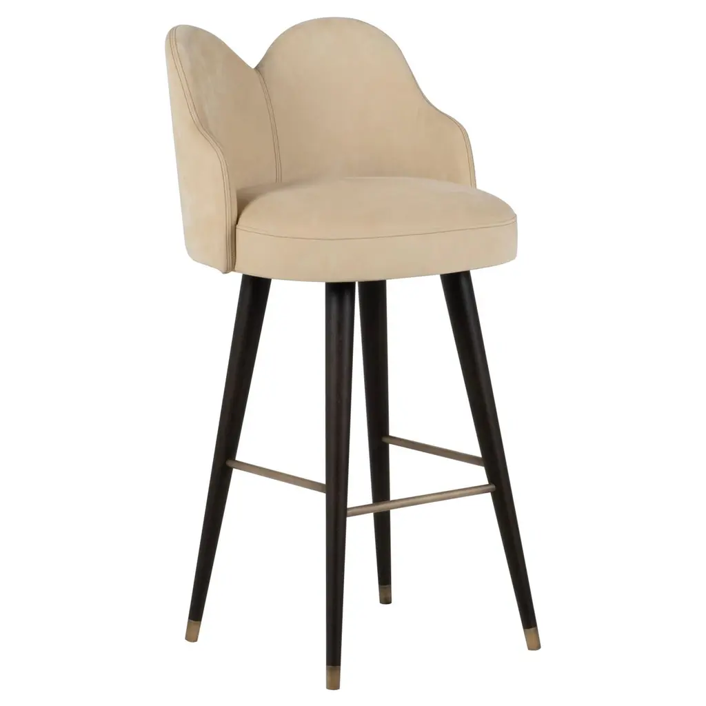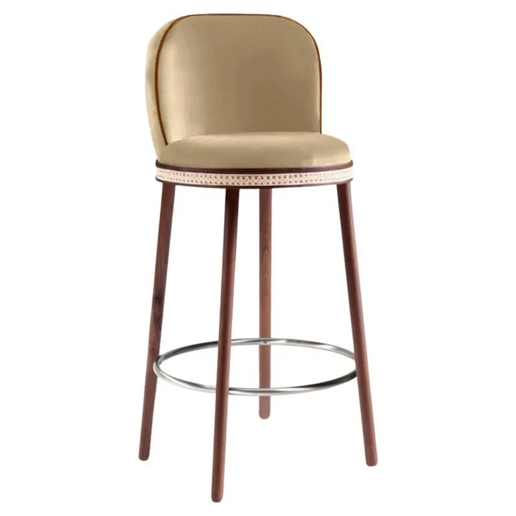 A stool with an external backrest in fabric, and an internal backrest and seat available in either fabric or leather. The stool features metal legs, adding a contemporary and sturdy touch to the design. This piece combines comfort and style, offering a versatile choice of materials for both the backrest and seat to suit different prefeences and interiors.