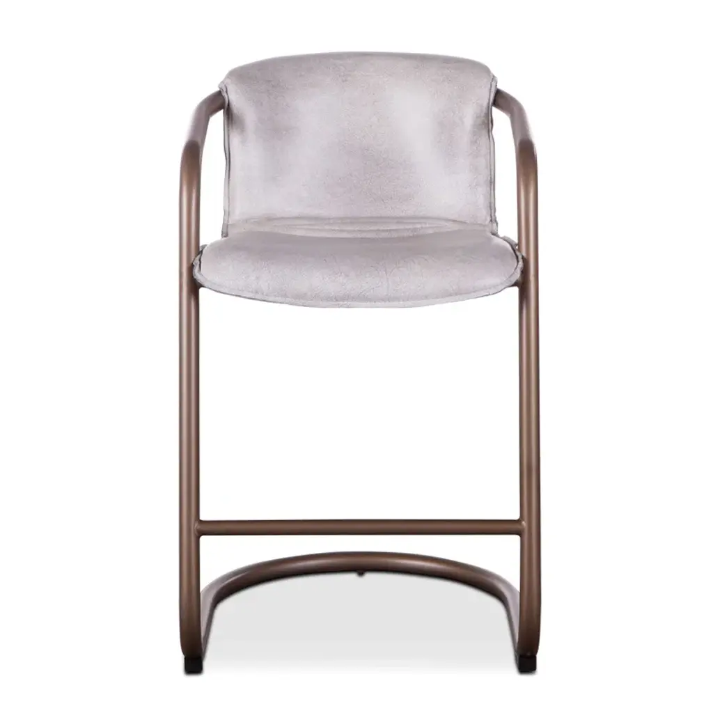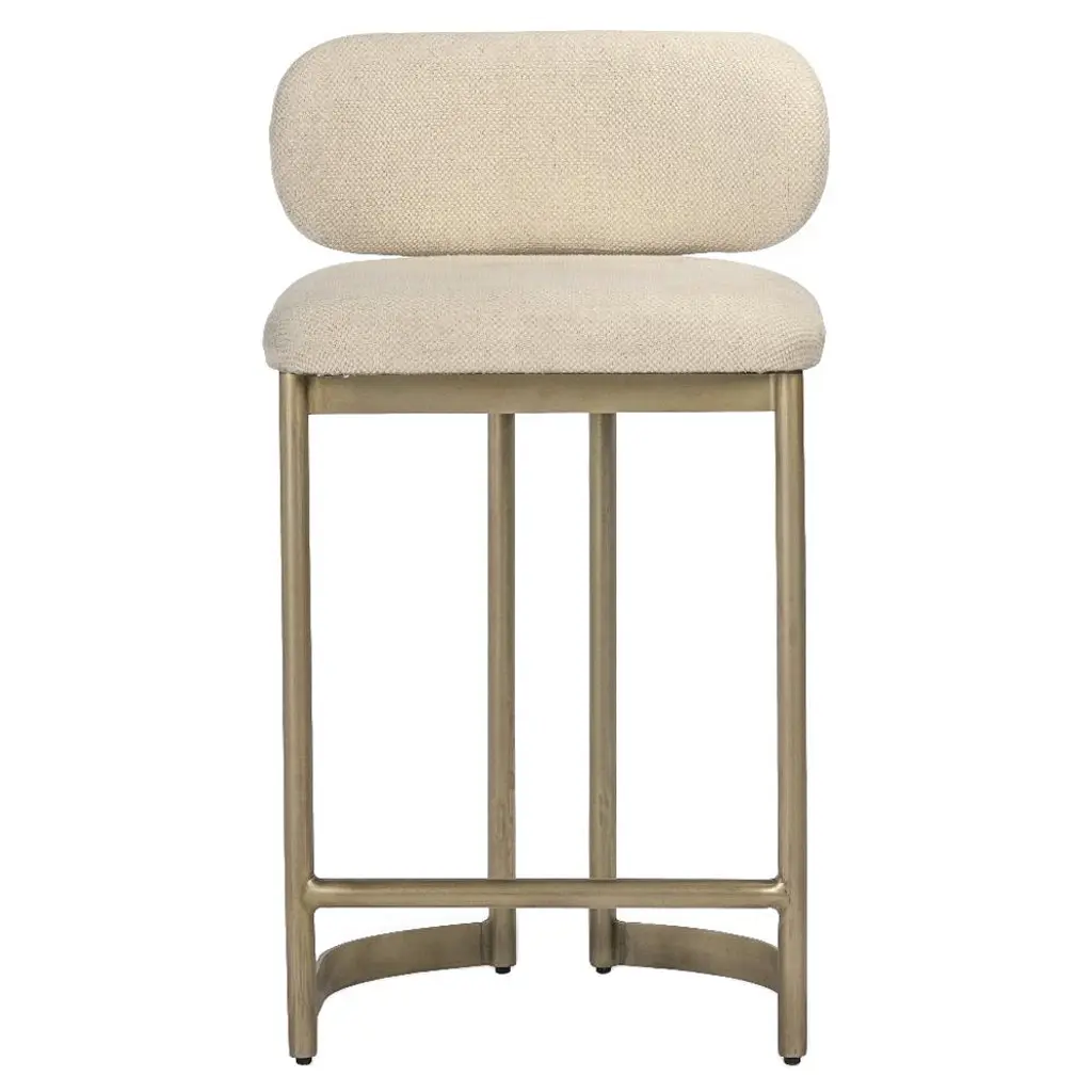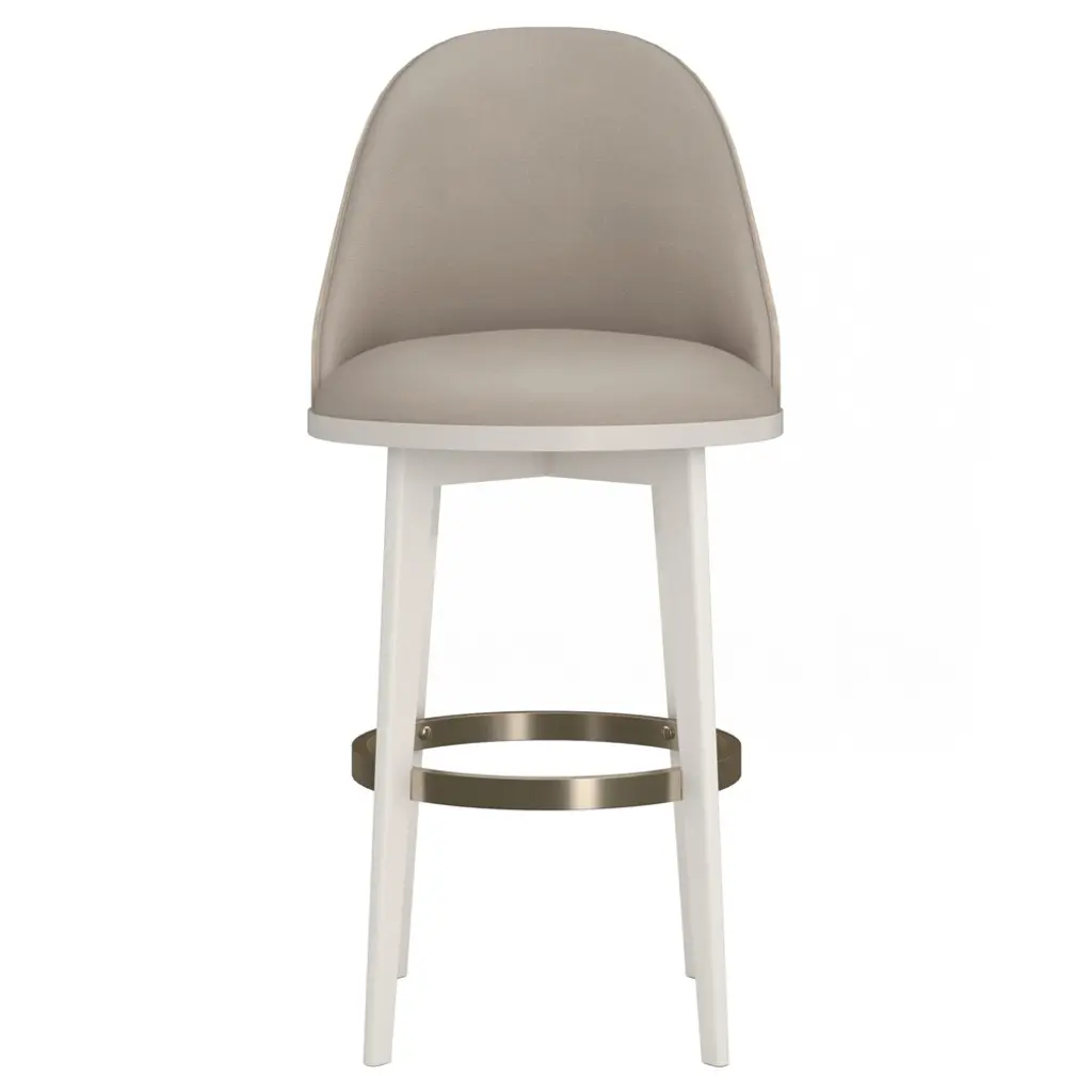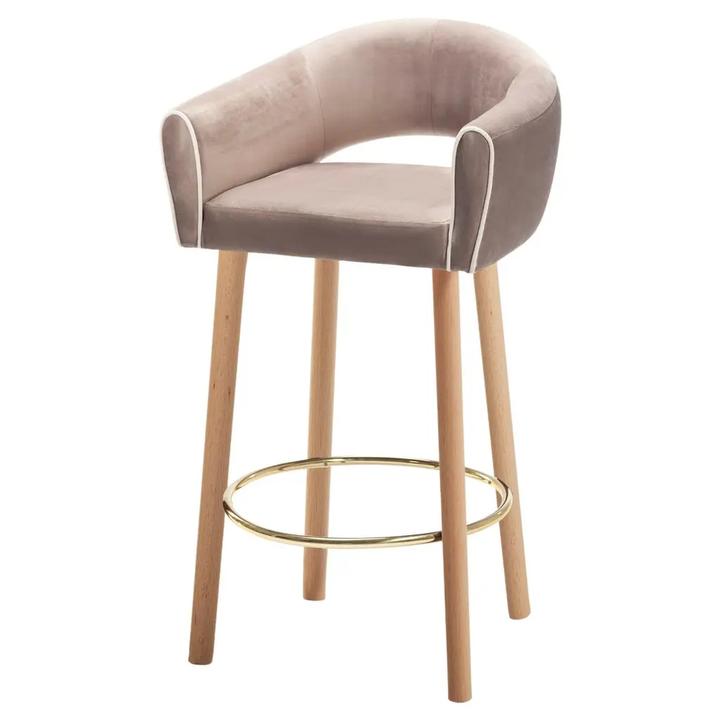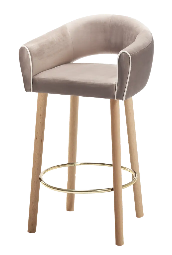 A stool with an external backrest in fabric, and an internal backrest and seat available in either fabric or leather. The stool features metal legs, adding a contemporary and sturdy touch to the design. This piece combines comfort and style, offering a versatile choice of materials for both the backrest and seat to suit different prefeences and interiors.