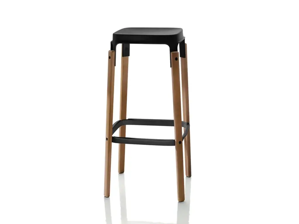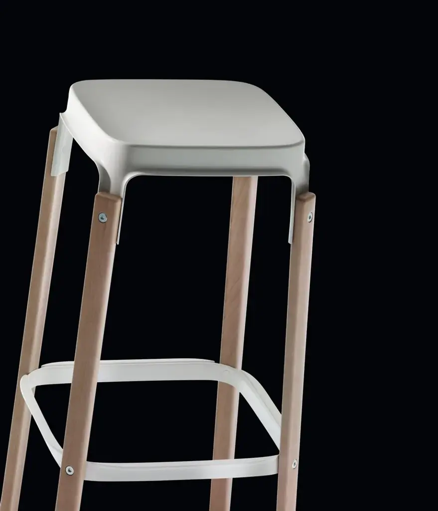 Stools. Material: seat and foot-rest in steel plate painted in epoxy resin. Legs in solid beech, natural or painted.