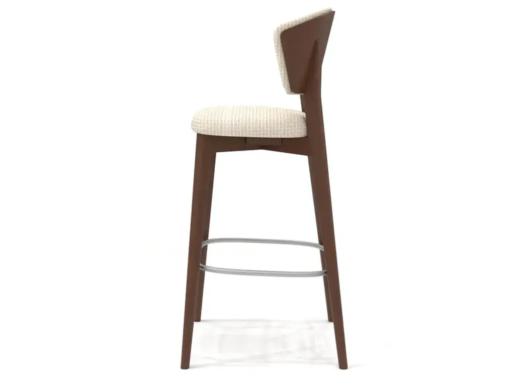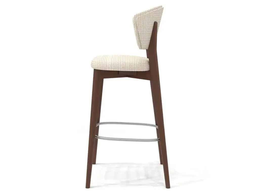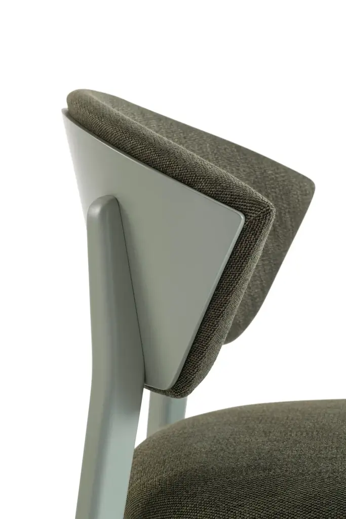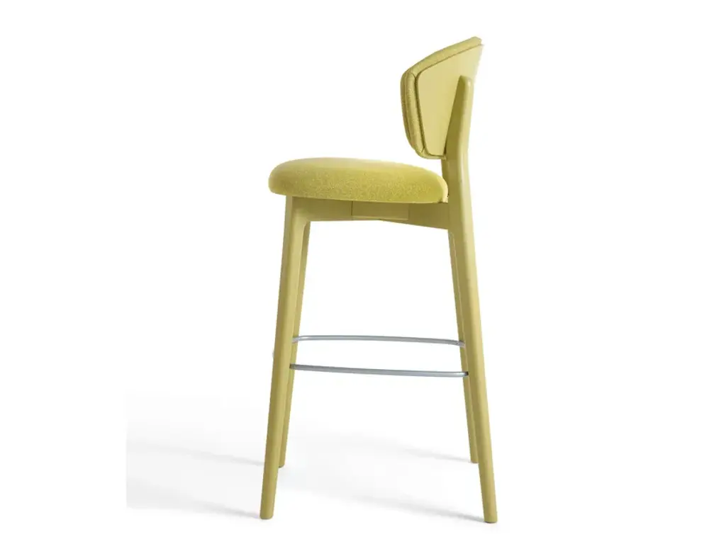 Stella 818 is a high stool with a solid beech wood frame and upholstered seat/backrest. Unlike Stella 819, the back of the backrest is made from the same material as the frame.Stella is a collection featuring a solid and reassuring chair, distinguished by an enveloping backrest that ends with two sharp cuts inspired by the points of a star.In both the chair and the lounge chair and stool, the backrest is available either fully upholstered or with a wooden back to highlight the material.Designed by Matteo Ragni, Stella is intended for contract environments where it blends in discreetly.Comfort is guaranteed by the generous padding of the seat and backrest.