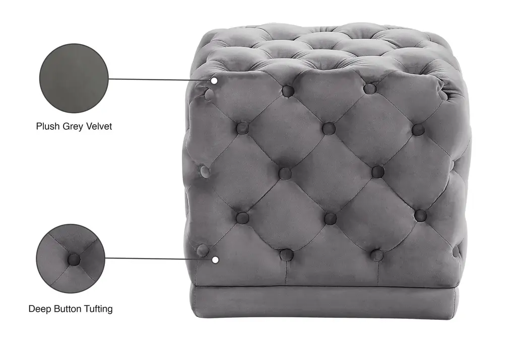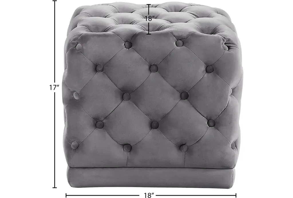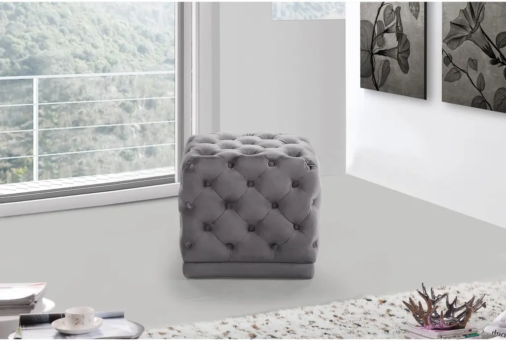 The Stella Grey Velvet Upholstered Ottoman / Stool is a versatile and stylish addition to any living room or bedroom. Its modern design and soft velvet fabric provide a comfortable seating option that complements various interior styles. The tufted embellishments add a touch of sophistication and texture to the overall look.