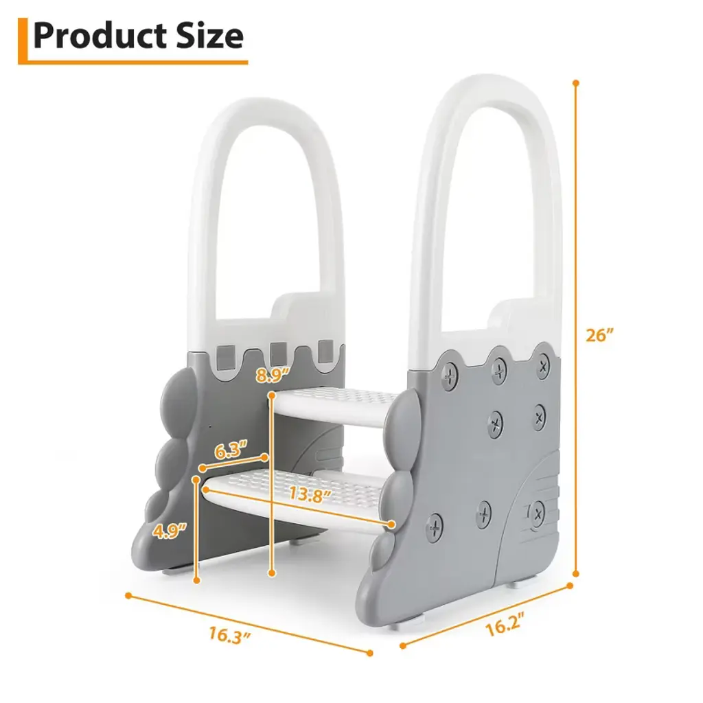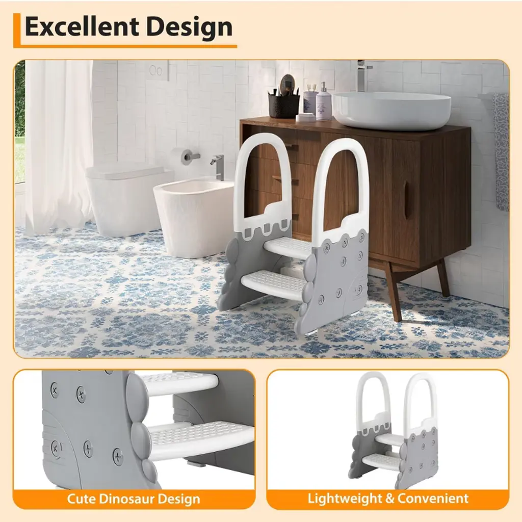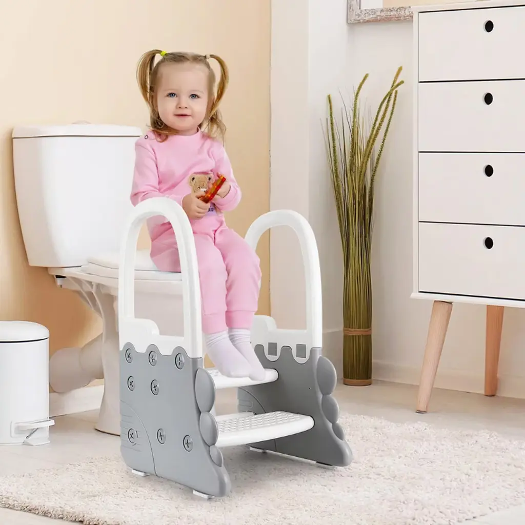 This versatile Step Stool is the perfect helper for your home, designed to provide safe and easy access to sinks, counters, and toilets. Featuring sturdy handrails and two steps, it offers extra stability and support for toddlers and kids, making it ideal for potty training and everyday use. The anti-slip surface ensures safety on any floor, whether in the bathroom, kitchen, or other areas where a little boost is needed.Crafted with durable materials, this step stool is built to last and withstand daily use. Its compact design fits neatly under counters and sinks when not in use, saving space without sacrificing convenience. The dual-step design helps children reach higher surfaces comfortably, encouraging independence and confidence.Key Features:- Sturdy handrail for added safety and balance- Two-step design for easy climbing and reaching- Anti-slip surface to prevent slips and falls- Suitable for bathroom sinks, kitchen counters, toilets, and more- Durable construction for long-lasting use- Lightweight and portable for easy moving and storageWhether you need astool, a bathroom step stool, or a potty training aid, this multi-functional step stool is the perfect solution. It supports your child’s growth and independence while providing peace of mind with its safe, reliable design. Make everyday tasks easier and safer with this essential home accessory.