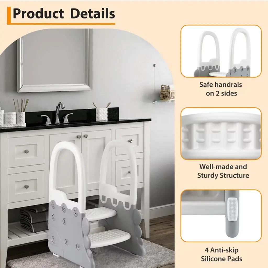 Step Stool For Bathroom Sink, Handles And 2 Step Stools, Potty Training Toilet Stool, Anti-slip Stool For Kitchen Counter, Gray
