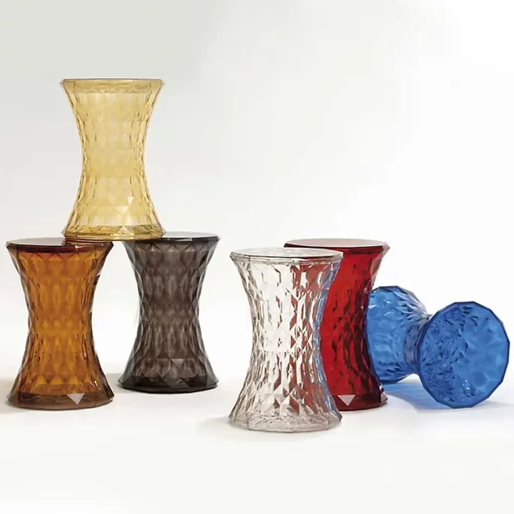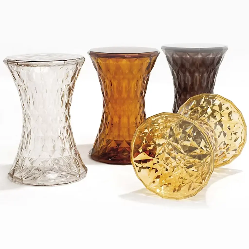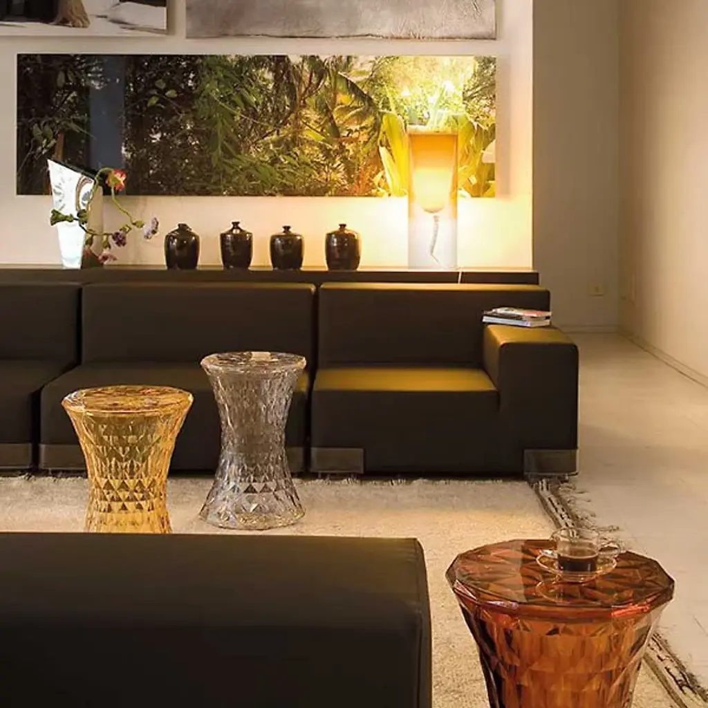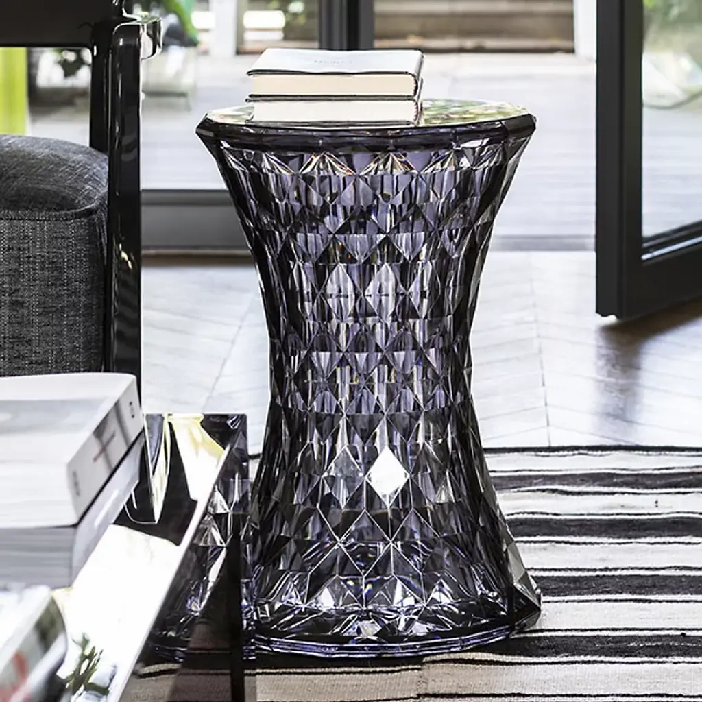 The Kartell Stone Stool designed by Marcel Wanders has a gem-like symmetrical linear shape, reminiscent of an hourglass. Its surface is simply extaordinary: an irregular myriad comprised of geometrical facets which reflect the light and create a striking unique play of colors, much like a diamond. The Stone Stool is made of window-clear polycarbonate, is strong and rigid, scratch and weather resistant, and suitable for indoor and outdoor use. Because of its jewel-like nature, Stone is offered in the colors of the precious stones.