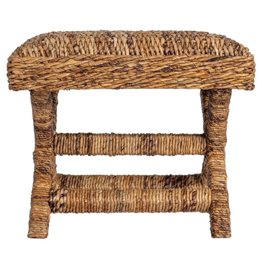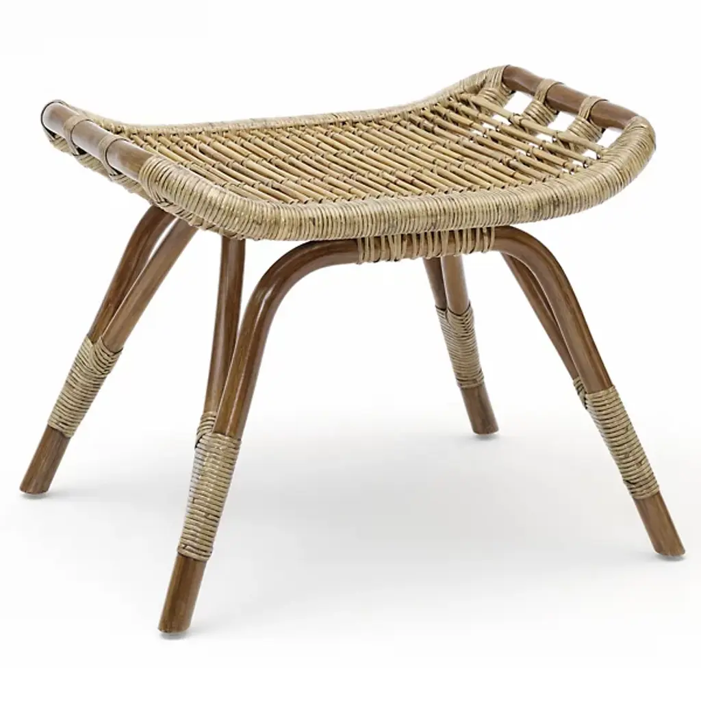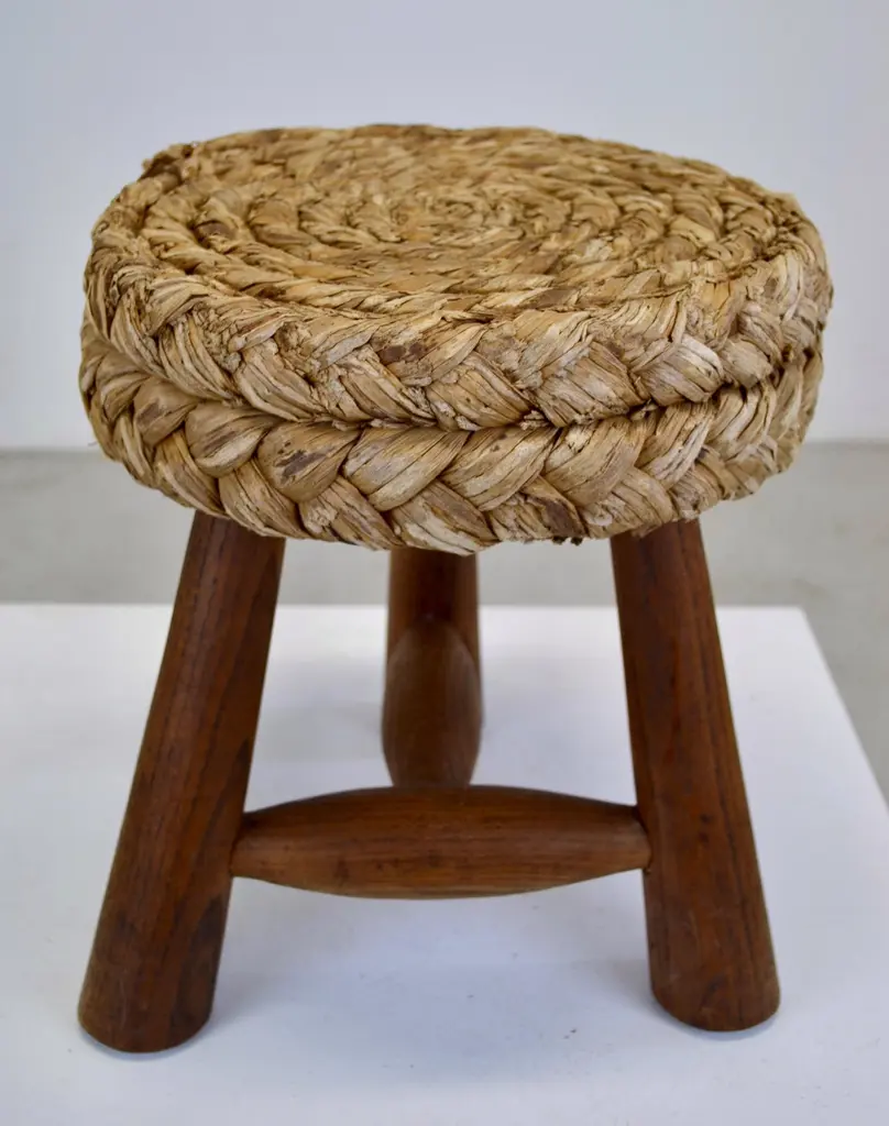 Mid-century French low Shepard's stool designed by Adrien Audoux and Frida Minet. This rustic French pouf showcases a circular seat crafted from woven raffia/rattan, supported by tripod legs and an oak keel base. Maintaining its original condition.