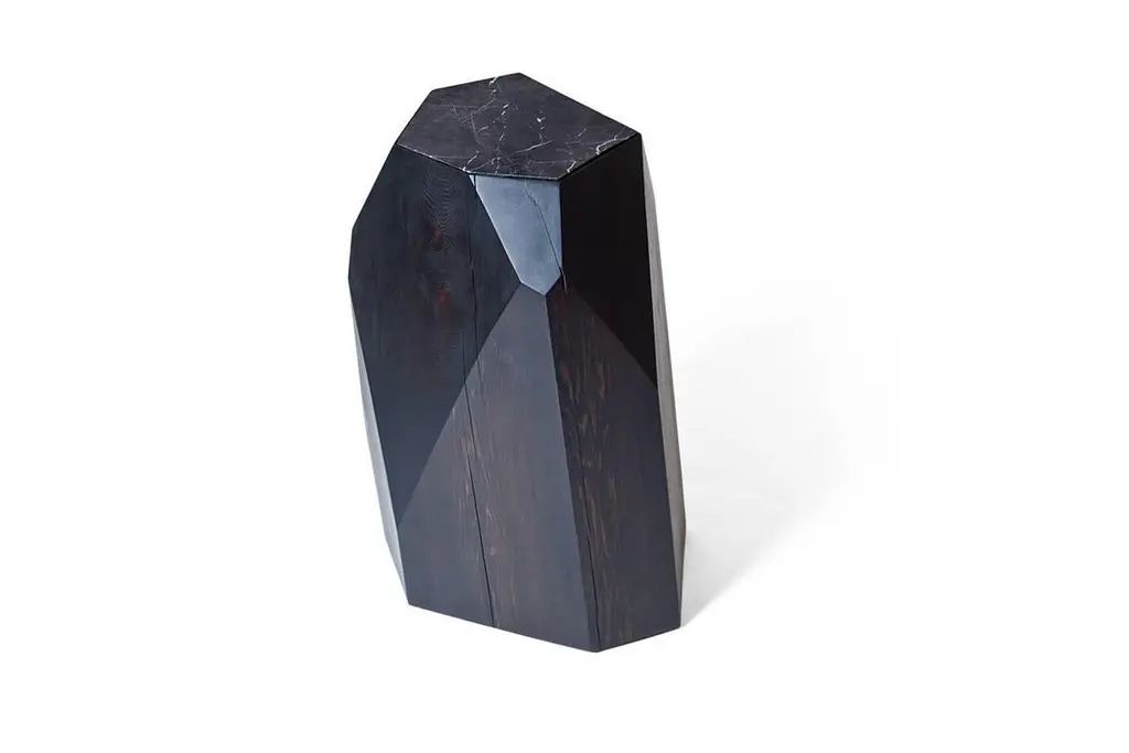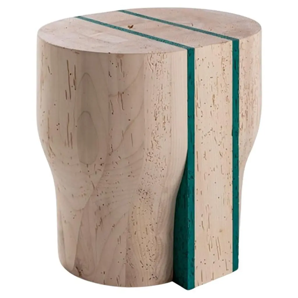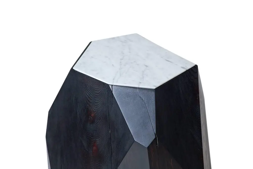 Cast-off cedar logs are given second life as a crystalline form. The natural beauty of reclaimed wood is harnessed in this side table and sculpture piece where nature informs design. Each Little Gem is hand-shaped and faceted based on the different characteristics of the log used, and variations in wood grain. Top surface and finish further ensure that no two are alike. Left to weather outdoors, this piece will acquire a natural silver finish. Stool is sold as an individual piece. There are many options for customization with the Little Gems. Shown in main image is natural oiled Western red cedar. Other wood finishes available are Carbon dyed red cedar ($1075), white-washed ($1075) and salmon dyed yellow cedar ($1075). All pieces are hand oiled and finished with a natural beeswax polish. Top can be a flat surface, like this one, or include an insert (+ $400), which is a 1/2" deep recess allowing various materials to sit flush to the edges. Inserts available are: - Stone - Marble - Glass - Mirror - Plated Metals - Powder Coated Metals (price available upon request) - Other customizations (available on request) All Little Gems are approximately 18-24”w at base, 12-16”w at top x 24”h. Custom Heights are also available for an additional $100. Hinterland designs and manufactures each of their pieces in its Vancouver, Canada workshop and showroom. For other finish options, see Hinterland Design's other 1stDibs listings.