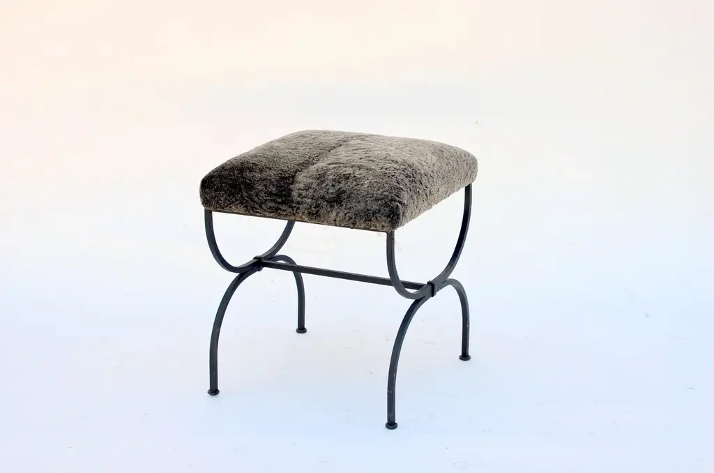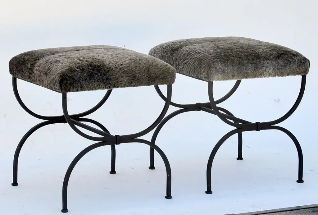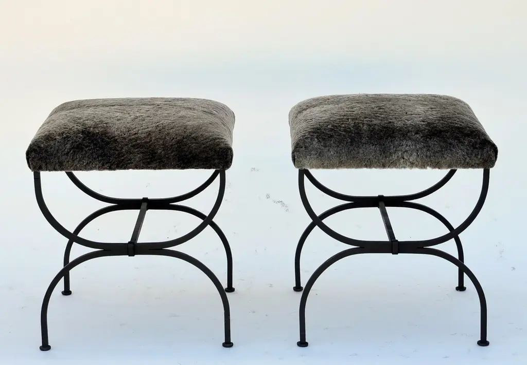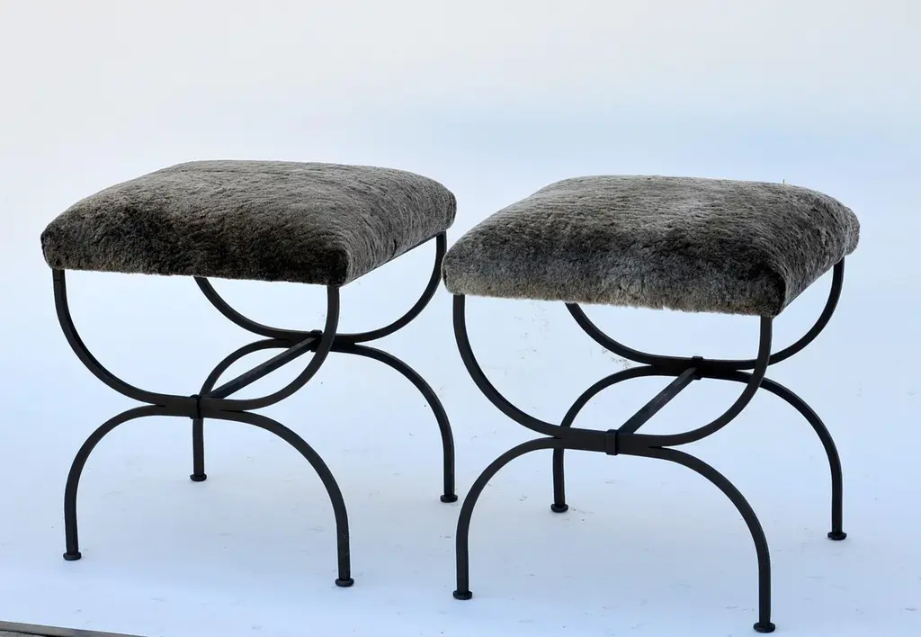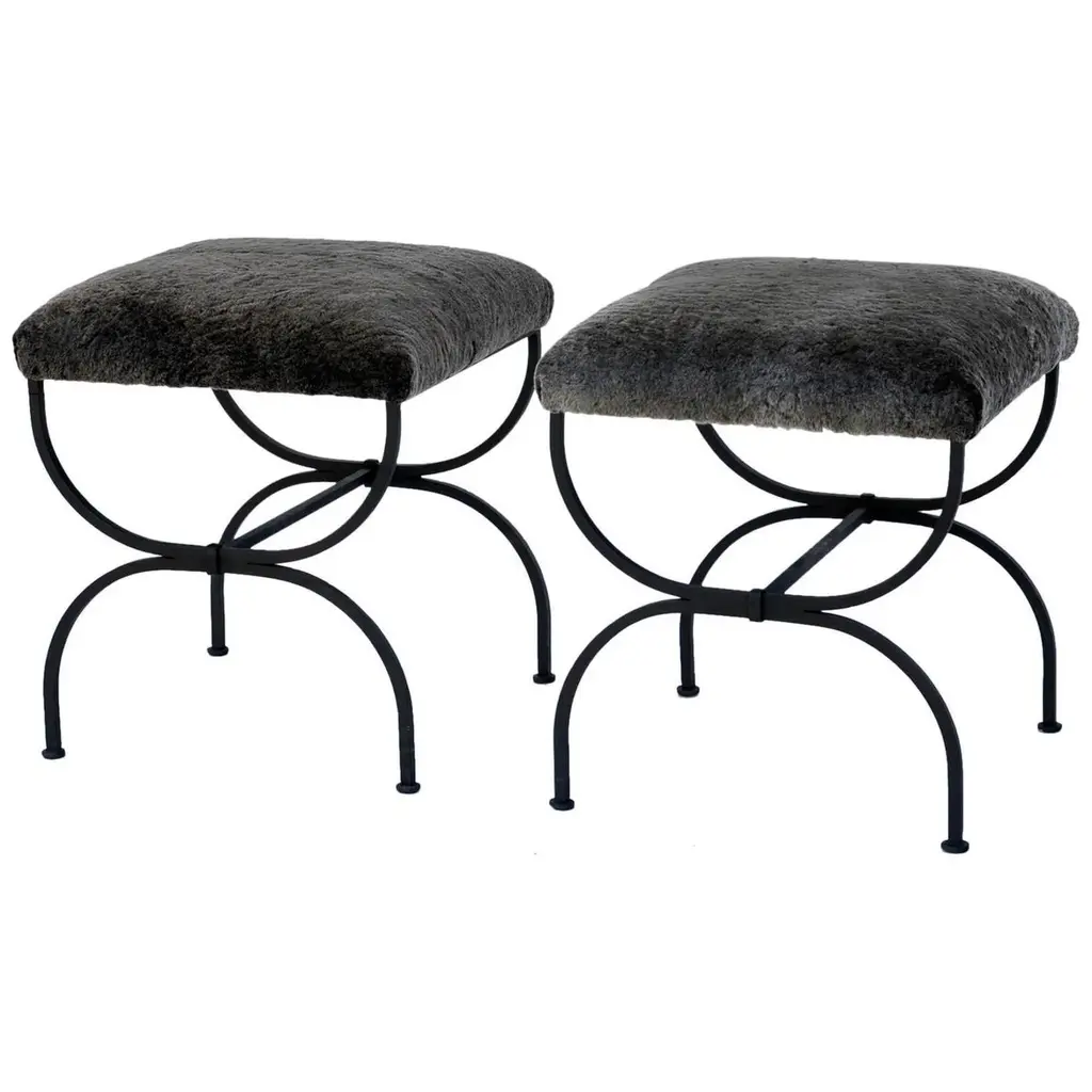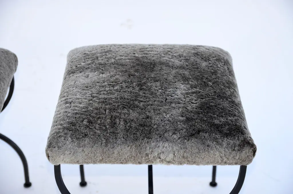 Pair of ‘Strapontin’ wrought iron and fur stools. Also available in C. O. M. (1 yard for both stools) or C. O. L. (2 × 4 sq. feet for both stools).
