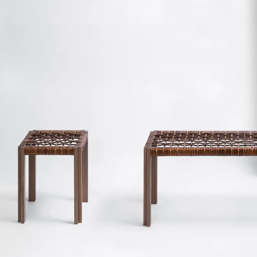 This elegant stool is part of the Structura Collection. Its versatile shape and elegant craftsmanship make it a superb addition to a modern or rustic-chic interior. Available also in black, this piece features a wood structure where the L-shaped legs intersect to support a seat with a criss-cross design fashioned of interlacing leather stripes. The wood has a walnut finish but is also available with a wedge color, please ask the Concierge for details.